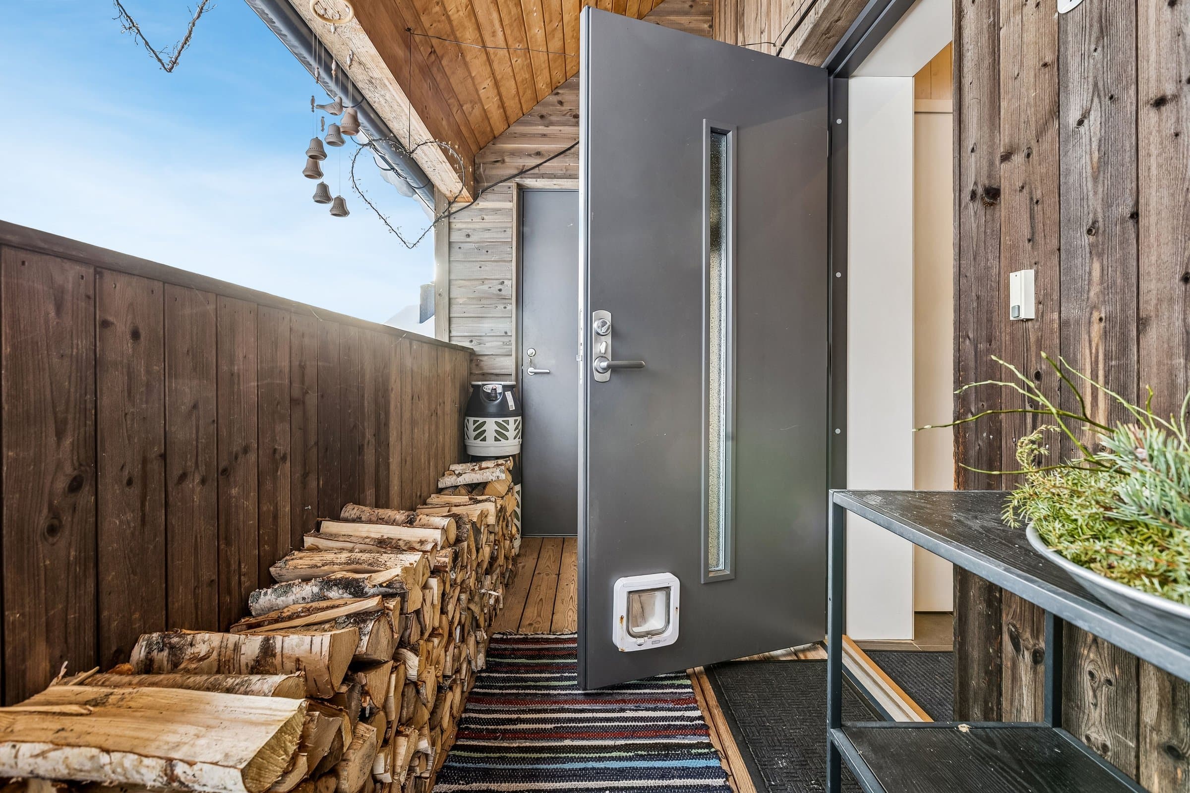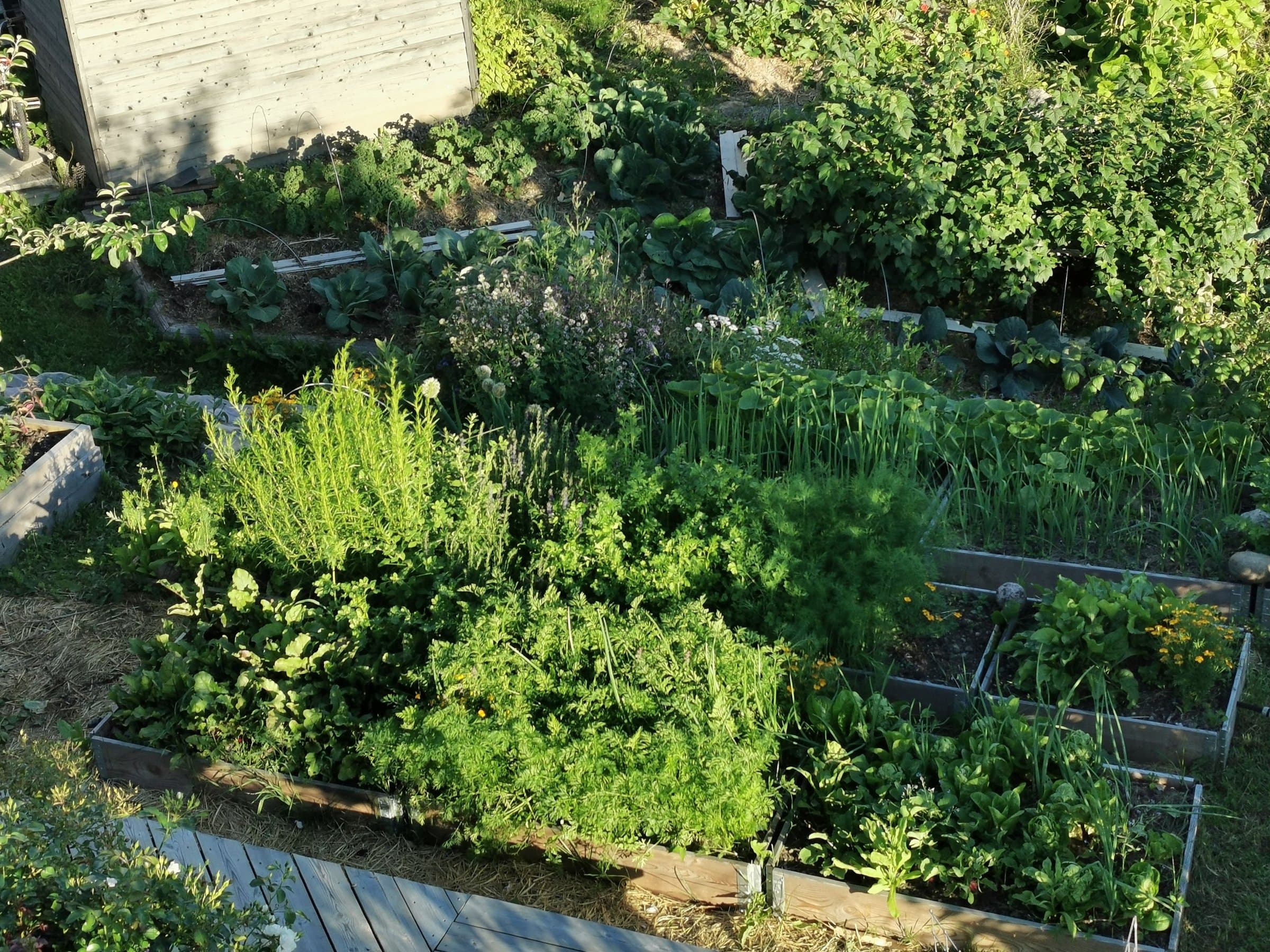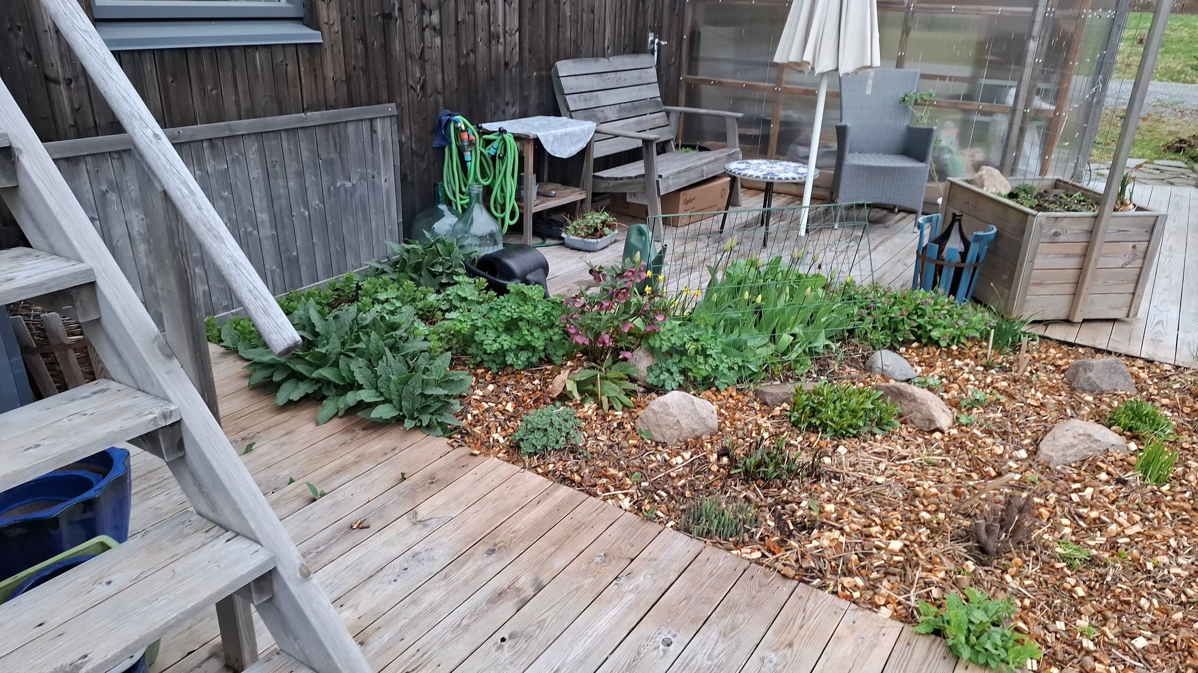 Denne leiligheten er i 2.etg. Det er hyggelige naboer i første og vi deler den 782 kvadratmeter store tomta. Området foran inngangene våre har vi definert som fellesareal, men hver av oss har ansvar for halvparten av plantekassene foran huset. Andre etasje har bruksrett til hele tomta fra husveggen i sør, opp til veien, og til nabotomta. Ved siden av plattingen i hagen er det flere pallekarmer med mulighet for dyrking av urter og grønnsaker. Videre er tomta til andre egt. definert fra leveggen ved trappa opp til verandaen - og helt ned til gjerdet til nabohusene i Nøkkefaret. På den nederst delen av tomta er det også satt opp flere pallekarmer til dyrking i tillegg til at det er bærbusker der nede.