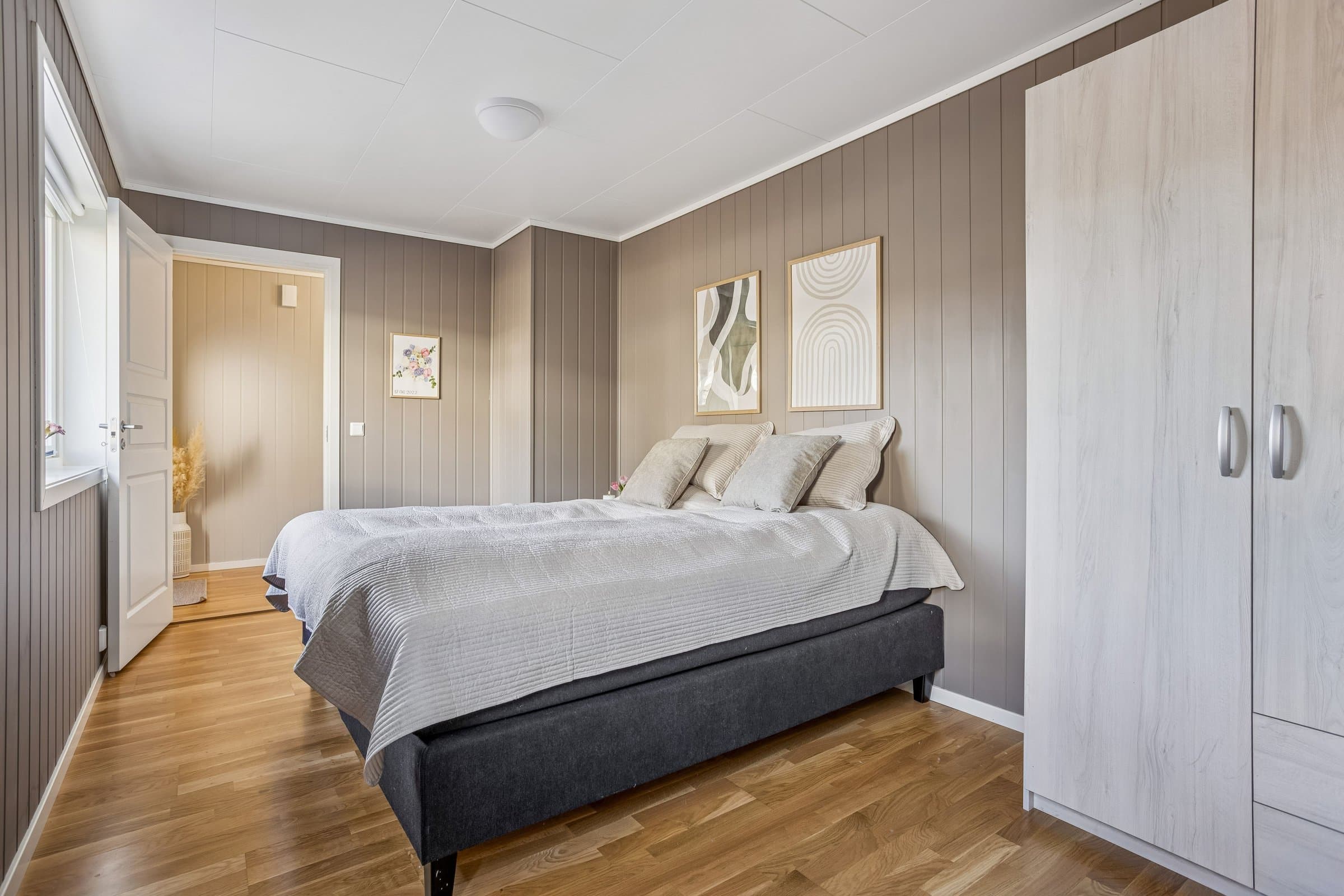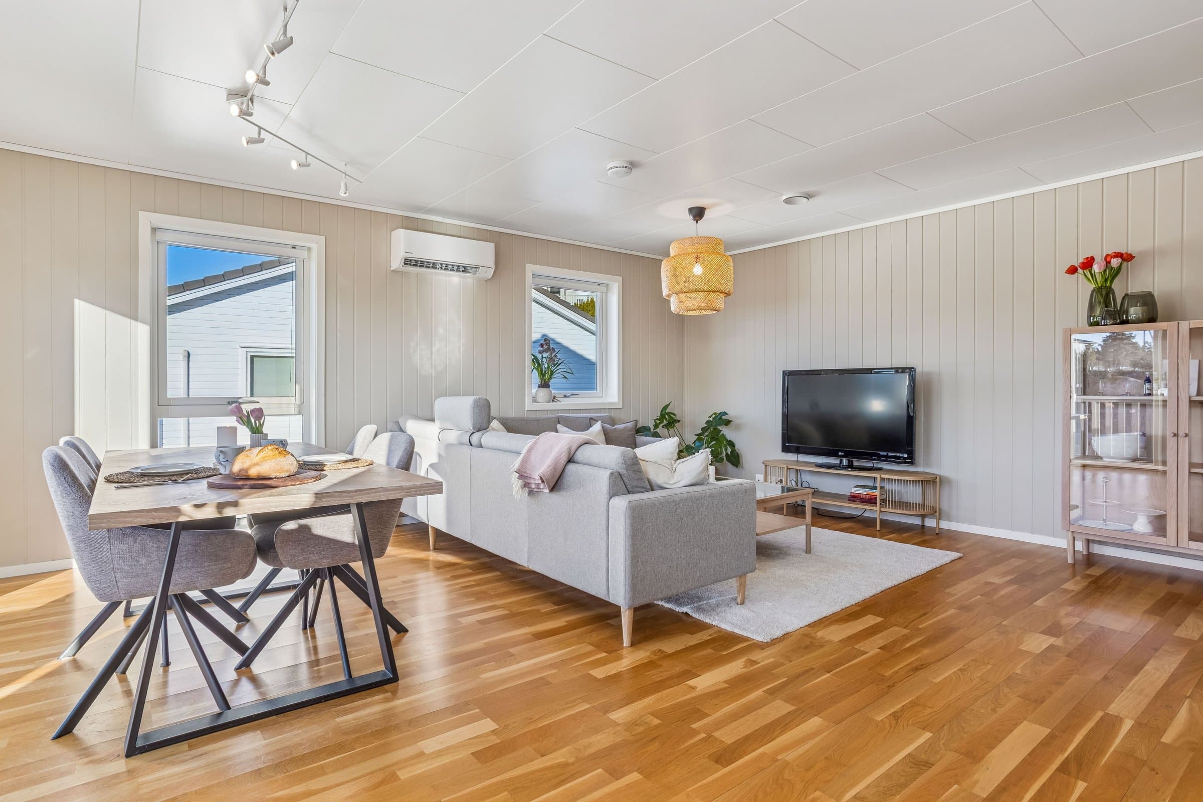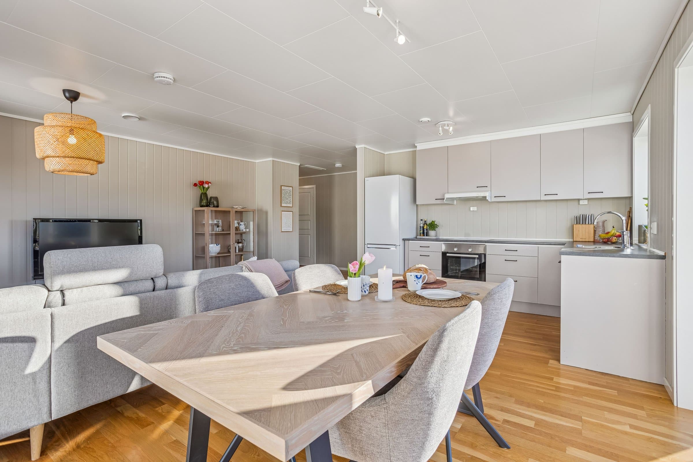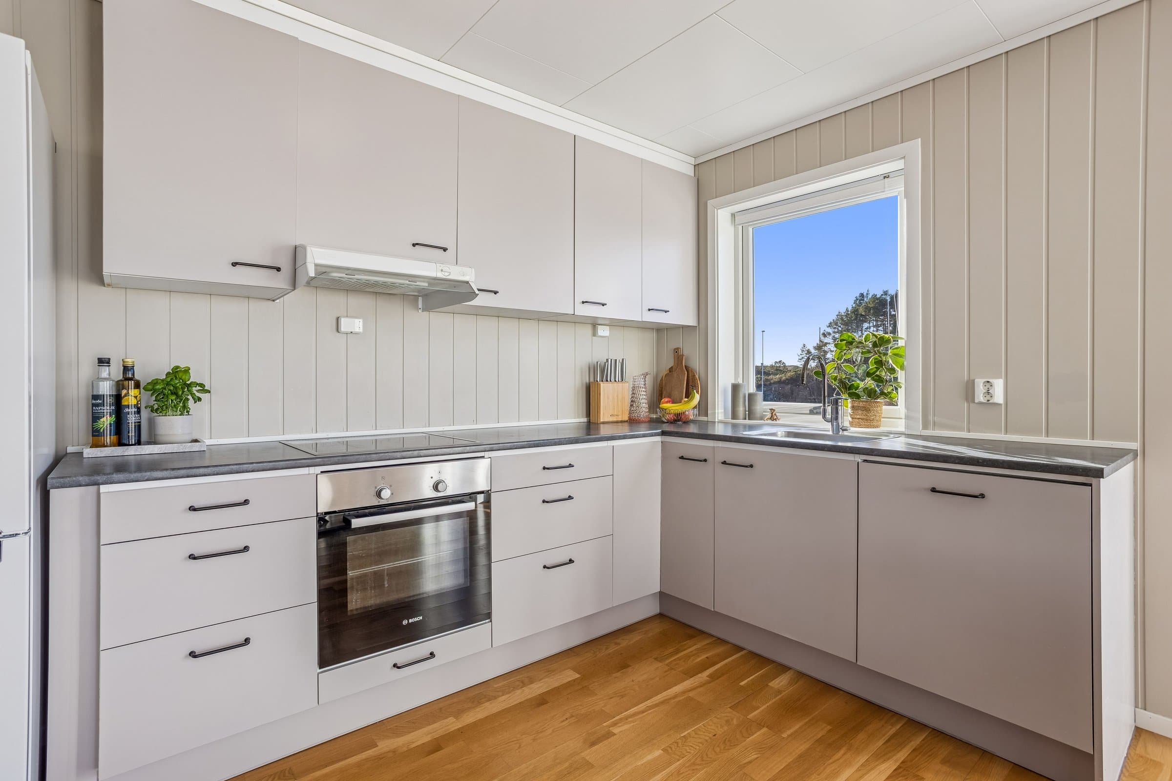 Kjøkken: Kjøkkenet har innredning med grå glatte fronter. Kjøkkenvask i stål. Benkeplaten er av laminat. Det er integrert oppvaskmaskin, komfyr og platetopp. Det er installert komfyrvakt. Det er kjøkkenventilator med avtrekk ut. Baderom: Innredning og garnityr på bad fremstår med: Dusjhjørne med to glassdører, servant med underskap og wc. God plass til videre møblering av bad. Vaskerom: Gulvet er flislagt og veggene har baderomsplater. Opplegg for vaskemaskin og balansert ventilasjon med avtrekksventil i tak. Oppvarming: Varmepumpe fra 2025 og gulvvarme på badet. Overflater: Innvendige gulvflater belagt med henholdsvis: 3-stavs eikeparkett. Innvendige veggflater belagt med henholdsvis: Malte panelplater. Innvendige takflater belagt med henholdsvis: Malte himlingsplater Innvendige dører: Hvite formpressede lettdører. Elektrisk anlegg: Inntak via jordkabel. Sikringsskap inneholder automatsikringer med overspenningsvern. 2/50 A hovedsikringer + 14 kurser. AMS-strømmåler fra 2019 Det er følger ingen TG3 ved denne boligen. For mer informasjon se vedlagte tilstandsrapport avholdt av Einar Johnsen teknisk beskrivelse av eiendommen.