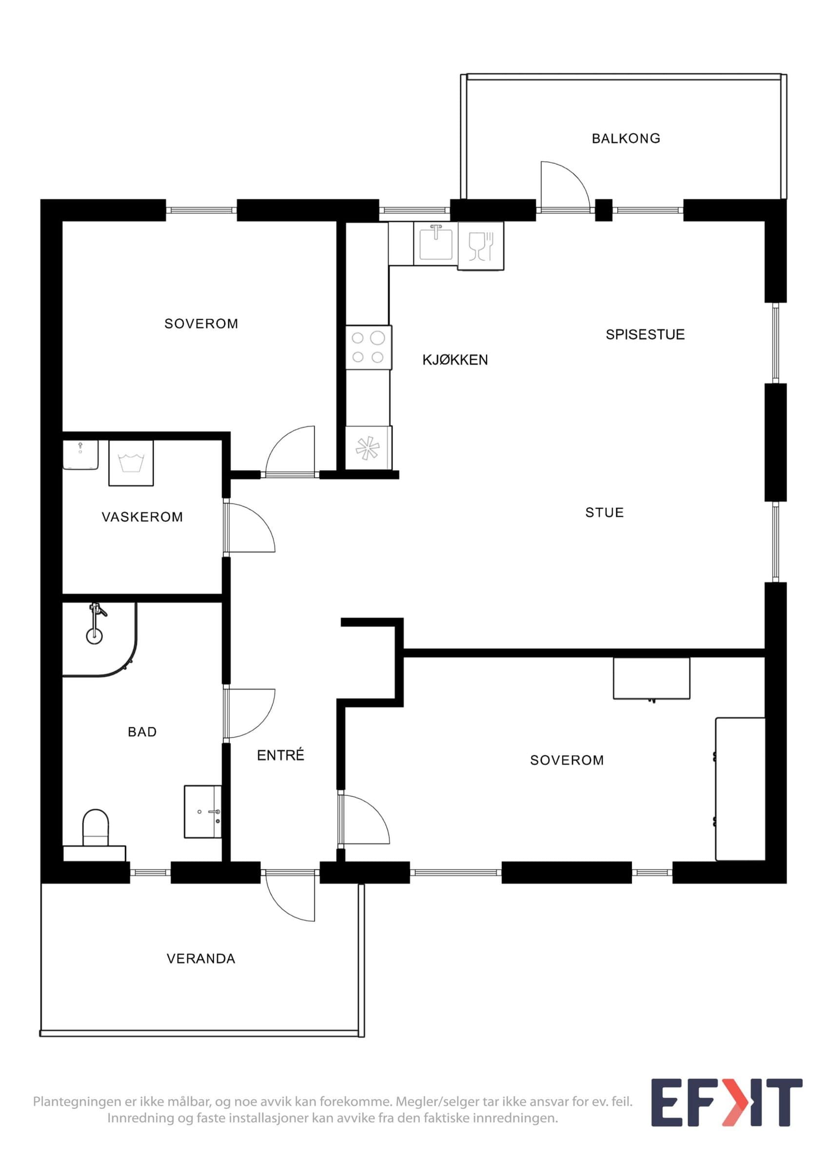 Leiligheten er beliggende i byggets 2. etasje og har en gjennomtenkt planløsning. Den inneholder entré, lys og romslig stue med utgang til balkong, kjøkken i åpen løsning, flislagt bad, flislagt vaskerom, hovedsoverom samt et ekstra soverom som er praktisk plassert ved entréen. Det medfølger en utvendig bod på ca. 5 m². Balkongen er på ca. 7 m² og gir en fin forlengelse av oppholdsrommet.