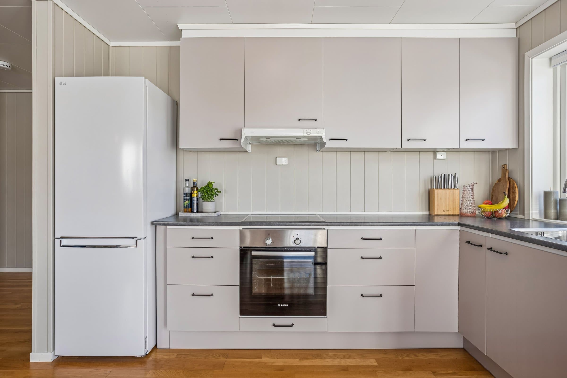 Integrerte hvitevarer som komfyr, oppvaskmaskin og koketopp med induksjon og integrert vifte med utrekk.