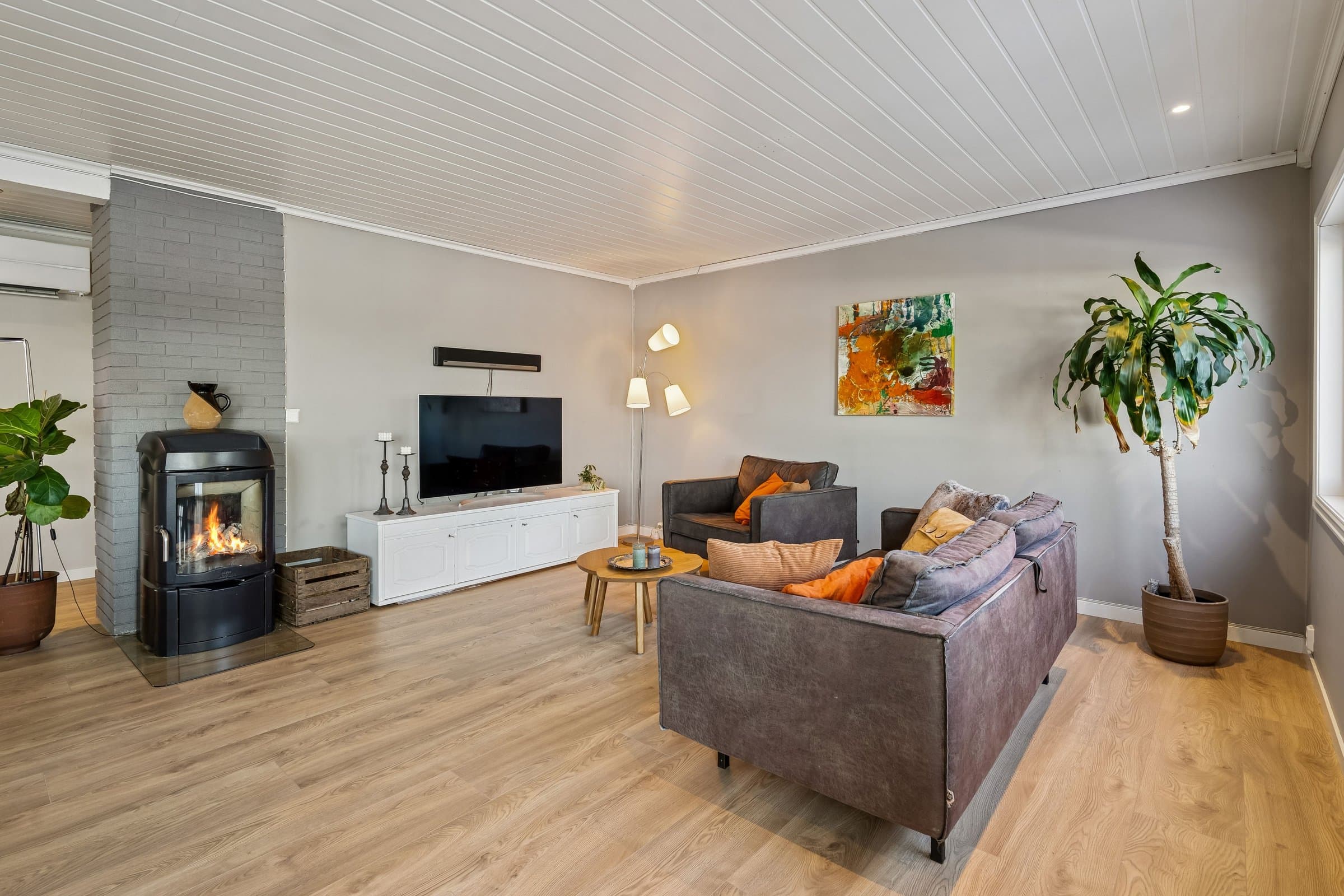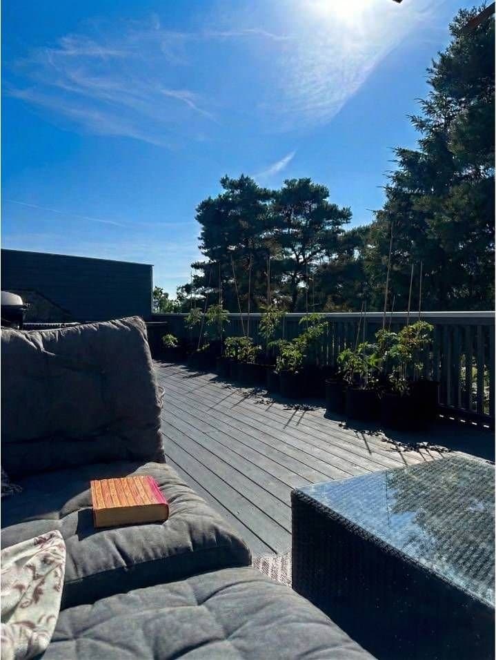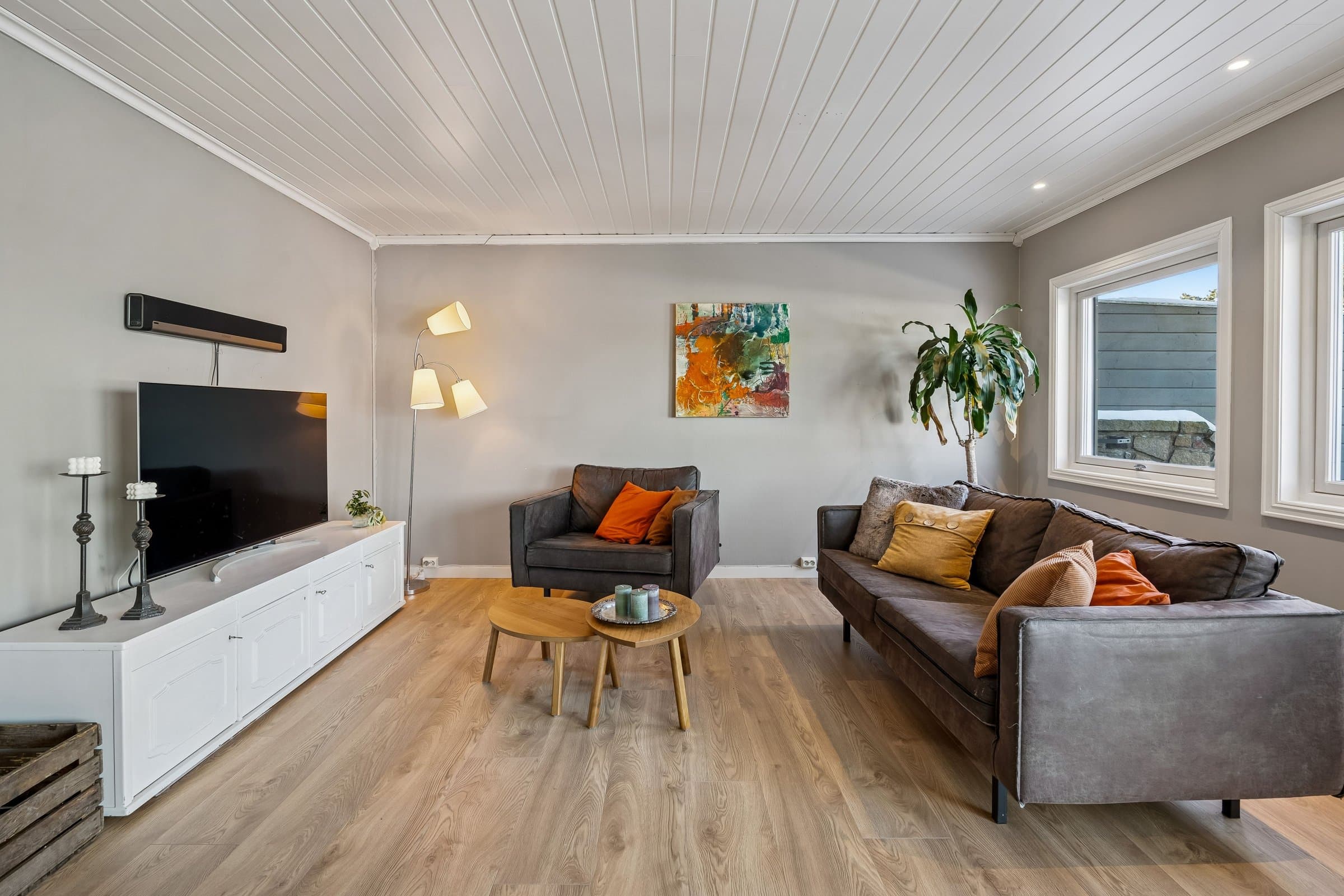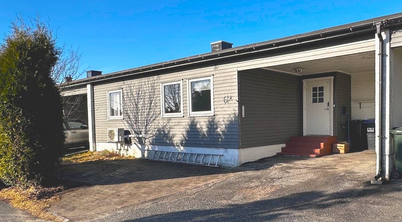Velkommen til Labråten 61A – et lyst og praktisk rekkehus med alt samlet på ett plan. Boligen har en åpen stue- og kjøkkenløsning med store vindusflater som slipper inn godt med dagslys. Fra stuen er det direkte utgang til en skjermet, vestvendt terrasse på ca. 44 m² med gode solforhold og hyggelig utsikt. Videre får du tre soverom, flislagt bad med varmekabler, separat vaskerom og entré med varmekabler. Kjøkkenet har integrerte hvitevarer og ny stekeovn, og oppvarming skjer med varmepumpe fra 2019 og Jøtul peisovn. Carport med Easee elbillader rett ved inngangen.