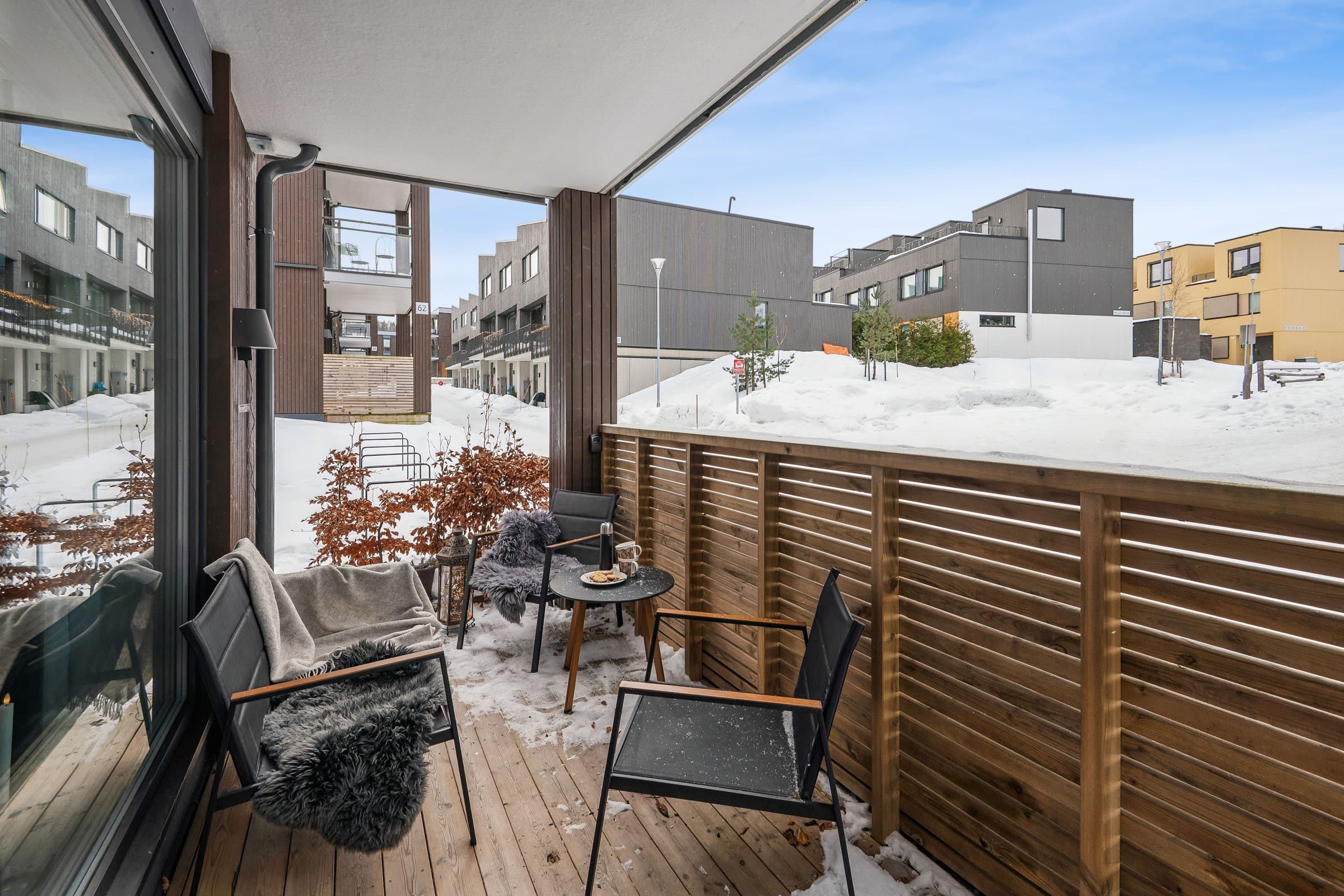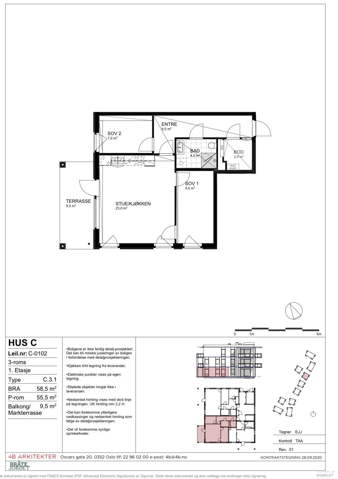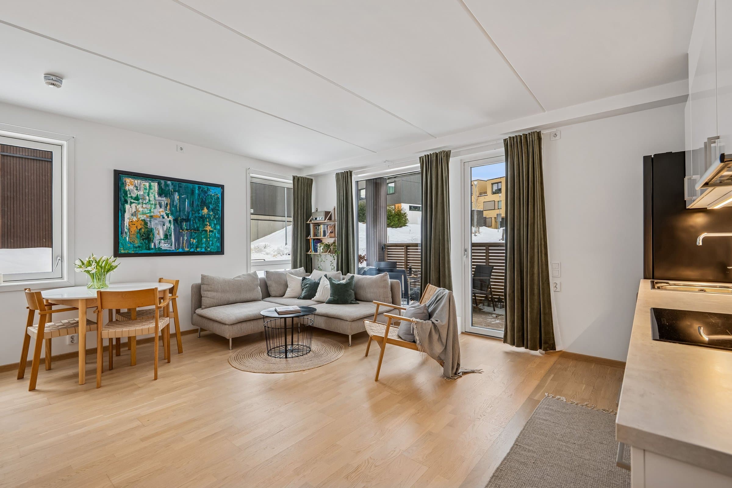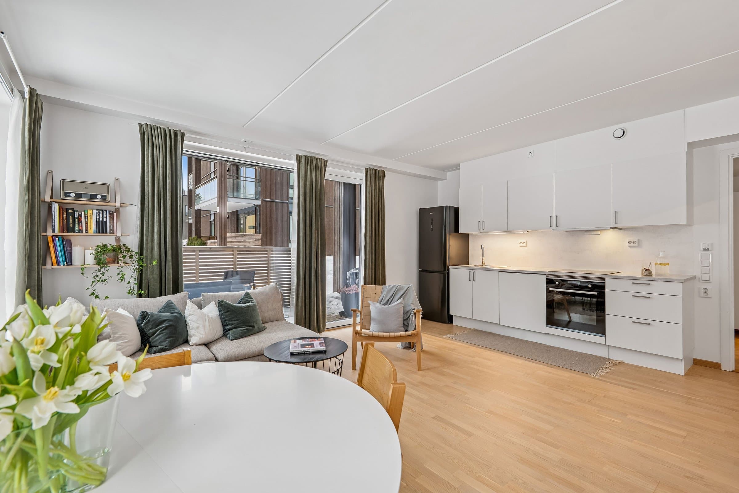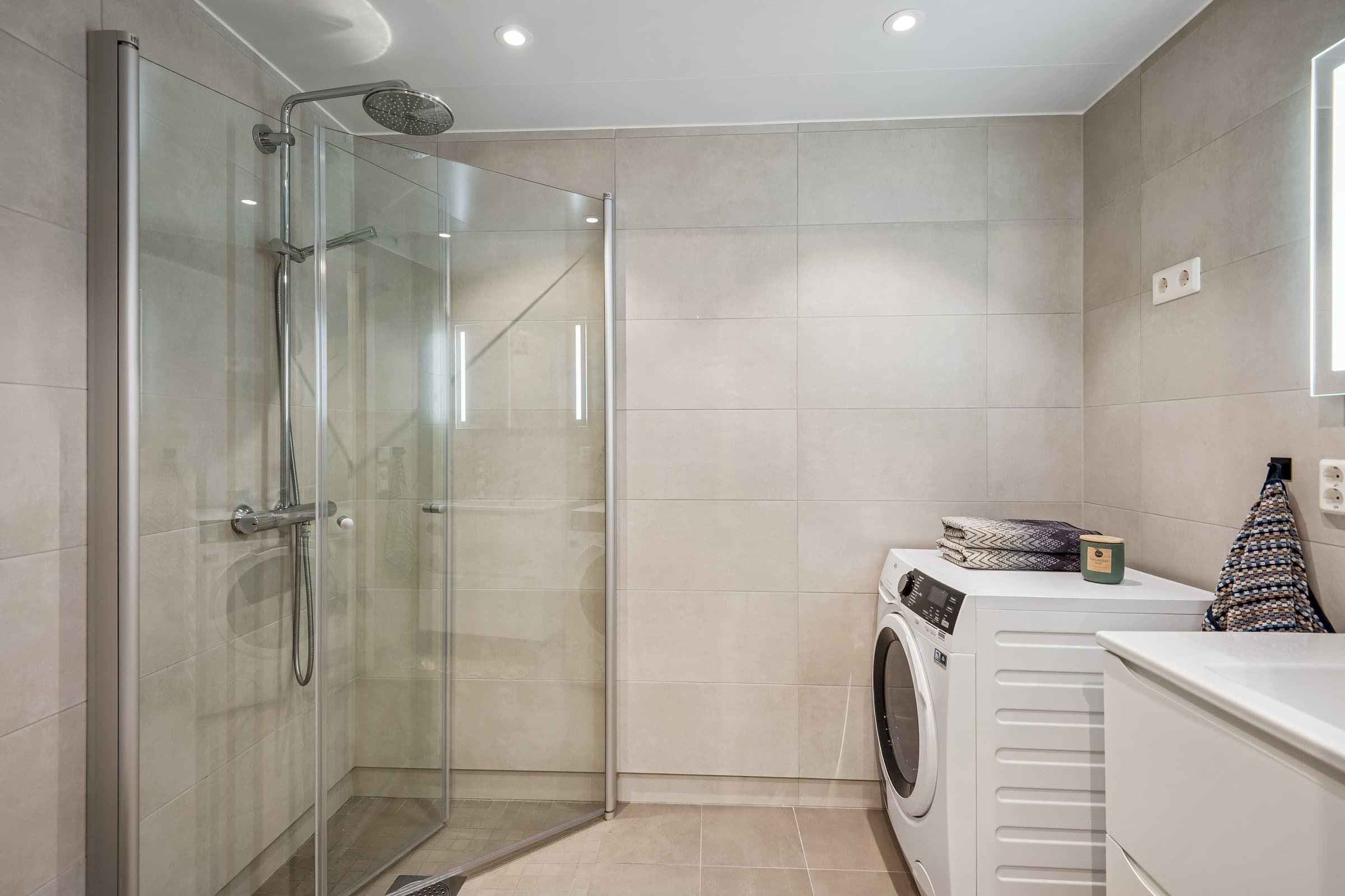 Leiligheten har en åpen og innbydende stue- og kjøkkenløsning med direkte utgang til en trivelig og solrik markterrasse. Her kan du nyte gode lysforhold og sol helt frem til ca. kl. 21.00 på sommerstid. Boligen byr også på praktiske oppbevarings muligheter med en innvendig bod på 2,5 kvm og en sportsbod på 2,5 kvm i garasjeanlegget. I tillegg disponerer bygget egen sykkel- og skibod ved inngangspartiet. Felleskostnadene inkluderer akonto vann og avløp, TV/bredbånd, ordinære felleskostnader, fast gebyr for vann/avløp/avfall samt akonto fjernvarme.