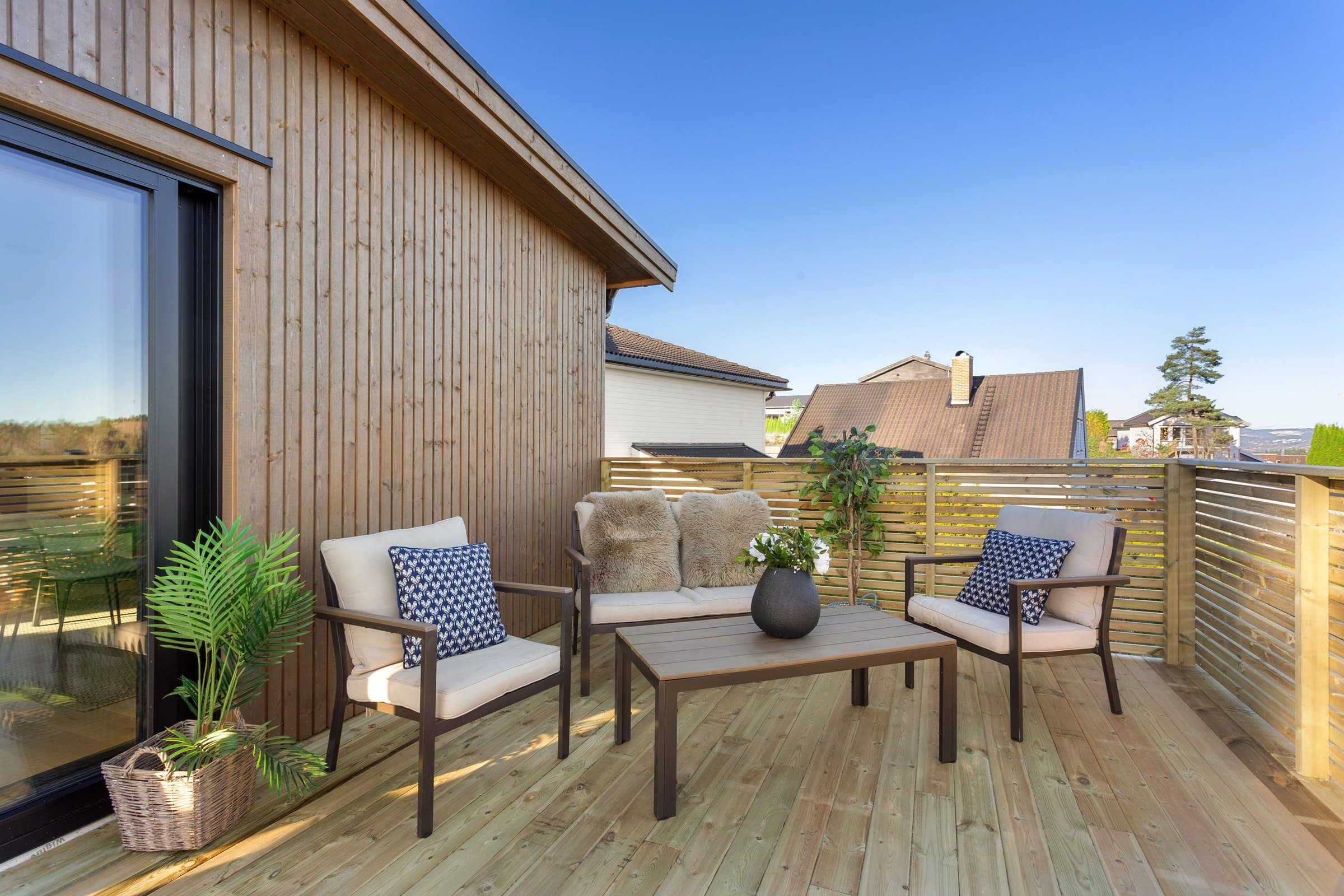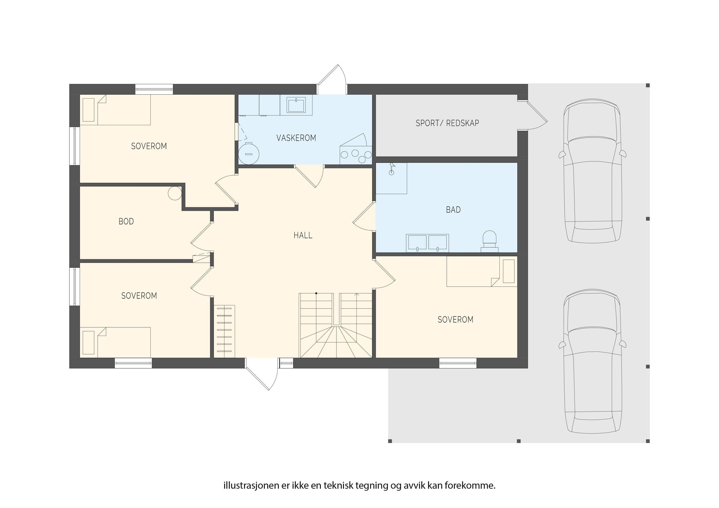 Boligen har en gjennomtenkt og velfungerende planløsning fordelt over to etasjer. 1. etasje – ca. 83 m² Hall 3 soverom Flislagt bad Vaskerom Bod Denne etasjen fungerer som en naturlig barneavdeling med praktiske løsninger for en aktiv familiehverdag. 2. etasje – ca. 89 m² Stue med åpen kjøkkenløsning Separat WC Hovedsoverom med tilhørende walk-in closet og flislagt bad Fra stuen er det utgang til en stor terrasse på ca. 43,9 m², perfekt for sosiale sammenkomster og hyggelige sommerkvelder. I tillegg disponerer boligen: Sportsbod med utvendig adkomst Carport med to biloppstillingsplasser