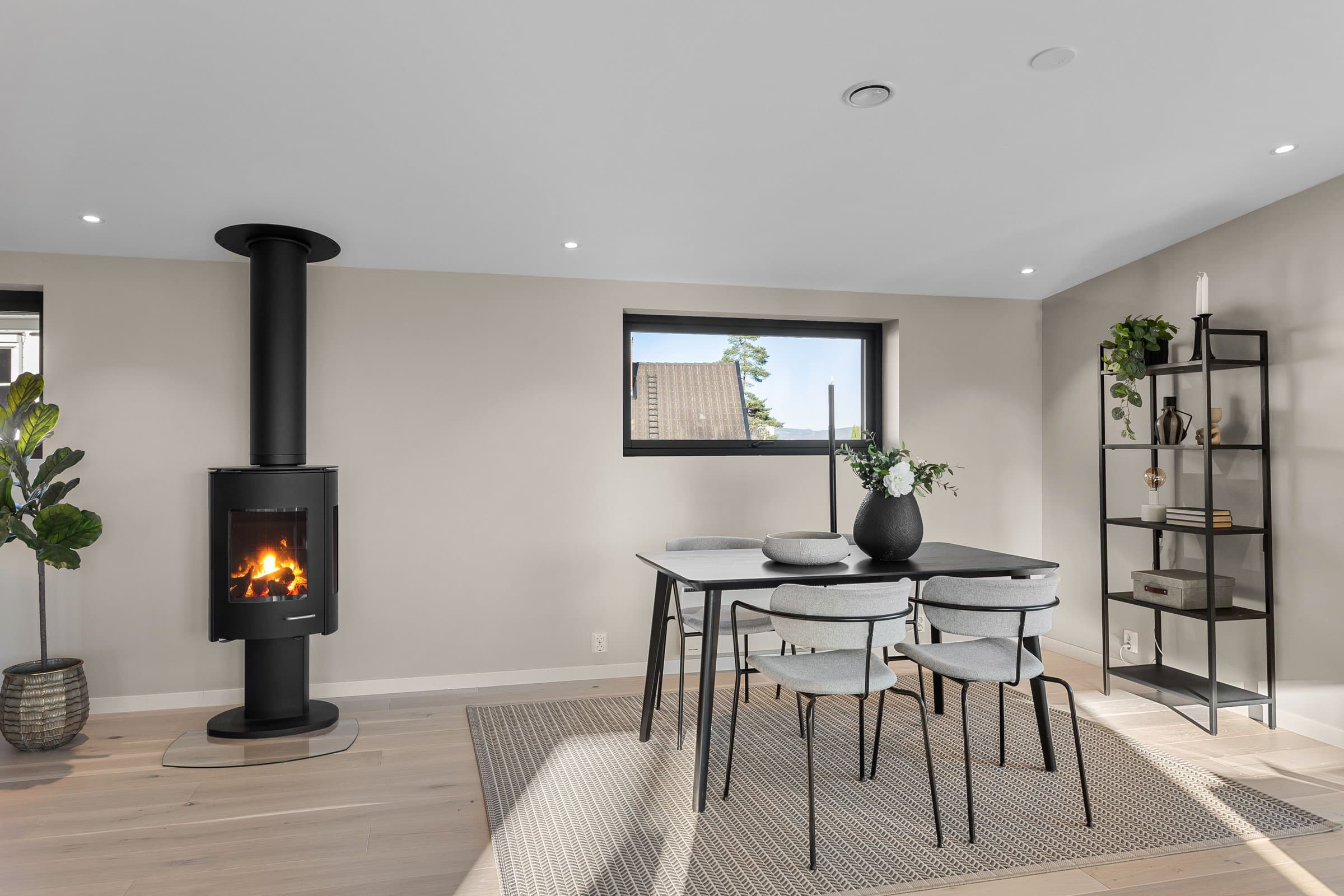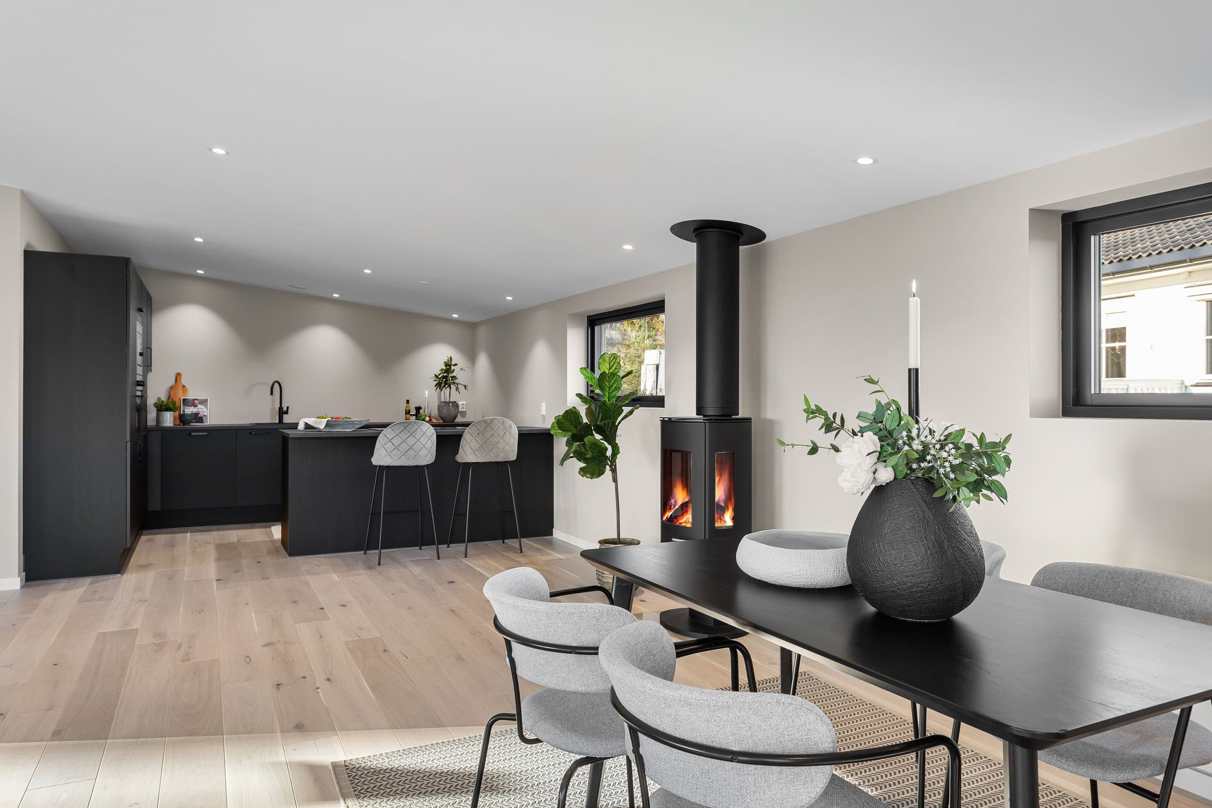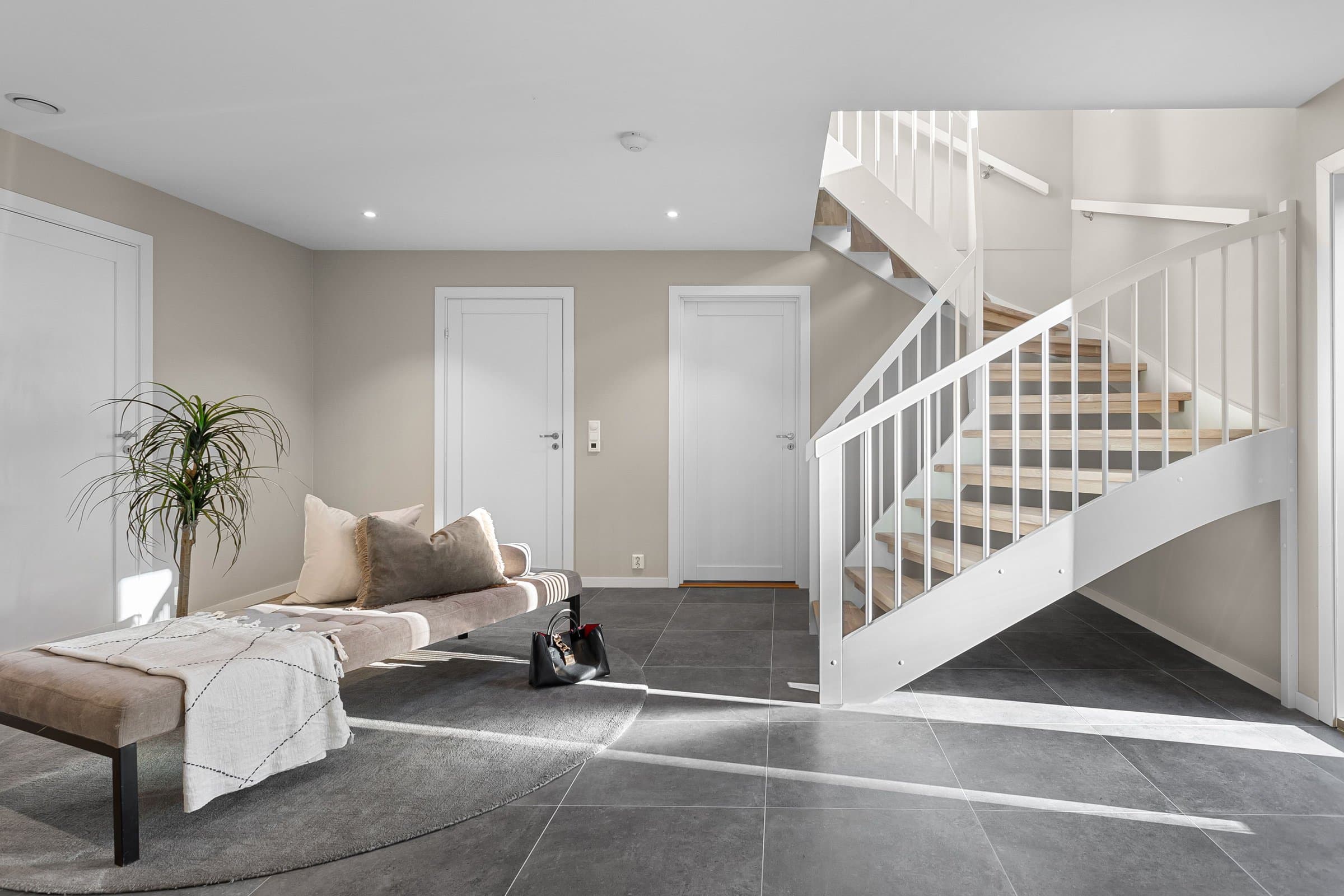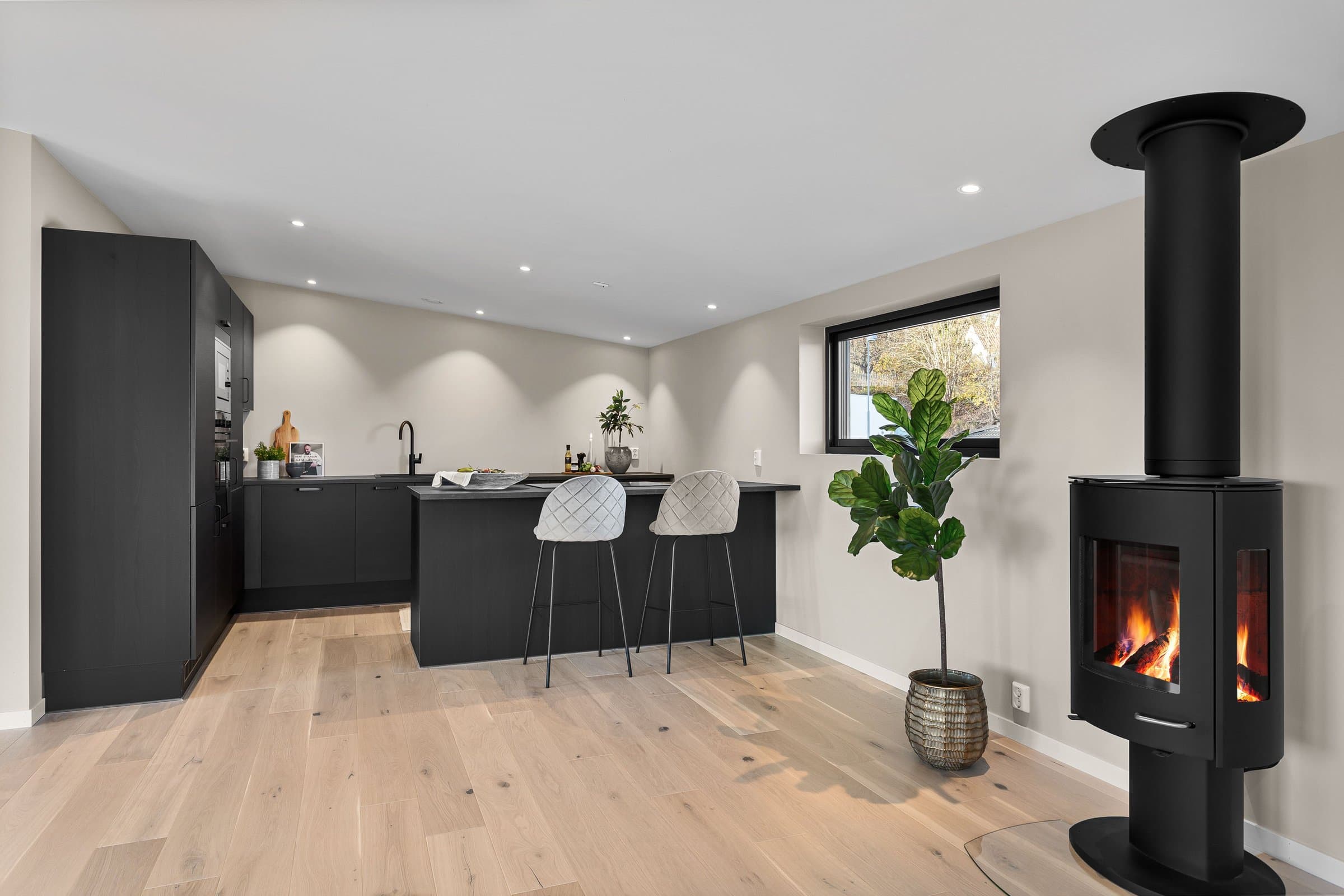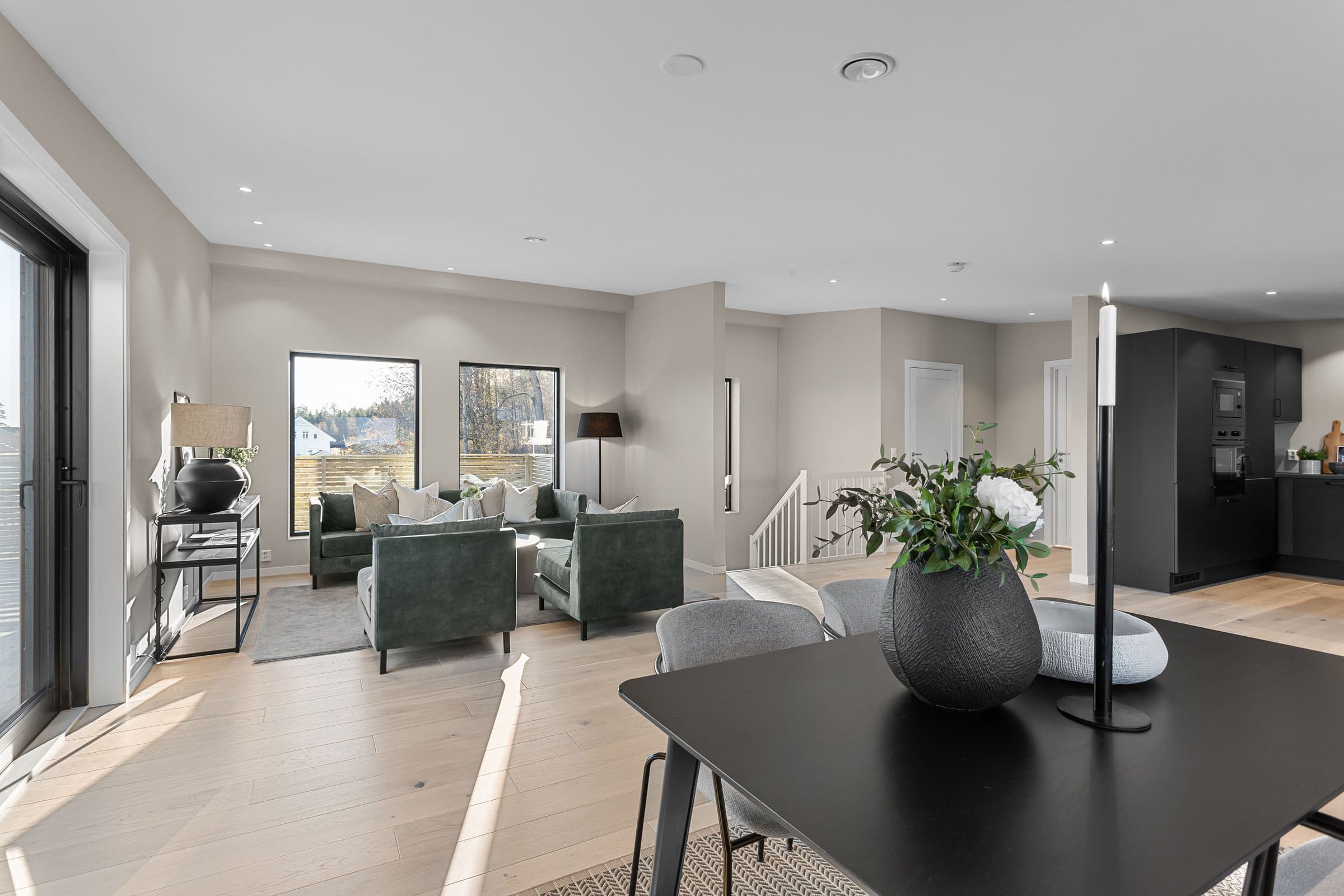 Innvendige overflater har moderne og gjennomført utførelse. Vegger og tak er gipset, sparklet og malt i lyse farger med listfri utførelse. På gulv i oppholdsrom og soverom er det lagt lys 14 mm 1-stavs eikeparkett (Barlinek). I gang er det lagt 60x60 cm lys grå flis. Vaskerom og sportsbod har 30x30 cm grå flis. Vegger er malt i lys, moderne farge (Lady Pure Color Hvit Lin). Tak er malt hvite. Det er downlights i entré, bad og stue/kjøkken. Kjøkken Kjøkken fra JKE Design, modell Nordic Silk Ask sort matt, med helintegrerte hvitevarer og integrert ventilator i koketopp (downdraft). Bad Boligen har to bad samt separat WC og vaskerom/teknisk rom. Badene er delikat flislagt og utstyrt med varmekabler, downlights, vegghengt toalett og moderne baderomsinnredning. Dette er en moderne og gjennomført enebolig med attraktiv beliggenhet, gode uteområder og en fleksibel planløsning som passer for ulike livsfaser og behov. En bolig som kombinerer komfort, kvalitet og beliggenhet – klar for nye eiere. Velkommen til visning!