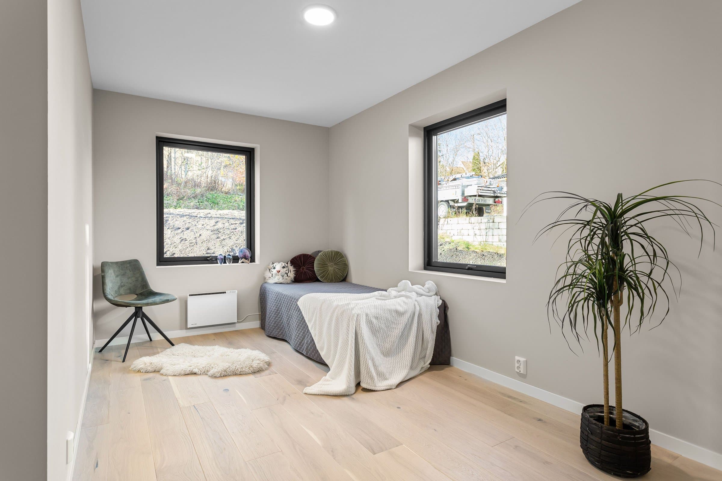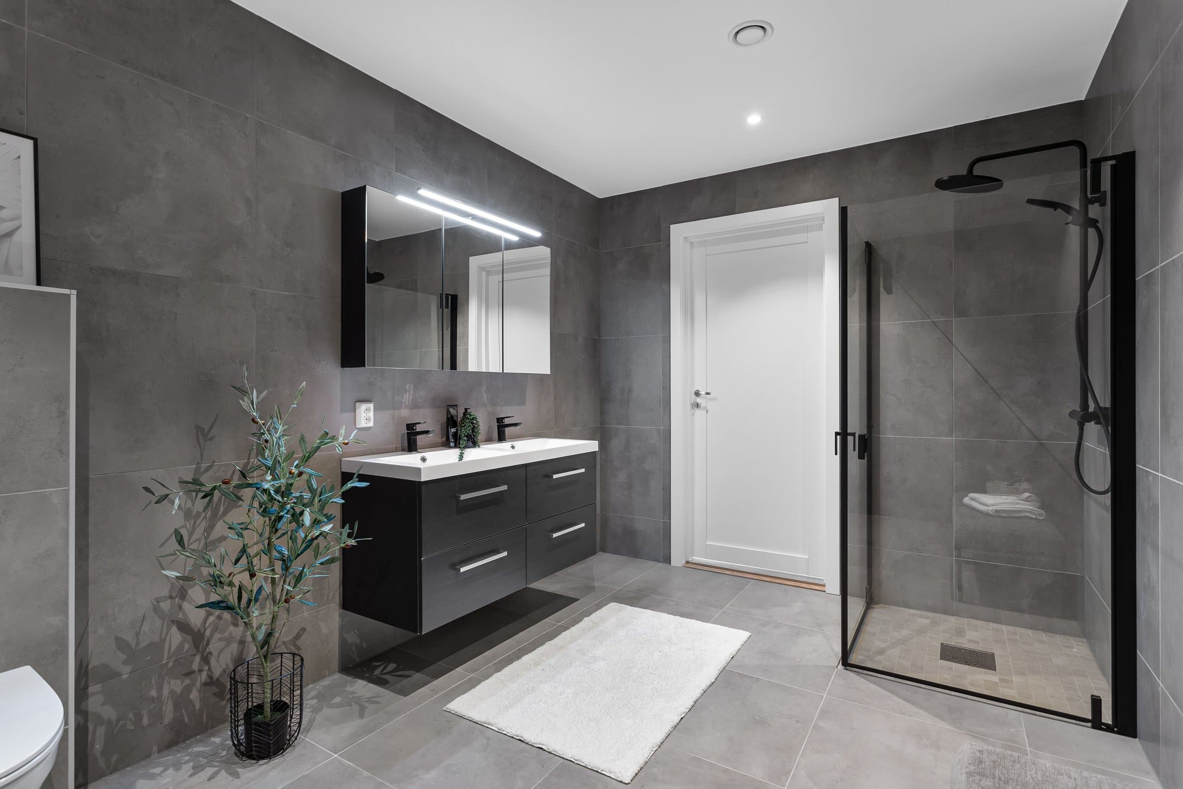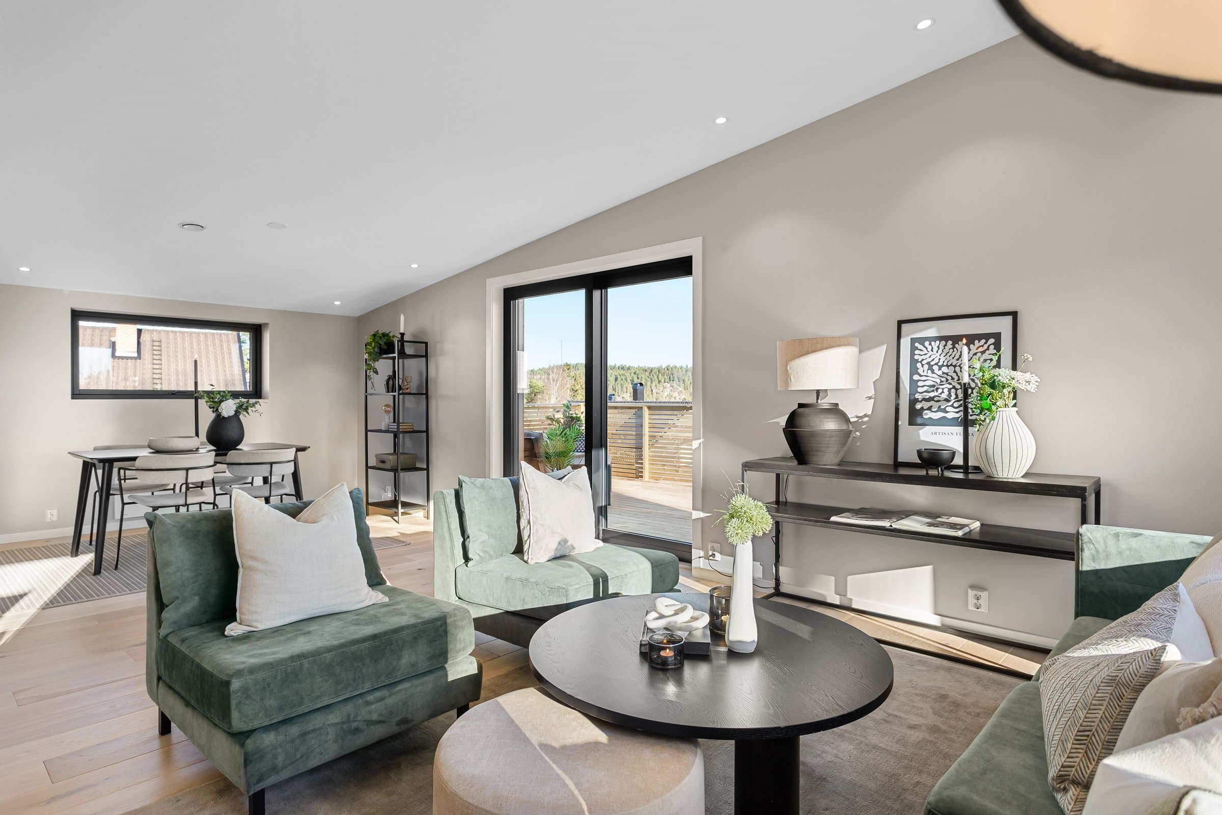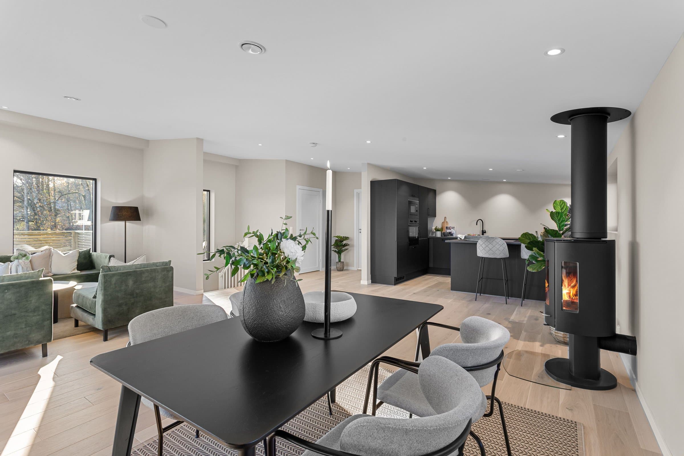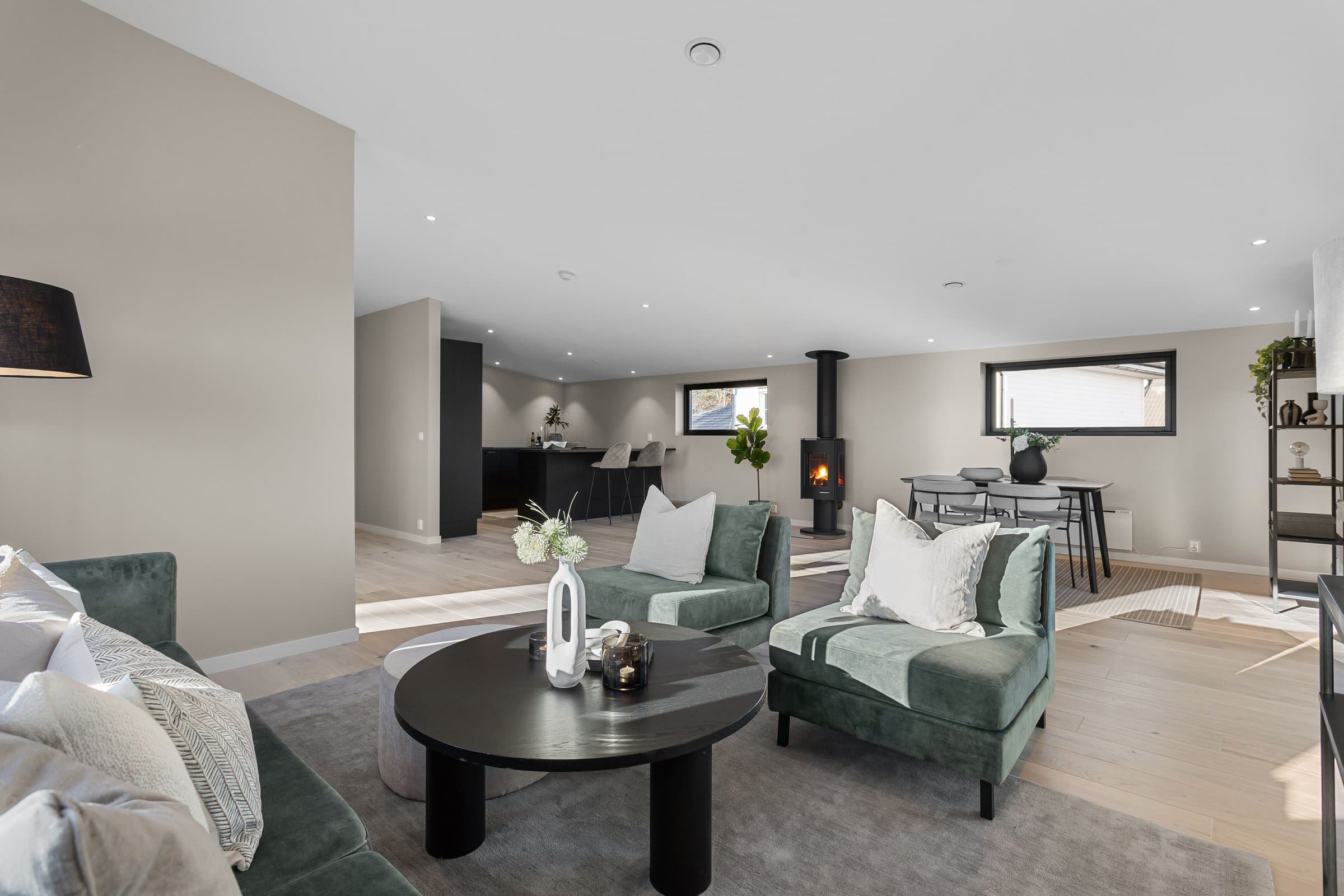 Innvendige overflater har moderne og gjennomført utførelse. Vegger og tak er gipset, sparklet og malt i lyse farger med listfri utførelse. På gulv i oppholdsrom og soverom er det lagt lys 14 mm 1-stavs eikeparkett (Barlinek). I gang er det lagt 60x60 cm lys grå flis. Vaskerom og sportsbod har 30x30 cm grå flis. Vegger er malt i lys, moderne farge (Lady Pure Color Hvit Lin). Tak er malt hvite. Det er downlights i entré, bad og stue/kjøkken. Kjøkken Kjøkken fra JKE Design, modell Nordic Silk Ask sort matt, med helintegrerte hvitevarer og integrert ventilator i koketopp (downdraft). Bad Boligen har to bad samt separat WC og vaskerom/teknisk rom. Badene er delikat flislagt og utstyrt med varmekabler, downlights, vegghengt toalett og moderne baderomsinnredning. Dette er en moderne og gjennomført enebolig med attraktiv beliggenhet, gode uteområder og en fleksibel planløsning som passer for ulike livsfaser og behov. En bolig som kombinerer komfort, kvalitet og beliggenhet – klar for nye eiere. Velkommen til visning!