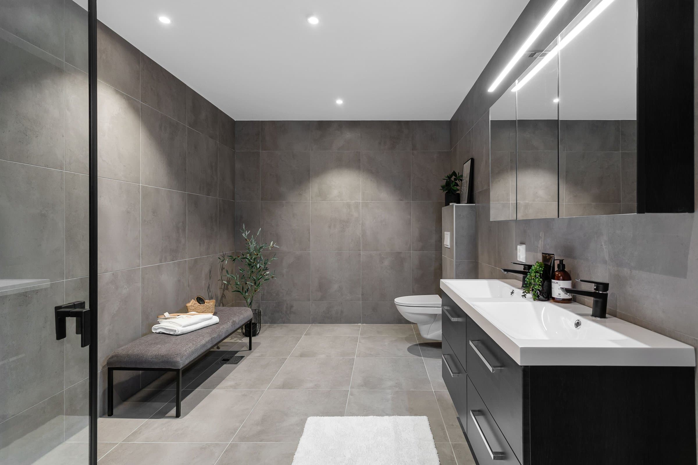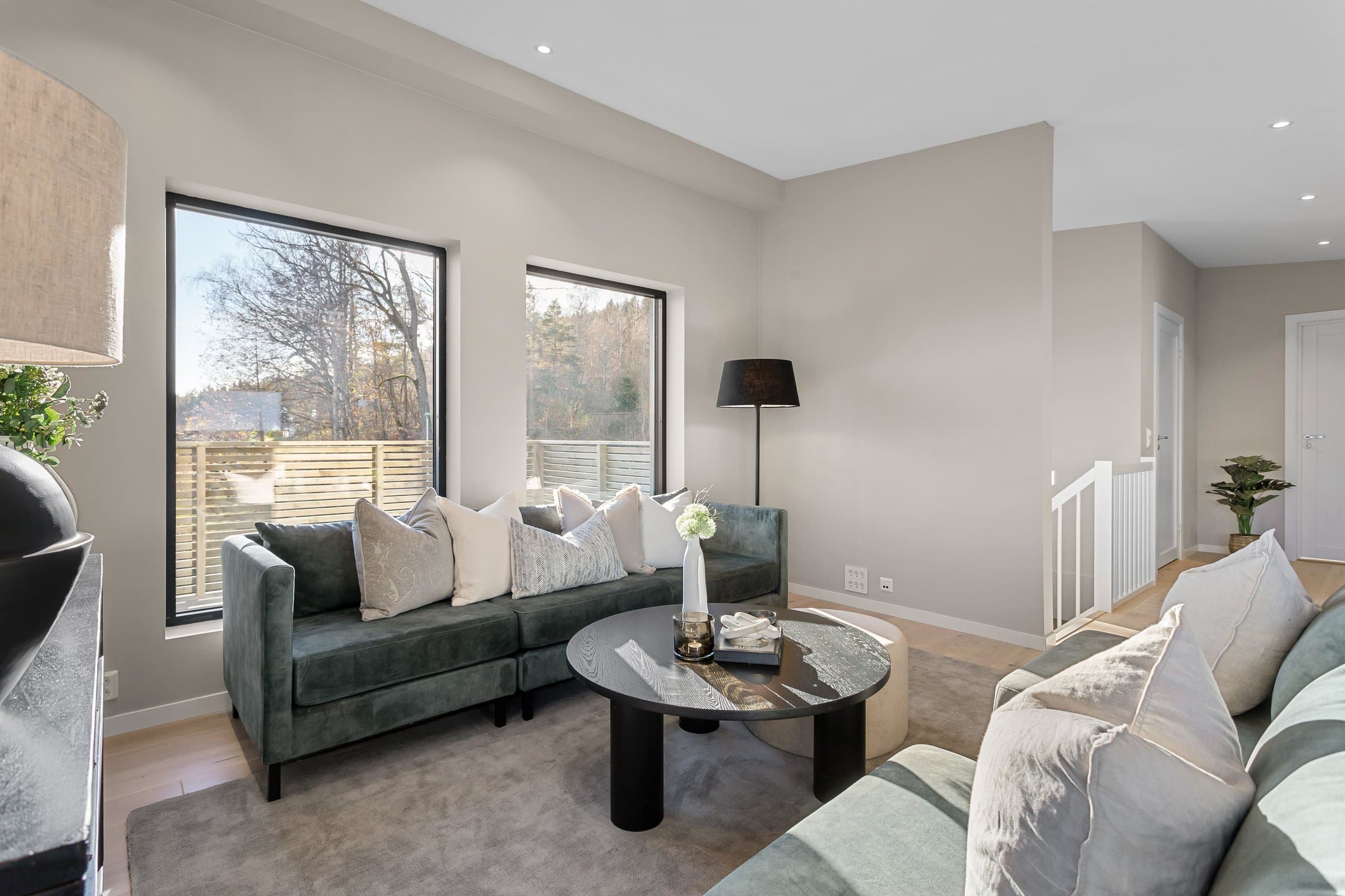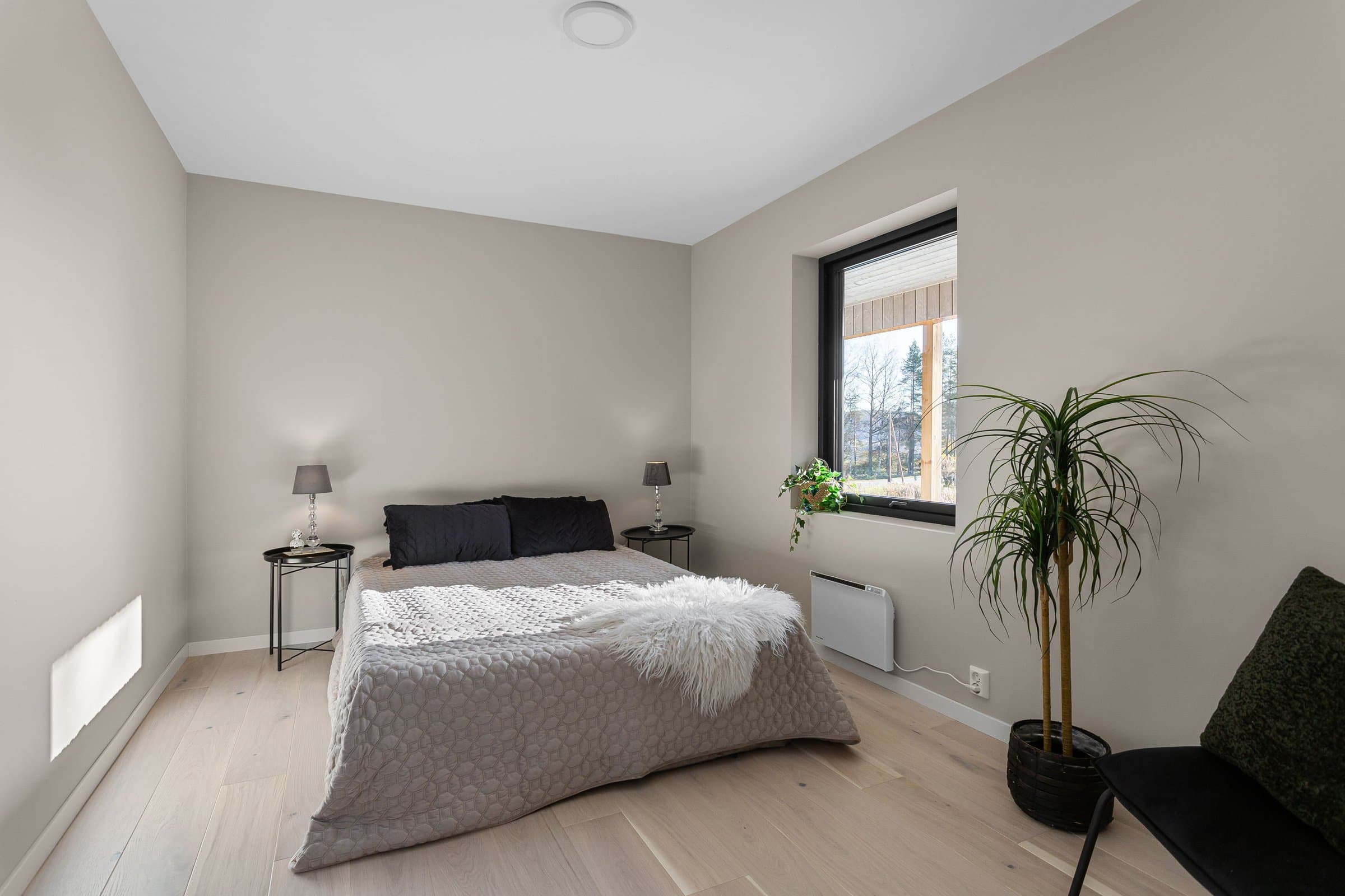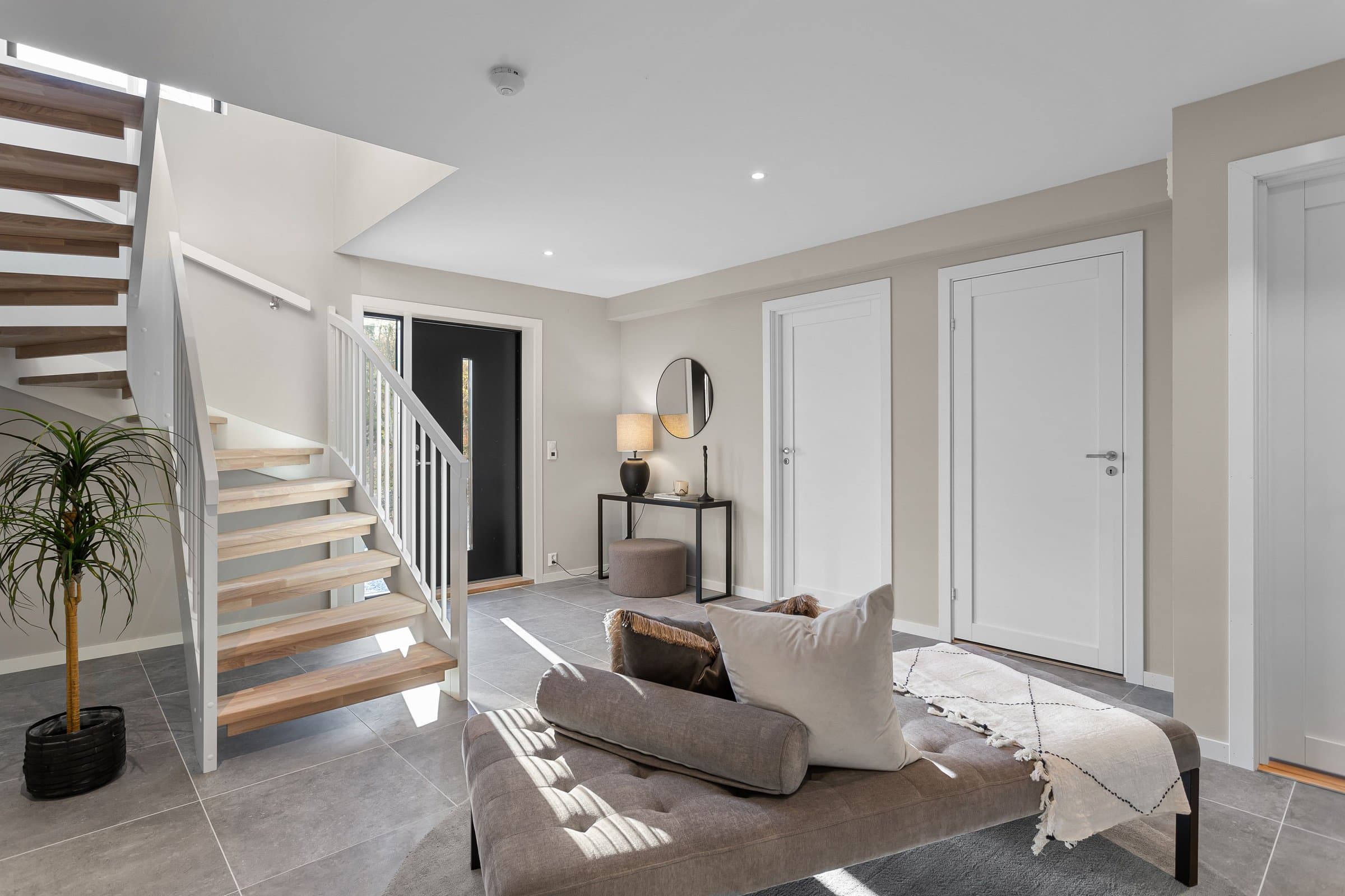 Innvendige overflater har moderne og gjennomført utførelse. Vegger og tak er gipset, sparklet og malt i lyse farger med listfri utførelse. På gulv i oppholdsrom og soverom er det lagt lys 14 mm 1-stavs eikeparkett (Barlinek). I gang er det lagt 60x60 cm lys grå flis. Vaskerom og sportsbod har 30x30 cm grå flis. Vegger er malt i lys, moderne farge (Lady Pure Color Hvit Lin). Tak er malt hvite. Det er downlights i entré, bad og stue/kjøkken. Kjøkken Kjøkken fra JKE Design, modell Nordic Silk Ask sort matt, med helintegrerte hvitevarer og integrert ventilator i koketopp (downdraft). Bad Boligen har to bad samt separat WC og vaskerom/teknisk rom. Badene er delikat flislagt og utstyrt med varmekabler, downlights, vegghengt toalett og moderne baderomsinnredning. Dette er en moderne og gjennomført enebolig med attraktiv beliggenhet, gode uteområder og en fleksibel planløsning som passer for ulike livsfaser og behov. En bolig som kombinerer komfort, kvalitet og beliggenhet – klar for nye eiere. Velkommen til visning!