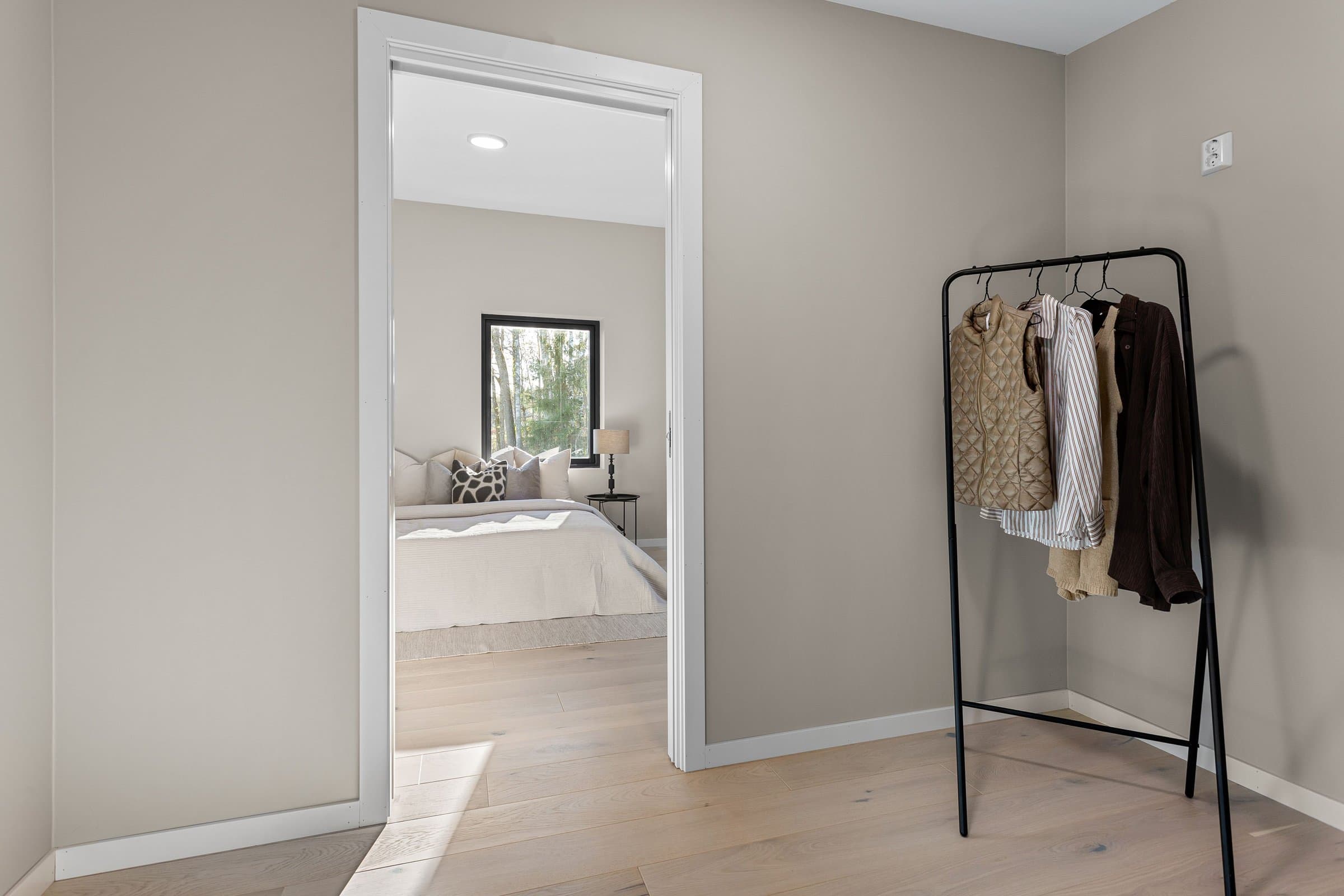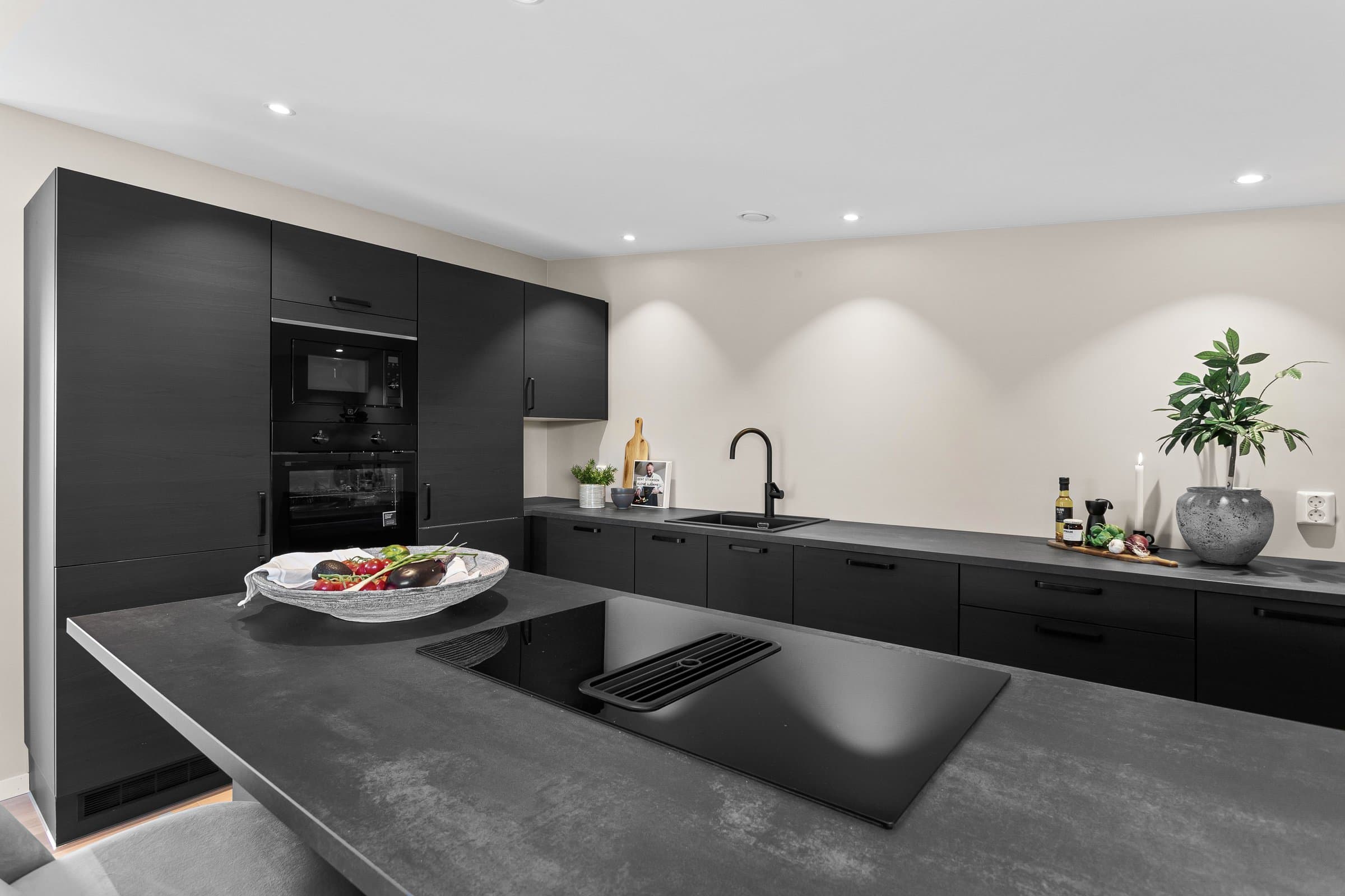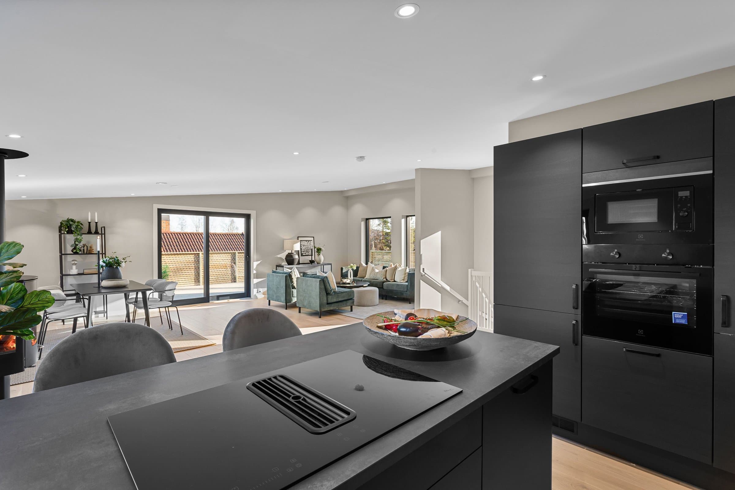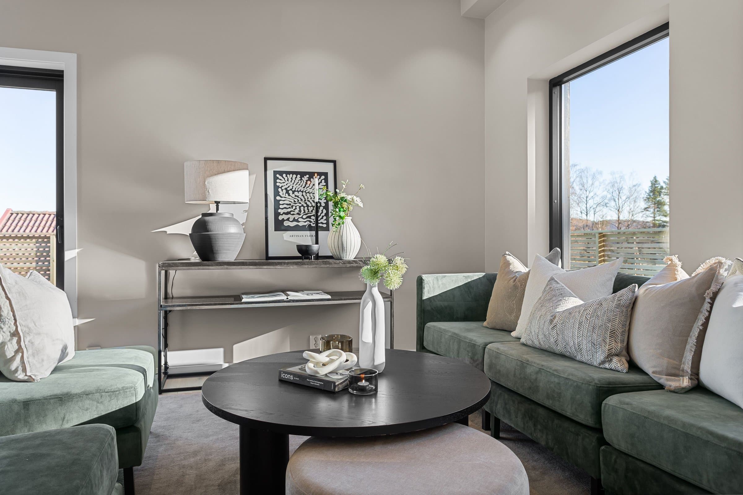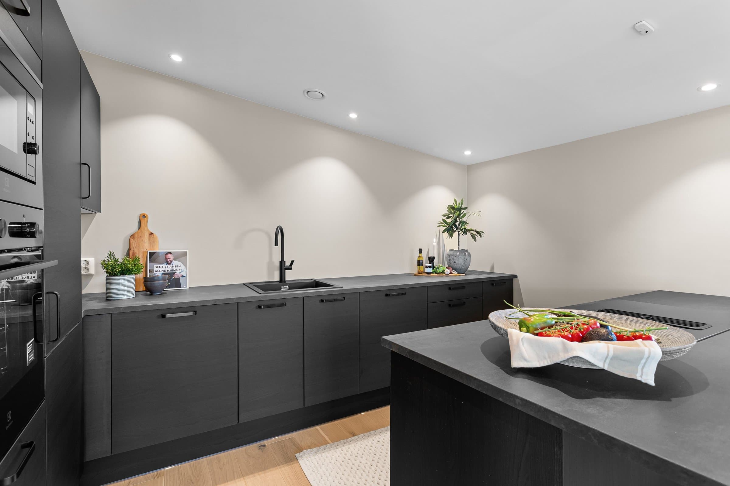 Innvendige overflater har moderne og gjennomført utførelse. Vegger og tak er gipset, sparklet og malt i lyse farger med listfri utførelse. På gulv i oppholdsrom og soverom er det lagt lys 14 mm 1-stavs eikeparkett (Barlinek). I gang er det lagt 60x60 cm lys grå flis. Vaskerom og sportsbod har 30x30 cm grå flis. Vegger er malt i lys, moderne farge (Lady Pure Color Hvit Lin). Tak er malt hvite. Det er downlights i entré, bad og stue/kjøkken. Kjøkken Kjøkken fra JKE Design, modell Nordic Silk Ask sort matt, med helintegrerte hvitevarer og integrert ventilator i koketopp (downdraft). Bad Boligen har to bad samt separat WC og vaskerom/teknisk rom. Badene er delikat flislagt og utstyrt med varmekabler, downlights, vegghengt toalett og moderne baderomsinnredning. Dette er en moderne og gjennomført enebolig med attraktiv beliggenhet, gode uteområder og en fleksibel planløsning som passer for ulike livsfaser og behov. En bolig som kombinerer komfort, kvalitet og beliggenhet – klar for nye eiere. Velkommen til visning!