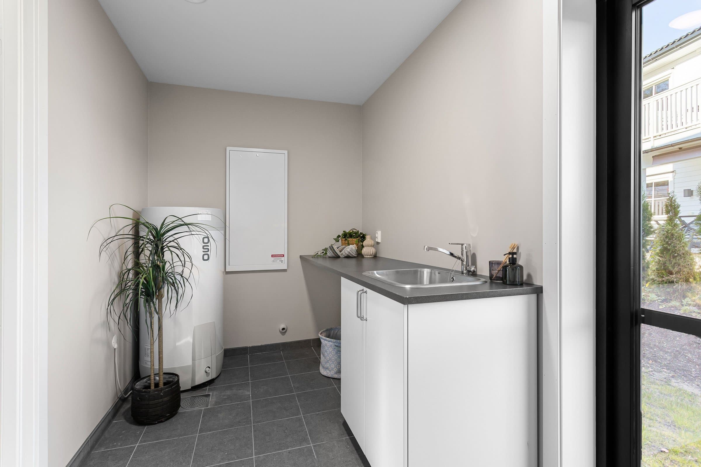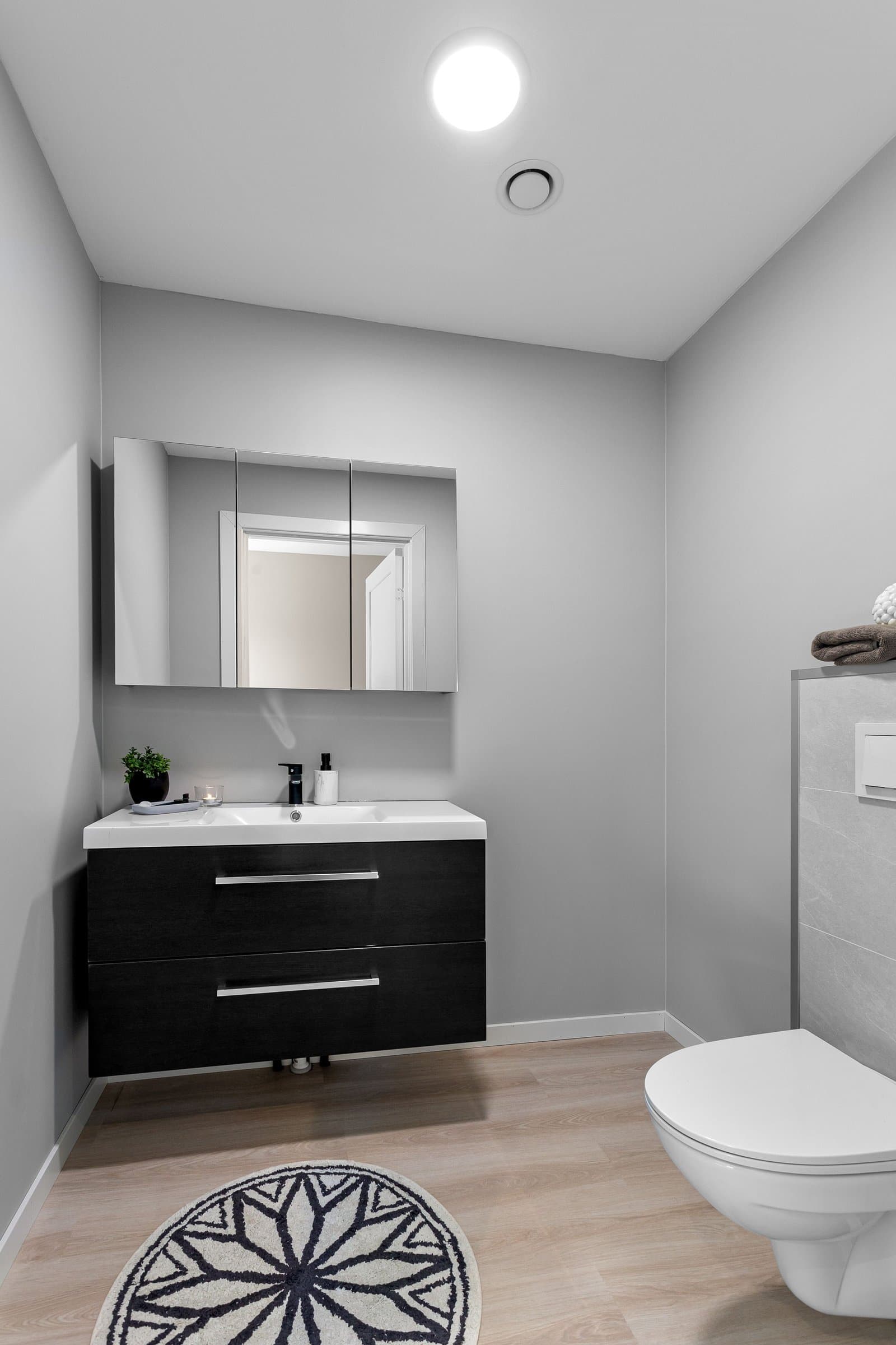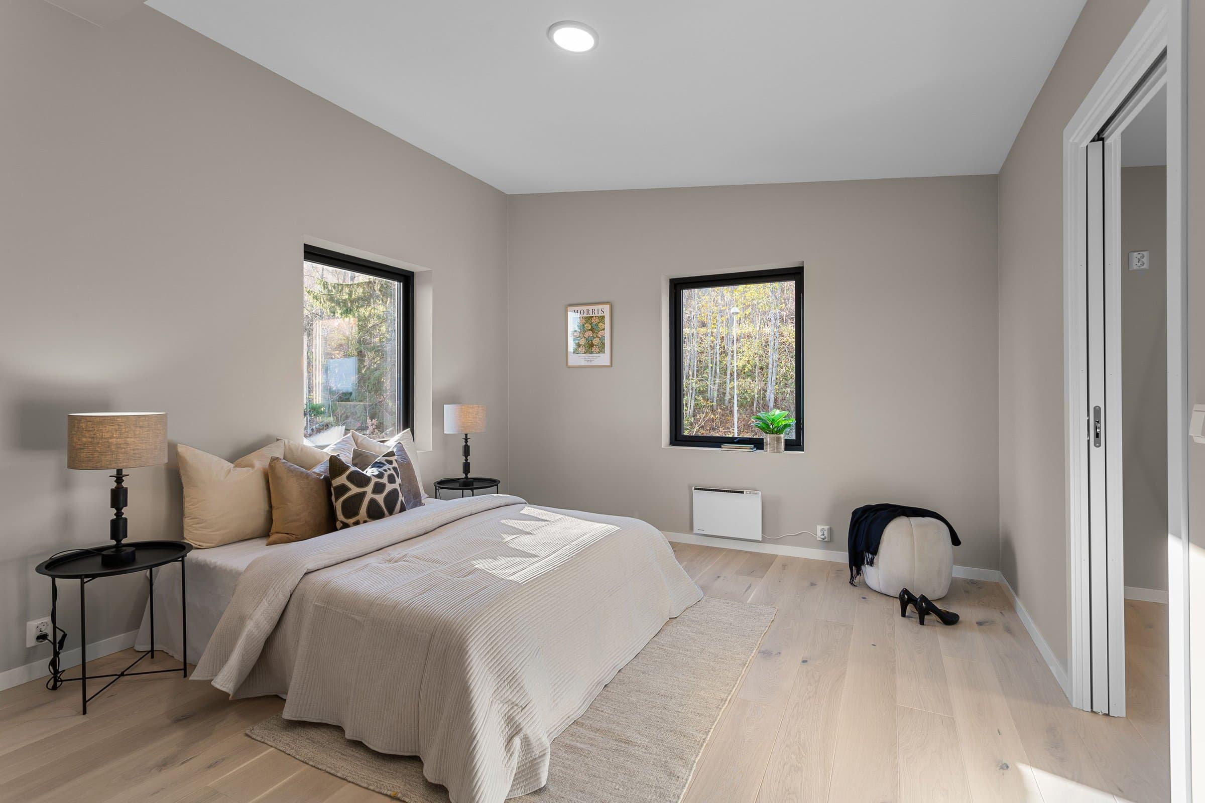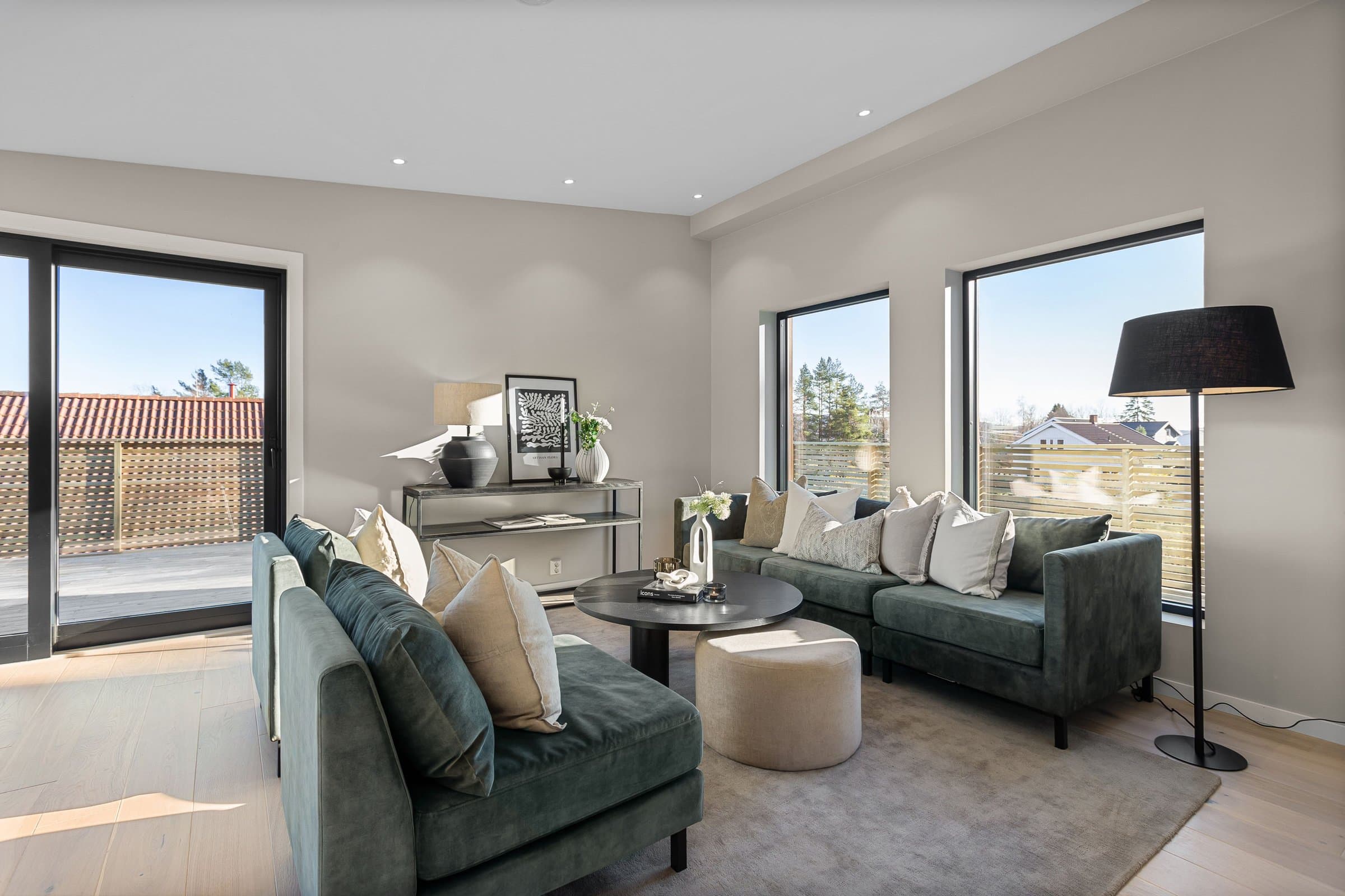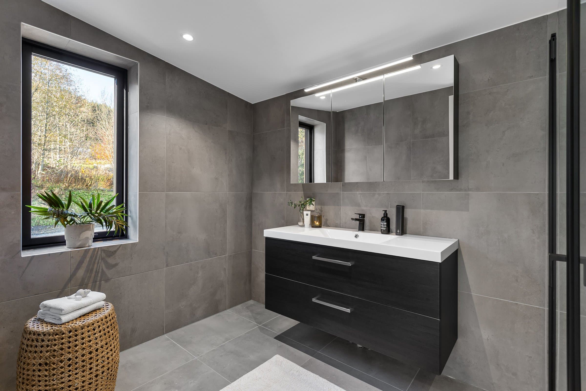 Innvendige overflater har moderne og gjennomført utførelse. Vegger og tak er gipset, sparklet og malt i lyse farger med listfri utførelse. På gulv i oppholdsrom og soverom er det lagt lys 14 mm 1-stavs eikeparkett (Barlinek). I gang er det lagt 60x60 cm lys grå flis. Vaskerom og sportsbod har 30x30 cm grå flis. Vegger er malt i lys, moderne farge (Lady Pure Color Hvit Lin). Tak er malt hvite. Det er downlights i entré, bad og stue/kjøkken. Kjøkken Kjøkken fra JKE Design, modell Nordic Silk Ask sort matt, med helintegrerte hvitevarer og integrert ventilator i koketopp (downdraft). Bad Boligen har to bad samt separat WC og vaskerom/teknisk rom. Badene er delikat flislagt og utstyrt med varmekabler, downlights, vegghengt toalett og moderne baderomsinnredning. Dette er en moderne og gjennomført enebolig med attraktiv beliggenhet, gode uteområder og en fleksibel planløsning som passer for ulike livsfaser og behov. En bolig som kombinerer komfort, kvalitet og beliggenhet – klar for nye eiere. Velkommen til visning!