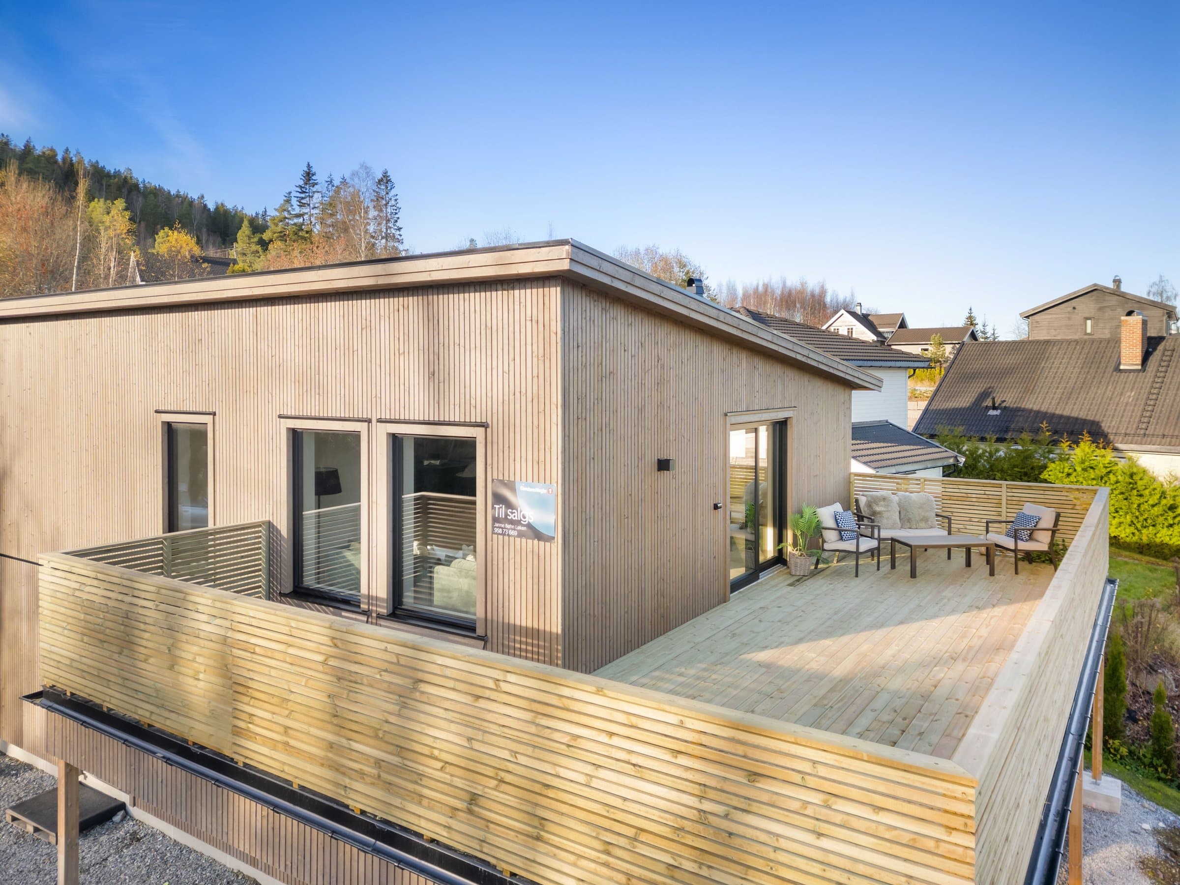 En moderne og tidsriktig innredet funkis enebolig med attraktiv og familievennlig beliggenhet. Boligen har en stilren utforming, gjennomtenkte løsninger og et tidløst design som gir et helhetlig og solid inntrykk – her kan man flytte rett inn. Boligen har en gjennomtenkt og velfungerende planløsning over to plan med 4 romslige soverom, samt flotte uteområder og en stor terrasse på ca. 43,9 m².