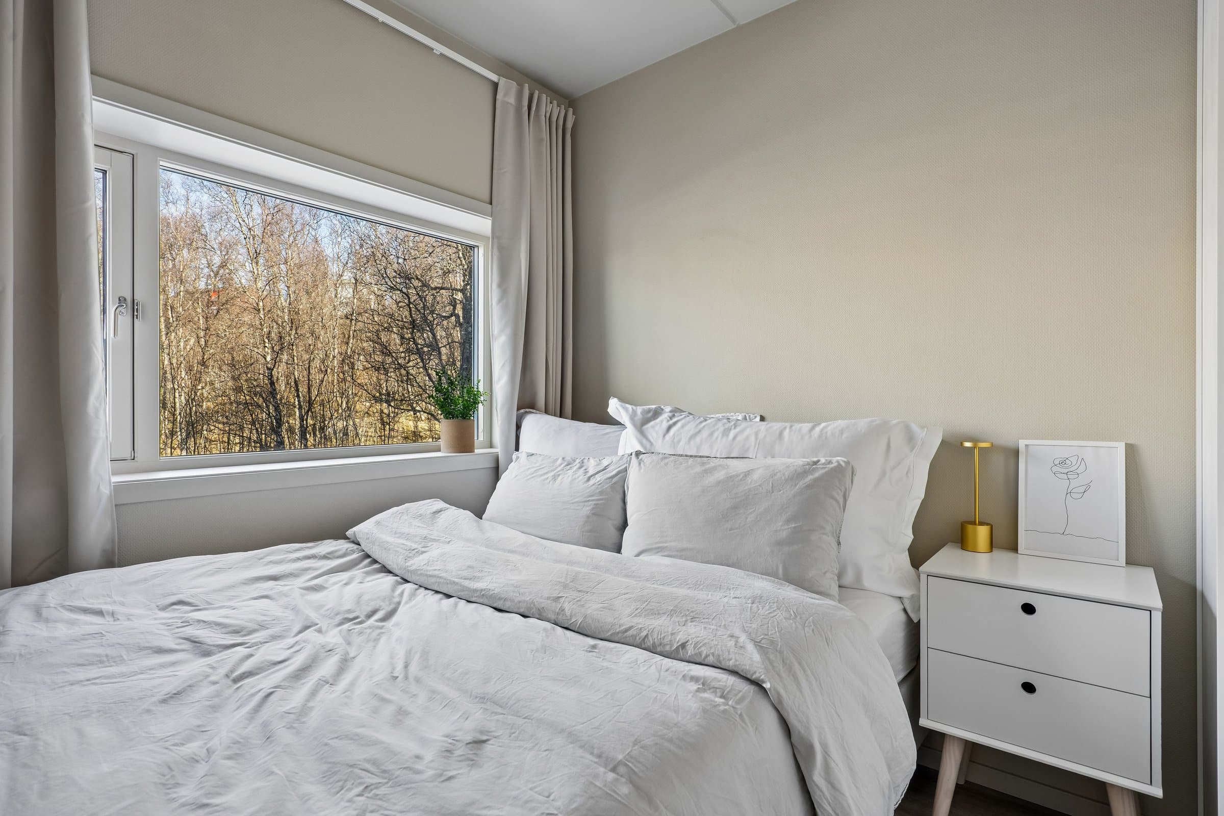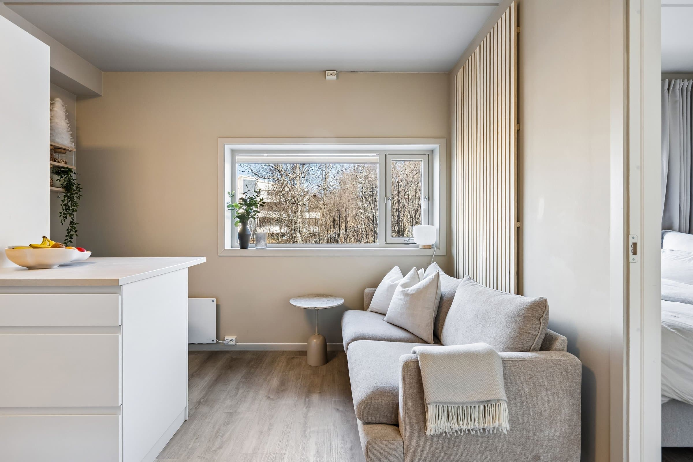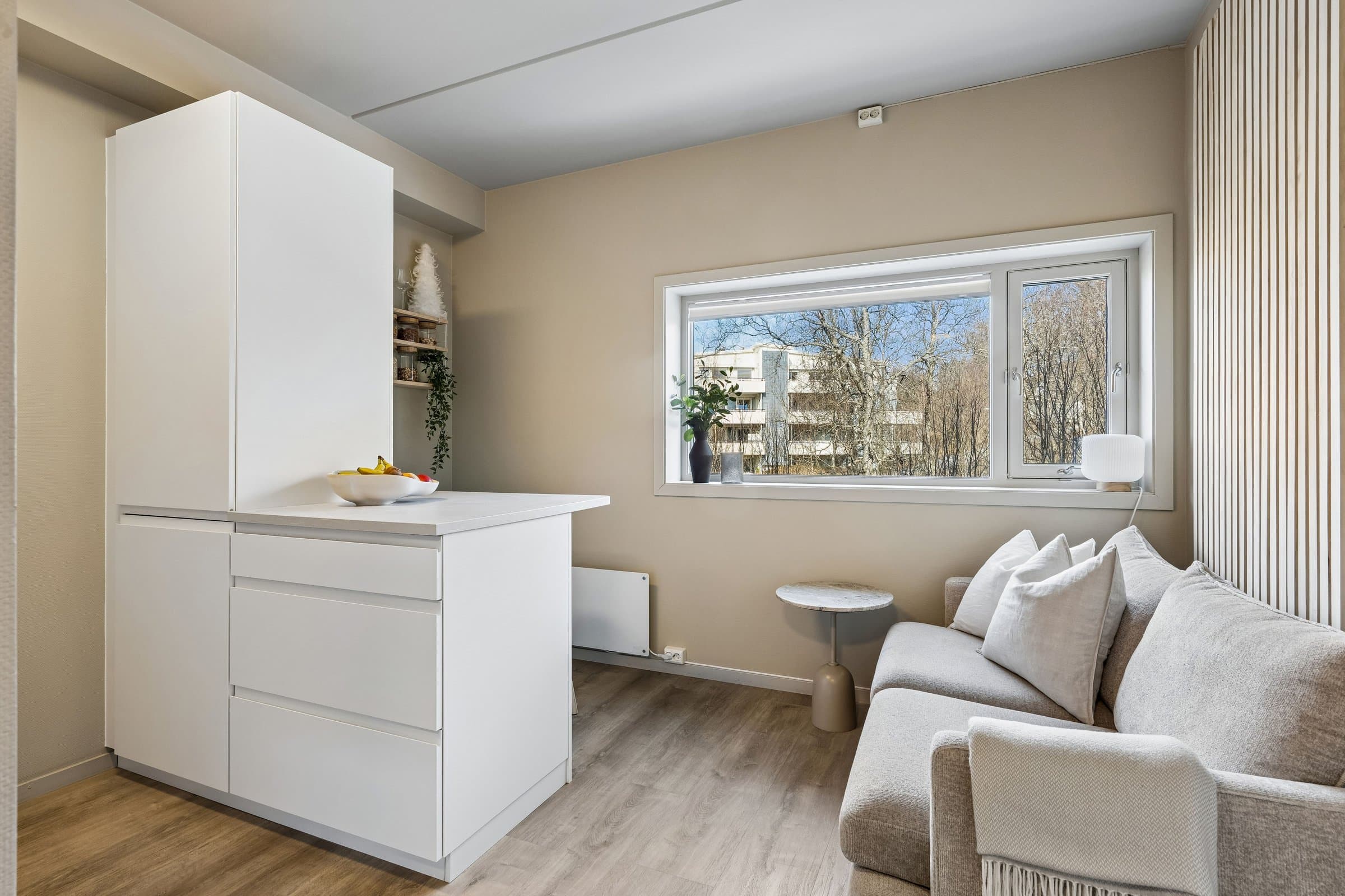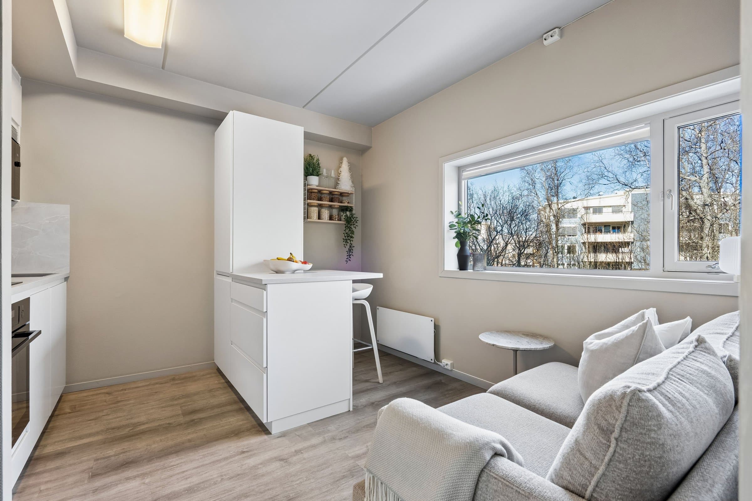 Velkommen til Wanny Woldstads veg 129 – en oppgradert og arealeffektiv 2-roms leilighet i 3. etasje med attraktiv beliggenhet på Fagereng. Kort oppsummert • Oppgradert 2-roms leilighet • Kjøkken fra 2023 med kjøkkenøy, spiseplasser og integrerte hvitevarer • Eget soverom • Nytt gulv i stue, kjøkken og soverom • Malte overflater • Garderobeløsninger fra Elfa • Praktisk oppbevaringsnisje med Elfa-system • Effektiv planløsning (26 m² BRA) • Heis i bygget • Stor bod i innendørs bodanlegg • Innendørs sykkelparkering • Lave felleskostnader • Fastrente på fellesgjeld: 2,88 % • Busstopp rett utenfor boligen • Direkte buss til UiT, UNN, Jekta og sentrum • Ca. 4 minutter til lysløypa • Kort vei til matbutikk, treningssenter og skole Leiligheten fremstår som oppgradert, moderne og arealeffektiv, med en planløsning som utnytter kvadratmeterne godt. Boligen inneholder oppholdsrom med åpen kjøkkenløsning, eget soverom, bad og gode oppbevaringsmuligheter. Kjøkkenet er fra 2023 og har kjøkkenøy samt integrerte hvitevarer. Kjøkkenøyen gir gode arbeidsflater og fungerer også som spiseplass med sitteplasser, noe som utnytter rommet på en smart måte og bidrar til en sosial og praktisk løsning i oppholdsrommet. I stue, kjøkken og soverom er det lagt nytt gulv, og overflater er malt, noe som gir boligen et lyst og oppdatert preg. Soverommet er separat fra oppholdsrommet og har garderobeløsning fra Elfa som gir gode oppbevaringsmuligheter. Leiligheten har også en praktisk oppbevaringsnisje med Elfa-system som bidrar til en ryddig og funksjonell løsning i en arealeffektiv leilighet. Leiligheten ligger i et bygg med heis og har i tillegg tilgang til en stor bod i innendørs bodanlegg. Det er også innendørs sykkelparkering i bygget, og gratis gjesteparkering. Boligen passer godt for førstegangskjøpere, studenter eller som pendlerbolig, med en effektiv planløsning og sentral beliggenhet på Tromsøya. Leiligheten fremstår som oppgradert og innflyttingsklar. Deler av møblementet kan eventuelt medfølge etter nærmere avtale.