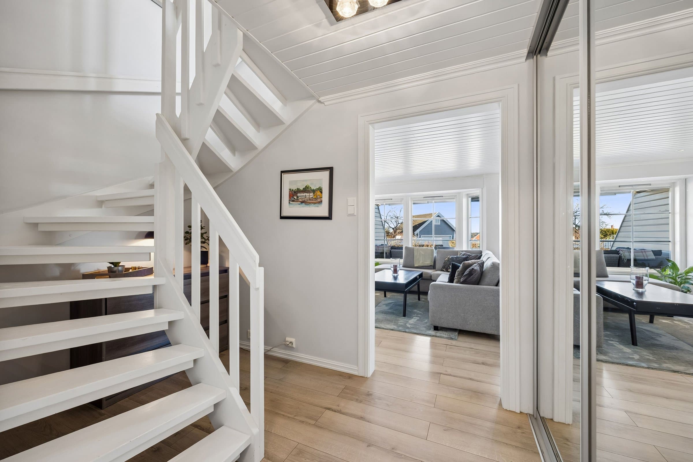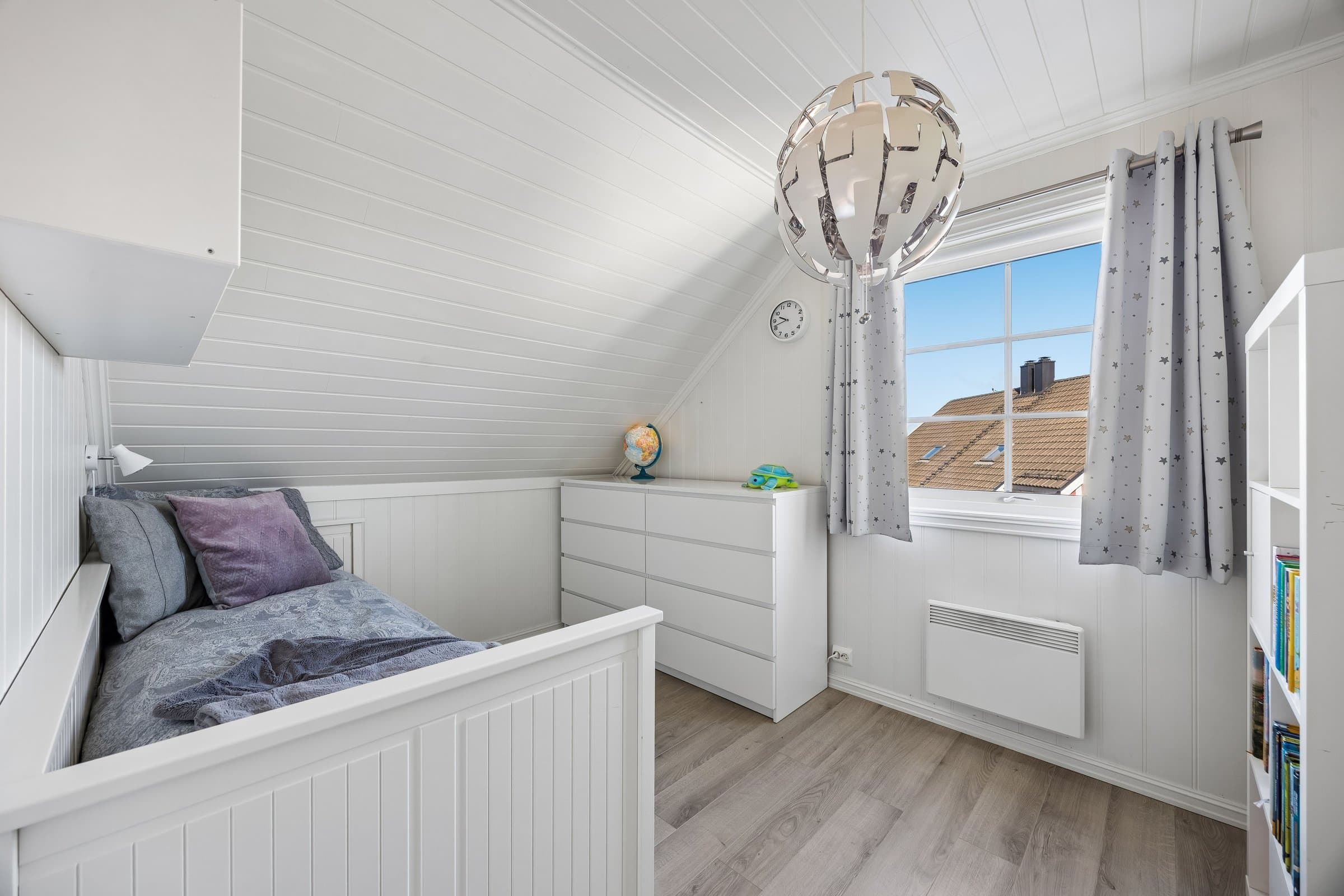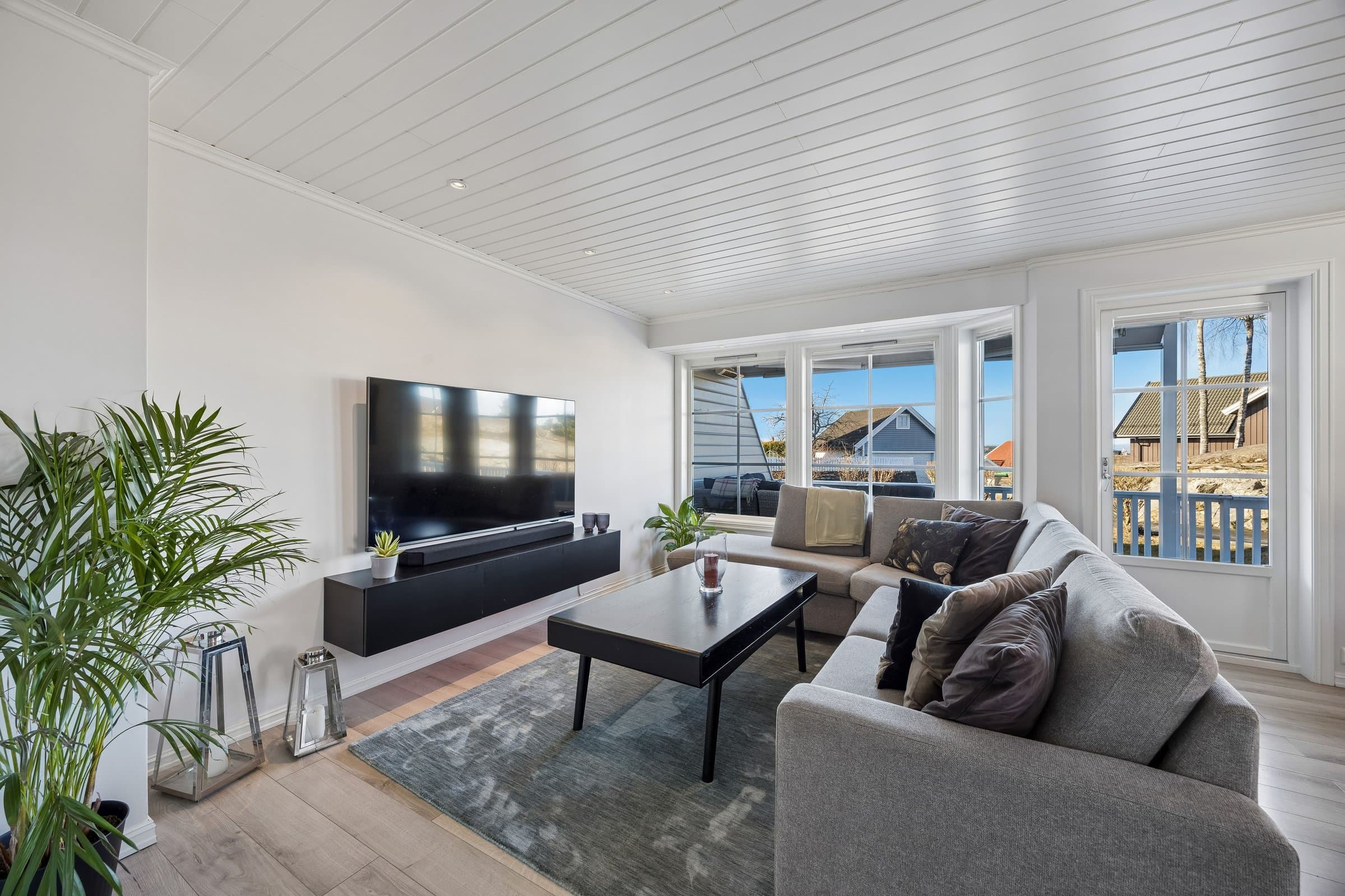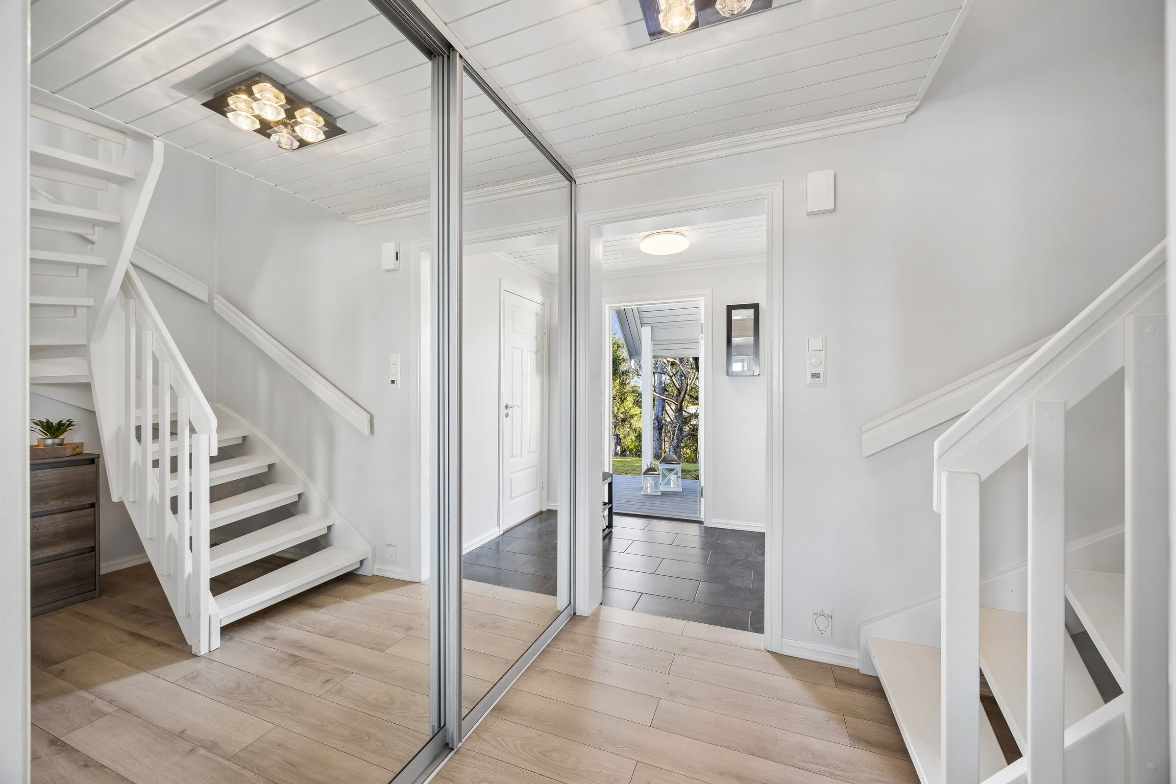 Vertikaldelt tomannsbolig over to etasjer med funksjonell planløsning og gjennomgående lyse overflater. 1. etasje: Vindfang og romslig hall med skyvedørsgarderobe. Stue med god plass til både sofagruppe og spisebord. Utgang til terrasse. Separat kjøkken med skyvedør til stuen. Glatte fronter og godt med skap- og benkeplass. Integrerte hvitevarer, 80 cm koketopp og to oppvaskkummer med matkvern. Vaskerom med wc, innredning og opplegg for vaskemaskin. Direkte adkomst til bod (ca. 5 m²) med egen utvendig inngang som er praktisk i hverdagen. 2. etasje: Gang, bad og tre soverom. Alle soverommene har utsyn mot Oslofjorden. Ett rom har utgang til veranda og egner seg også som TV-stue, kontor eller hovedsoverom. Det soverommet som benyttes som hovedsoverom i dag har to doble garderobeskap med vegg til veggteppe på gulvet. Bad med badekar og dusjløsning, vegghengt toalett og god oppbevaring i innredning og høyskap. Speilskap med belysning og spotter i tak. Overflater og teknisk: Gulv: fliser og parkett. Våtromsbelegg på vaskerom Vegger: malte flater, tapet, fliser på bad Himlinger: hvite vedlikeholdsfrie MDF-paneler Varmekabler i alle rom i 1. etasje (unntatt bod) og på bad i 2. etasje Sentralstøvsuger i begge etasjer Automatsikringer Mekanisk avtrekk fra bad og vaskerom