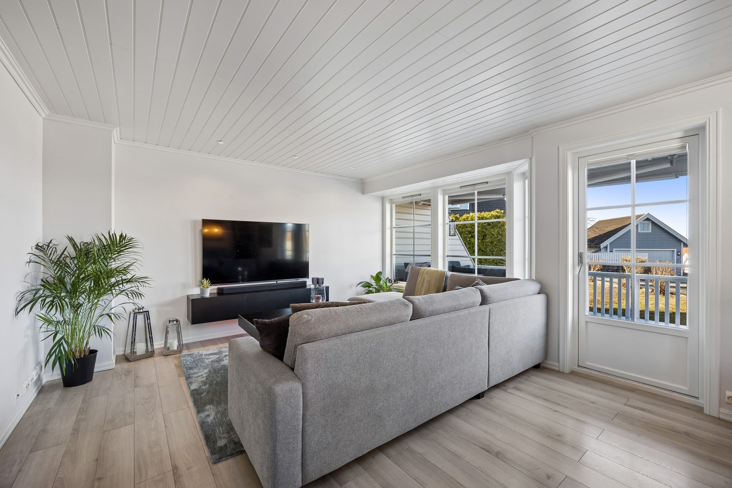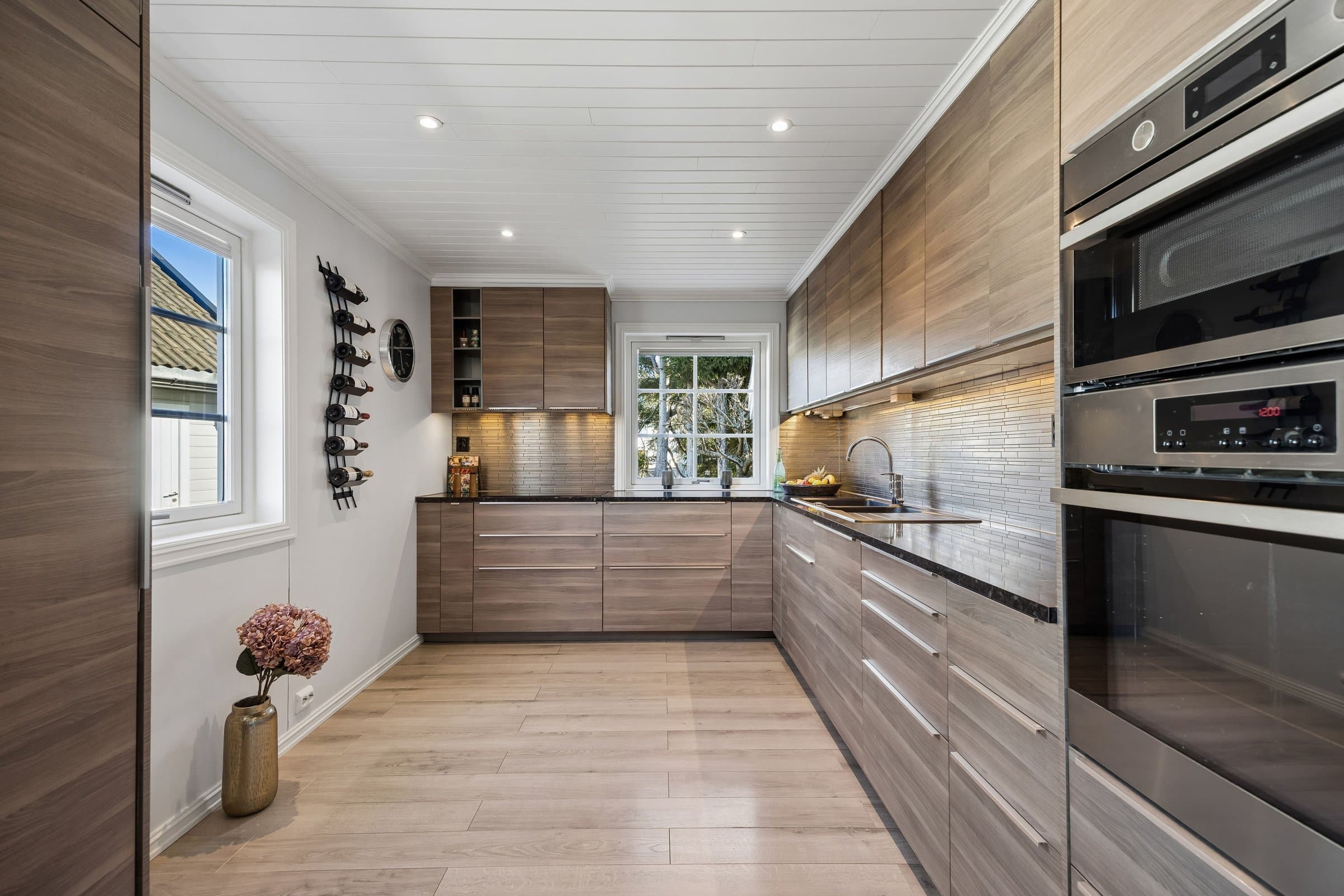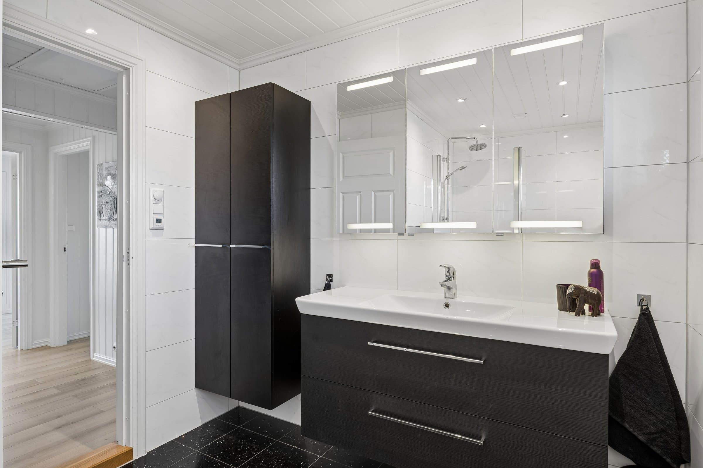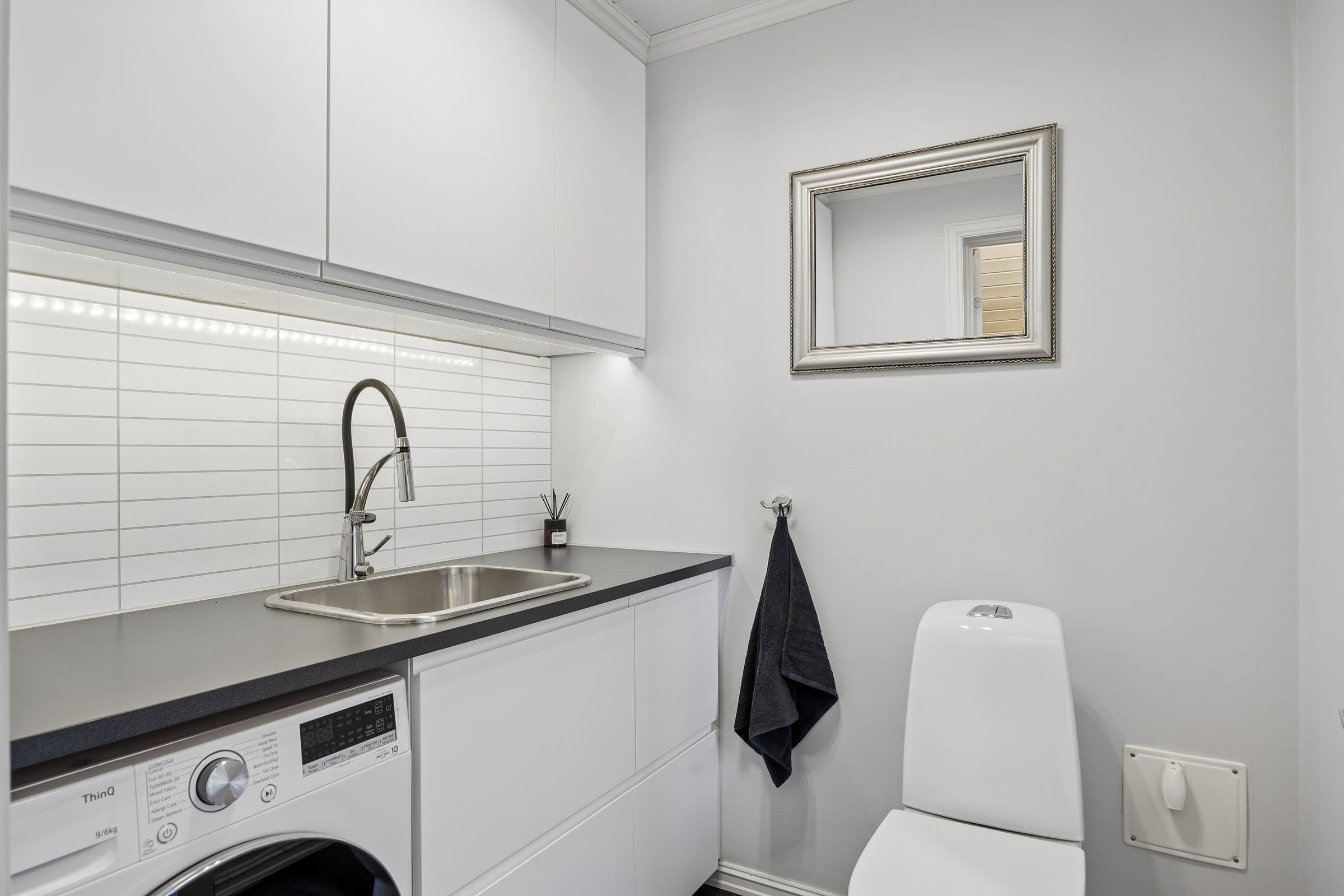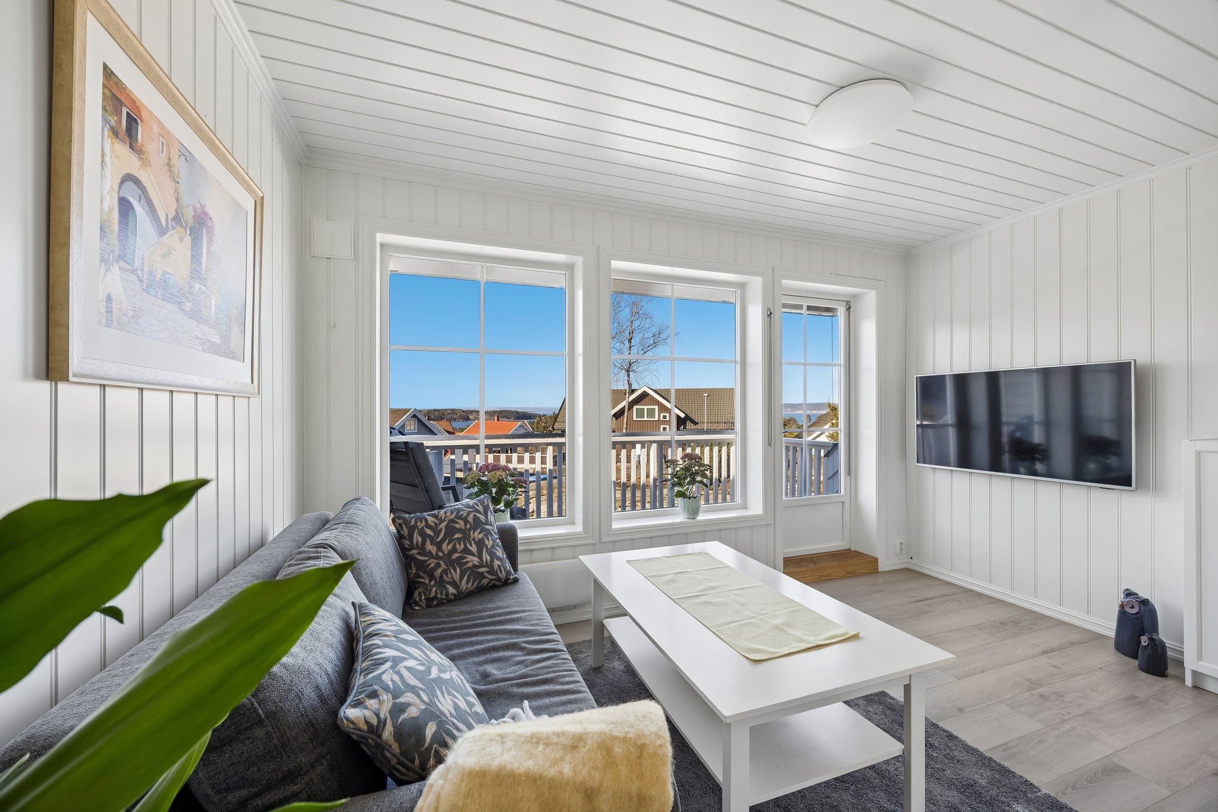 Vertikaldelt tomannsbolig over to etasjer med funksjonell planløsning og gjennomgående lyse overflater. 1. etasje: Vindfang og romslig hall med skyvedørsgarderobe. Stue med god plass til både sofagruppe og spisebord. Utgang til terrasse. Separat kjøkken med skyvedør til stuen. Glatte fronter og godt med skap- og benkeplass. Integrerte hvitevarer, 80 cm koketopp og to oppvaskkummer med matkvern. Vaskerom med wc, innredning og opplegg for vaskemaskin. Direkte adkomst til bod (ca. 5 m²) med egen utvendig inngang som er praktisk i hverdagen. 2. etasje: Gang, bad og tre soverom. Alle soverommene har utsyn mot Oslofjorden. Ett rom har utgang til veranda og egner seg også som TV-stue, kontor eller hovedsoverom. Det soverommet som benyttes som hovedsoverom i dag har to doble garderobeskap med vegg til veggteppe på gulvet. Bad med badekar og dusjløsning, vegghengt toalett og god oppbevaring i innredning og høyskap. Speilskap med belysning og spotter i tak. Overflater og teknisk: Gulv: fliser og parkett. Våtromsbelegg på vaskerom Vegger: malte flater, tapet, fliser på bad Himlinger: hvite vedlikeholdsfrie MDF-paneler Varmekabler i alle rom i 1. etasje (unntatt bod) og på bad i 2. etasje Sentralstøvsuger i begge etasjer Automatsikringer Mekanisk avtrekk fra bad og vaskerom