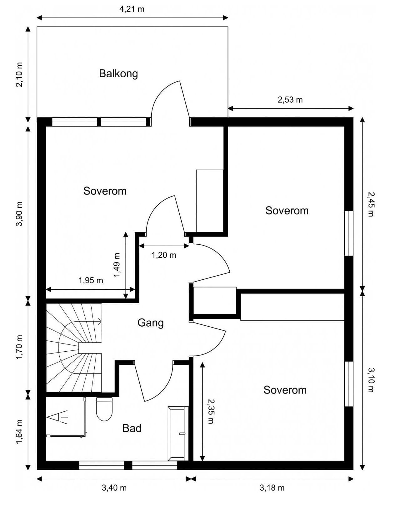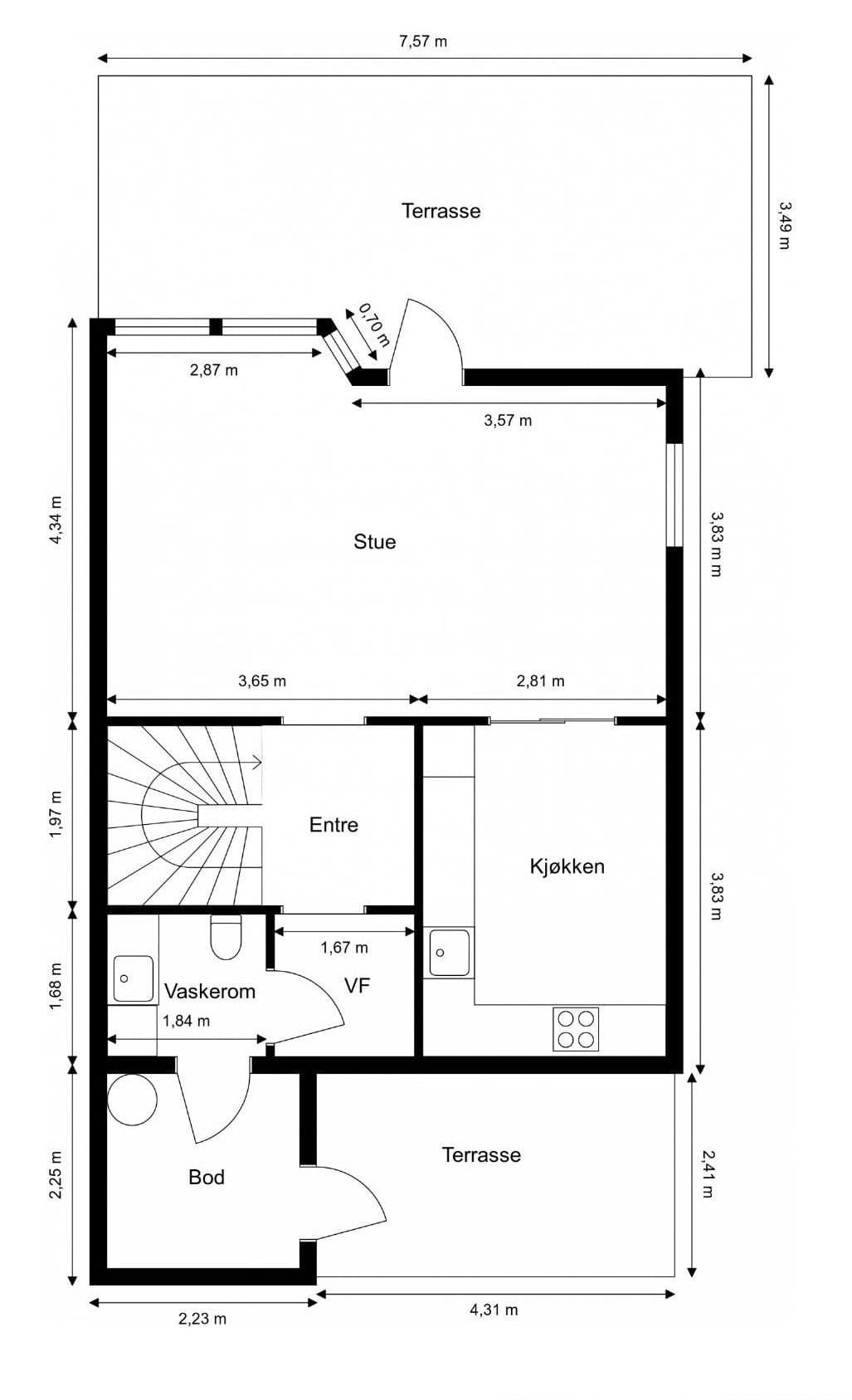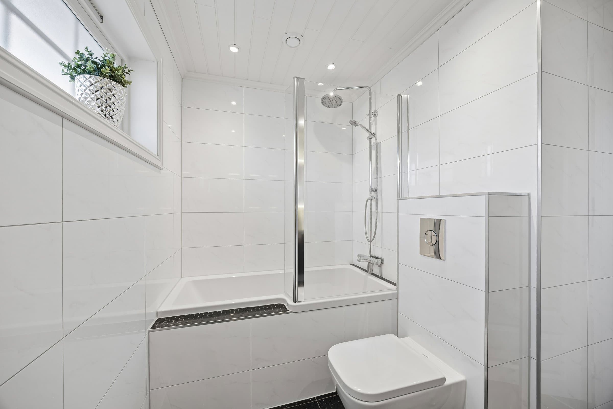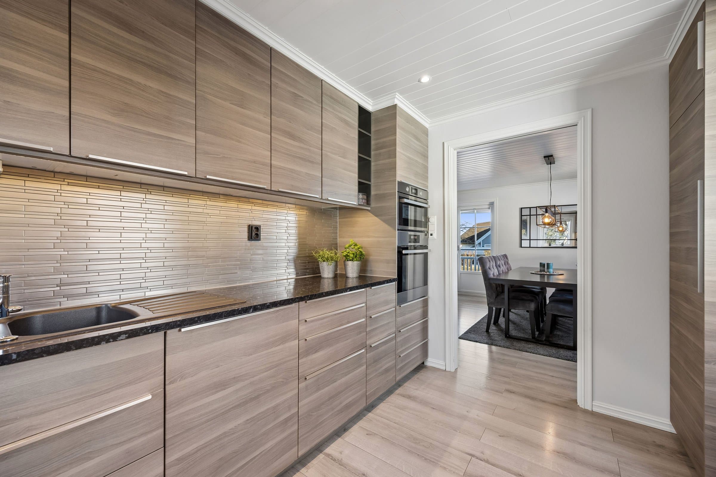 Vertikaldelt tomannsbolig over to etasjer med funksjonell planløsning og gjennomgående lyse overflater. 1. etasje: Vindfang og romslig hall med skyvedørsgarderobe. Stue med god plass til både sofagruppe og spisebord. Utgang til terrasse. Separat kjøkken med skyvedør til stuen. Glatte fronter og godt med skap- og benkeplass. Integrerte hvitevarer, 80 cm koketopp og to oppvaskkummer med matkvern. Vaskerom med wc, innredning og opplegg for vaskemaskin. Direkte adkomst til bod (ca. 5 m²) med egen utvendig inngang som er praktisk i hverdagen. 2. etasje: Gang, bad og tre soverom. Alle soverommene har utsyn mot Oslofjorden. Ett rom har utgang til veranda og egner seg også som TV-stue, kontor eller hovedsoverom. Det soverommet som benyttes som hovedsoverom i dag har to doble garderobeskap med vegg til veggteppe på gulvet. Bad med badekar og dusjløsning, vegghengt toalett og god oppbevaring i innredning og høyskap. Speilskap med belysning og spotter i tak. Overflater og teknisk: Gulv: fliser og parkett. Våtromsbelegg på vaskerom Vegger: malte flater, tapet, fliser på bad Himlinger: hvite vedlikeholdsfrie MDF-paneler Varmekabler i alle rom i 1. etasje (unntatt bod) og på bad i 2. etasje Sentralstøvsuger i begge etasjer Automatsikringer Mekanisk avtrekk fra bad og vaskerom