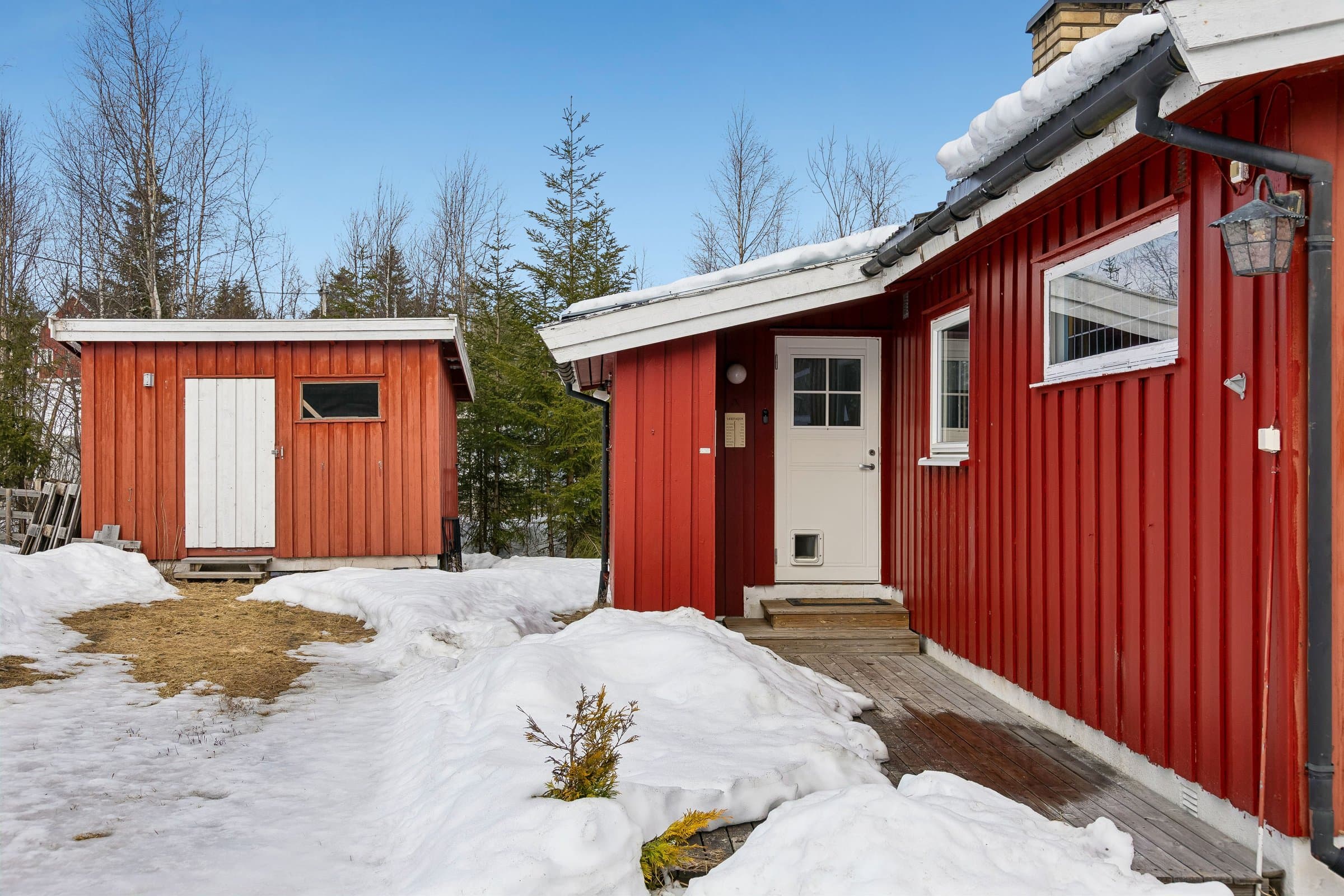 Eiendommen har en flat tomt på 1156 kvadratmeter med stor hage rett ved skogkanten. En hellelagt terrasse vender ut mot hagen, skjermet med en levegg av tre. På fremsiden av huset er det hage med noe beplantning og stor gårdsplass mot vegen.