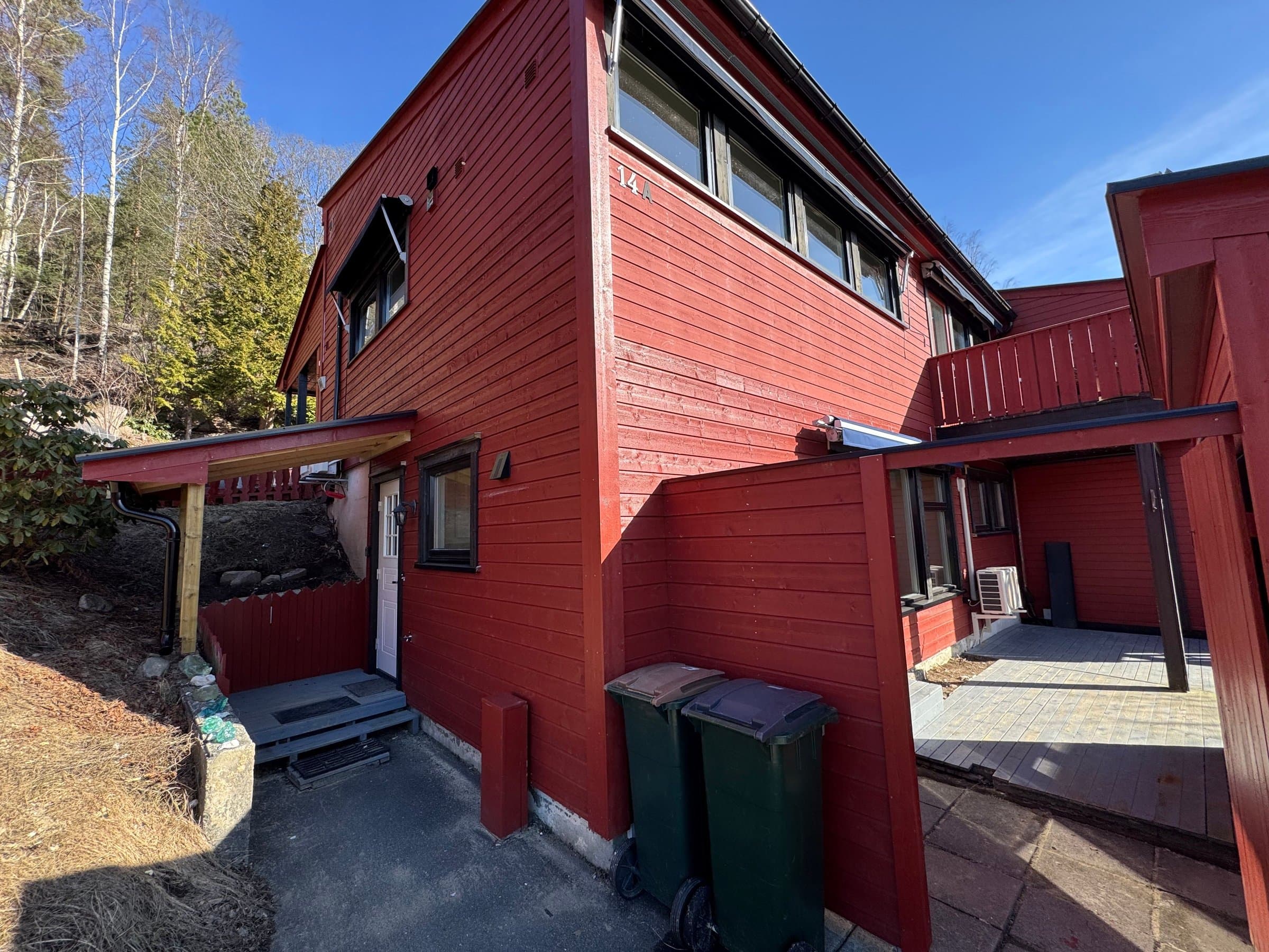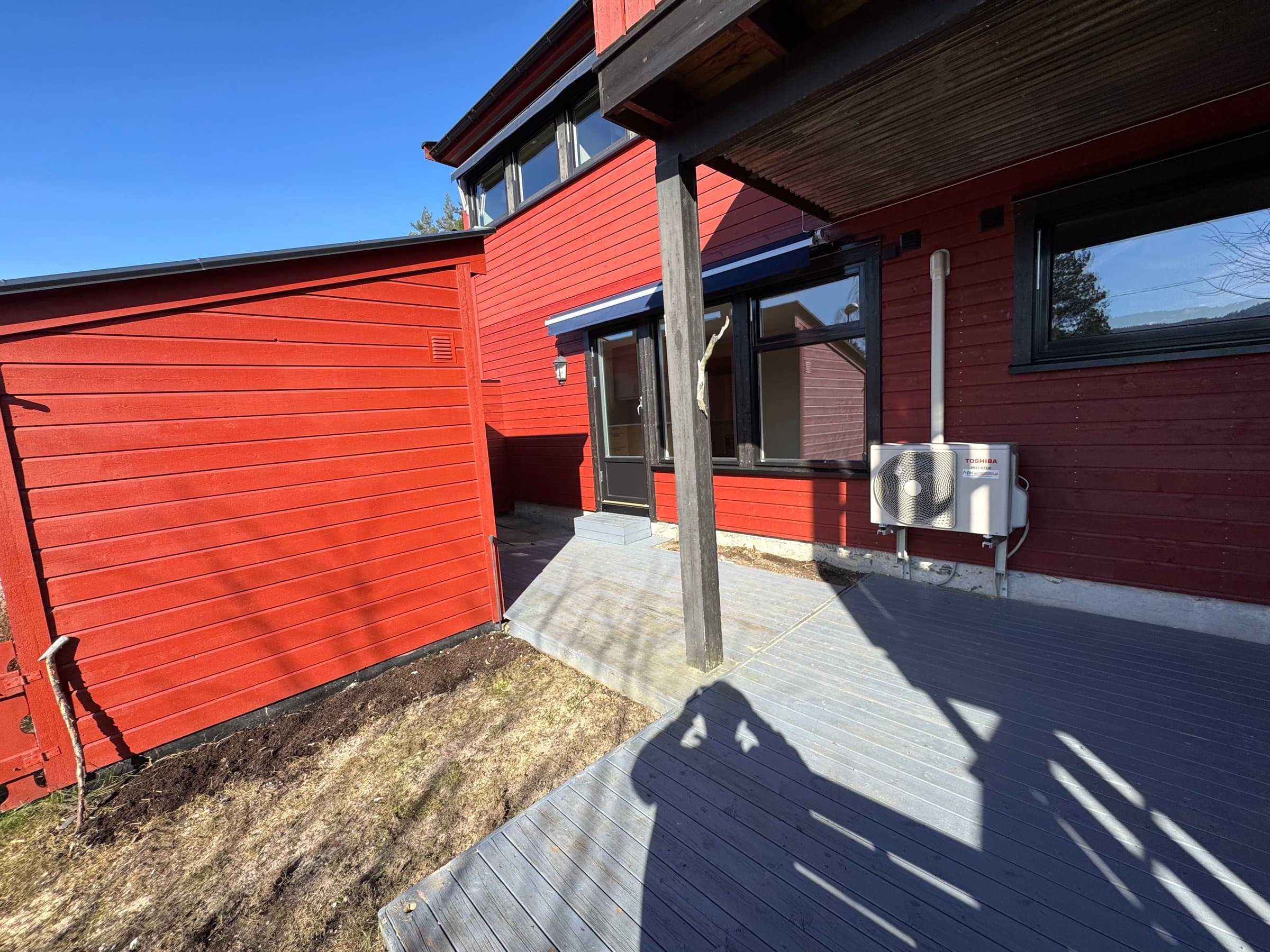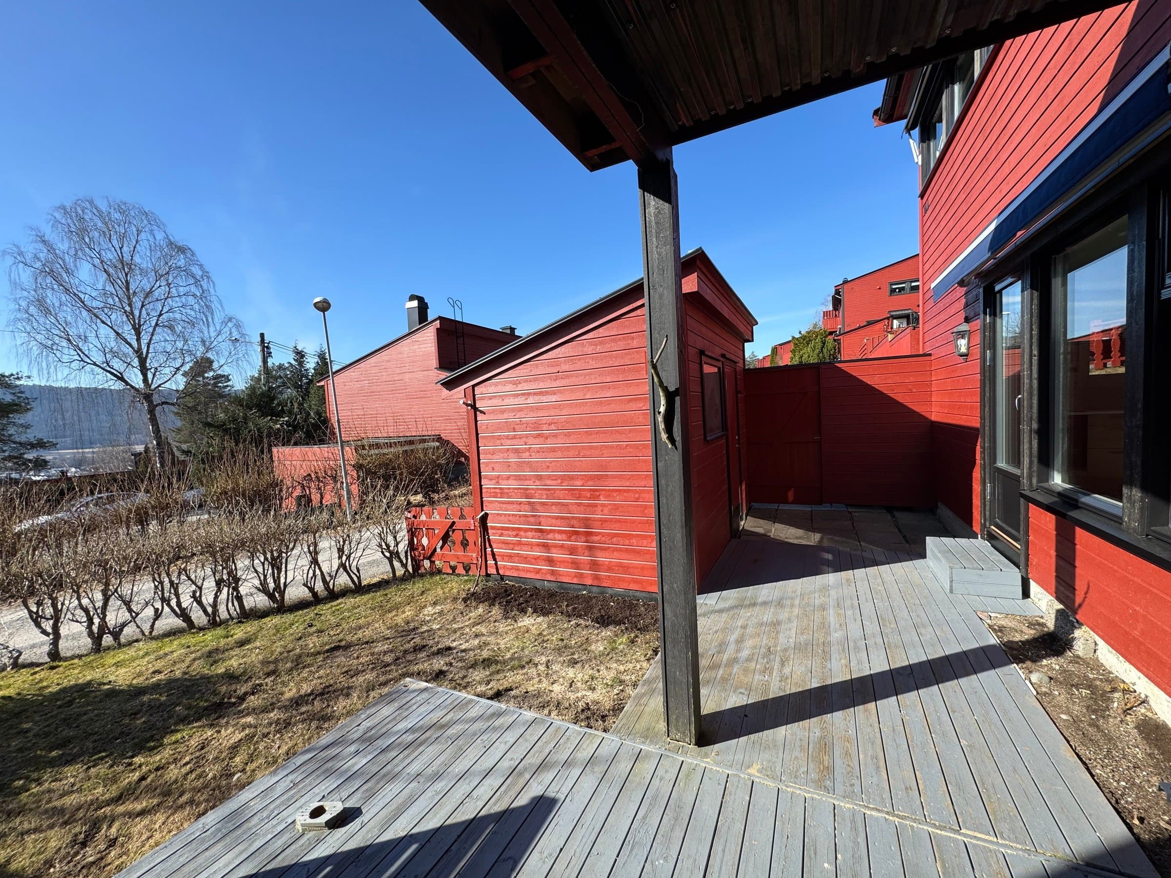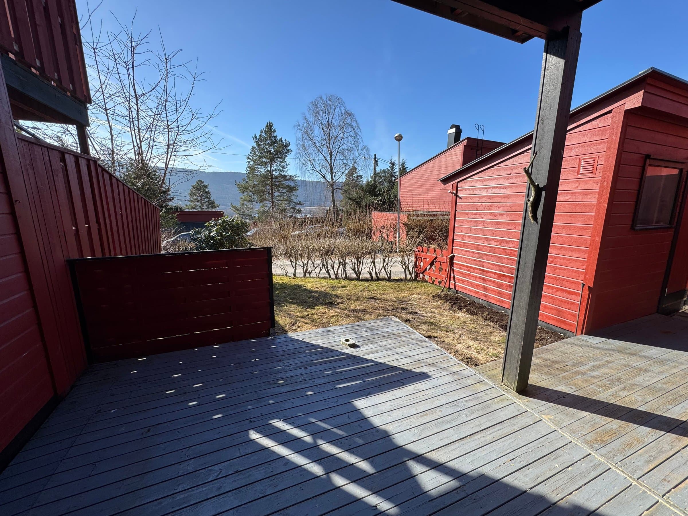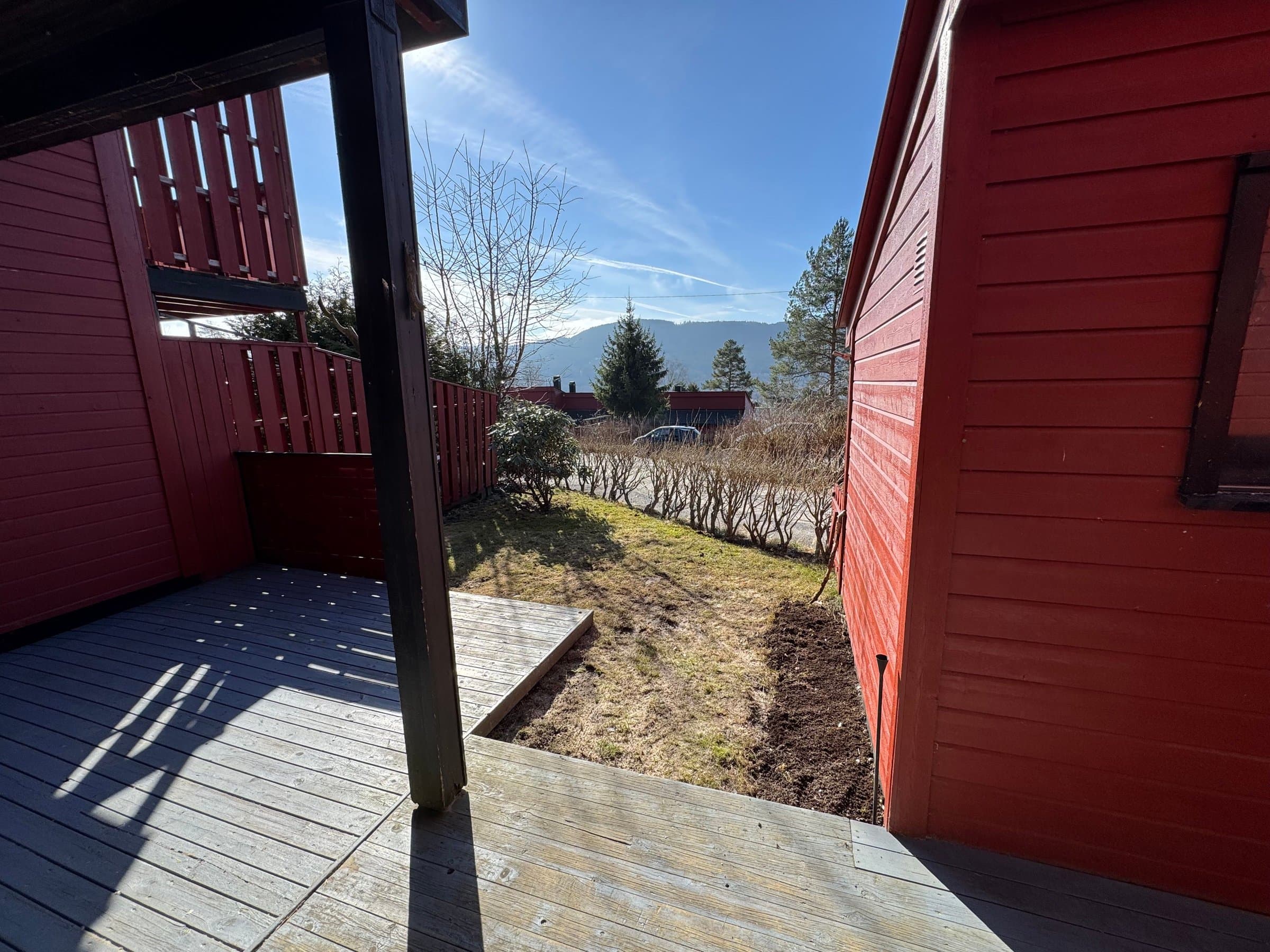 Leiligheten har en fin overbygget markterrasse med liten hage, gressplen og beplantning. Vestvendt solrikt utsiktstomt.