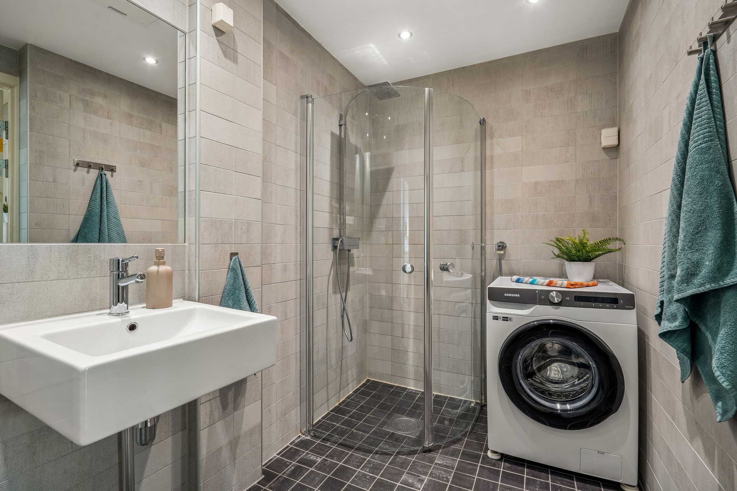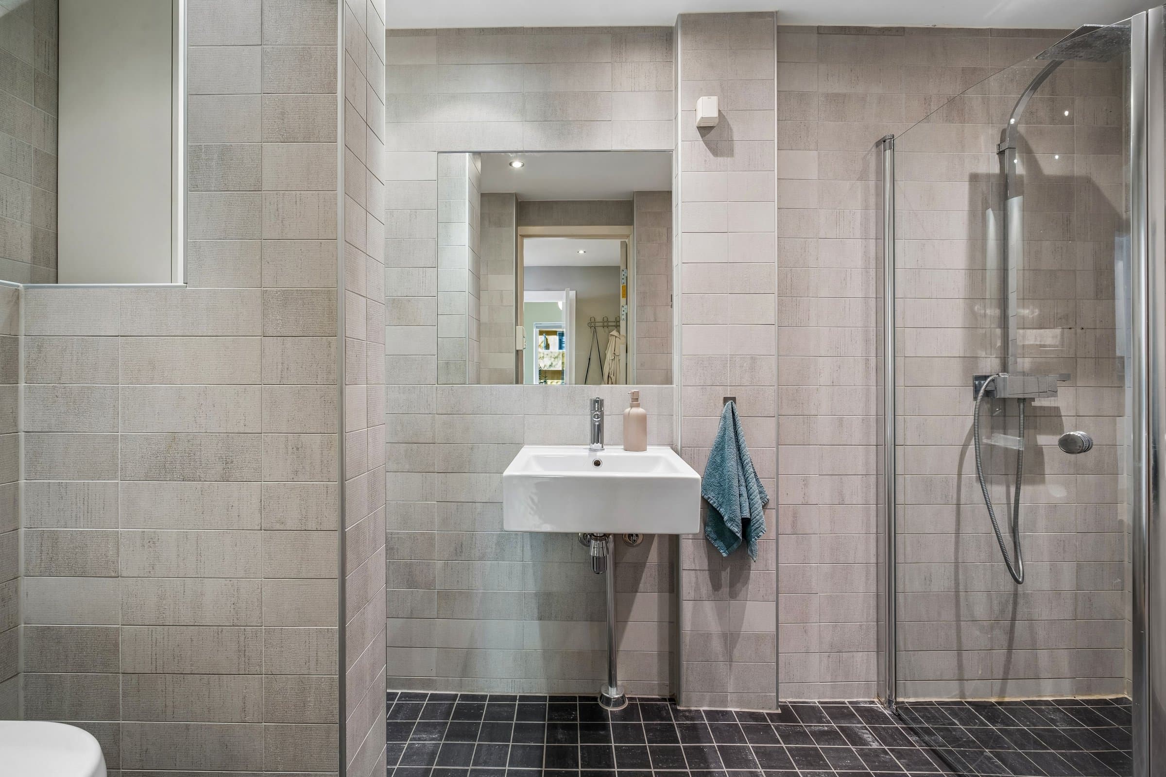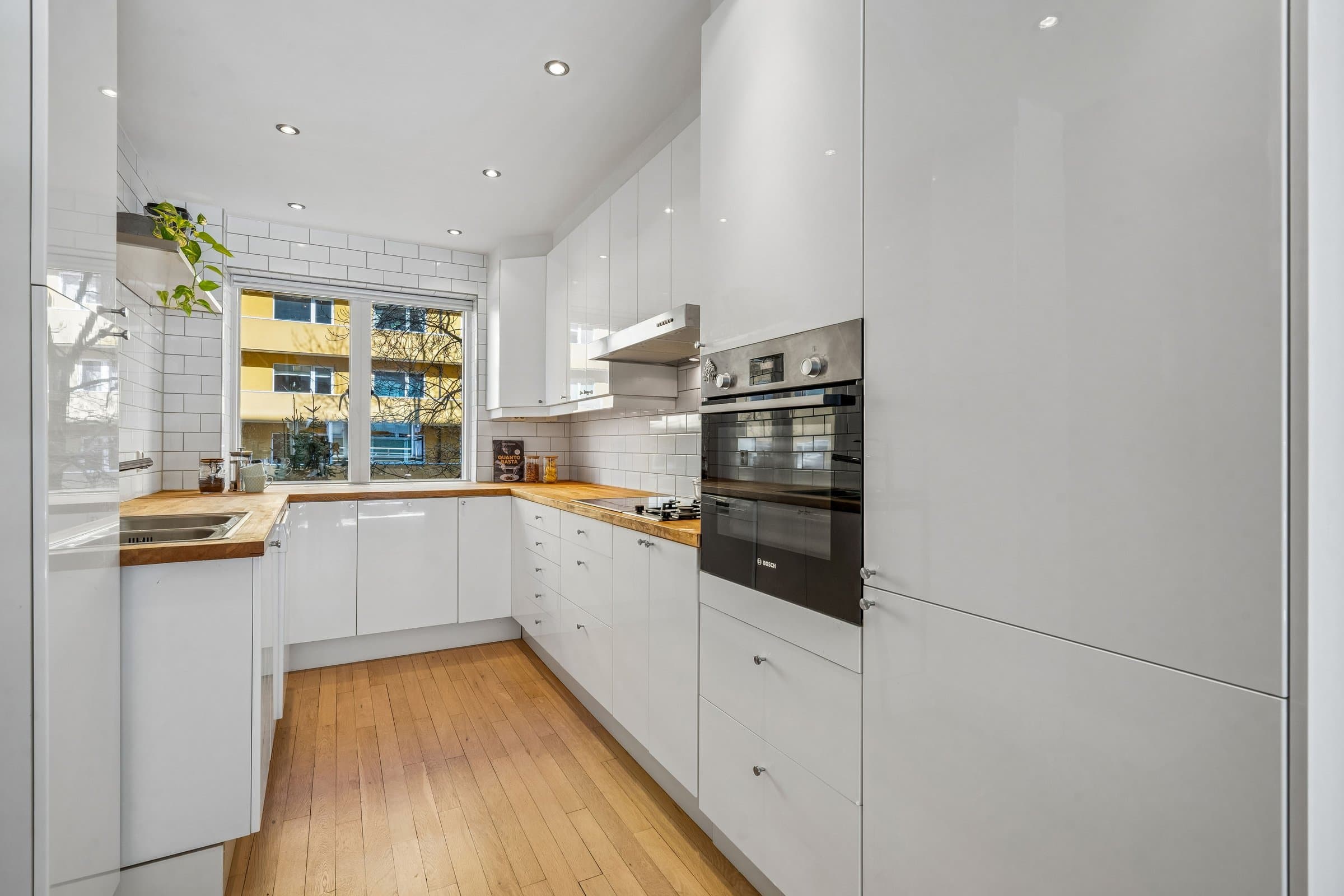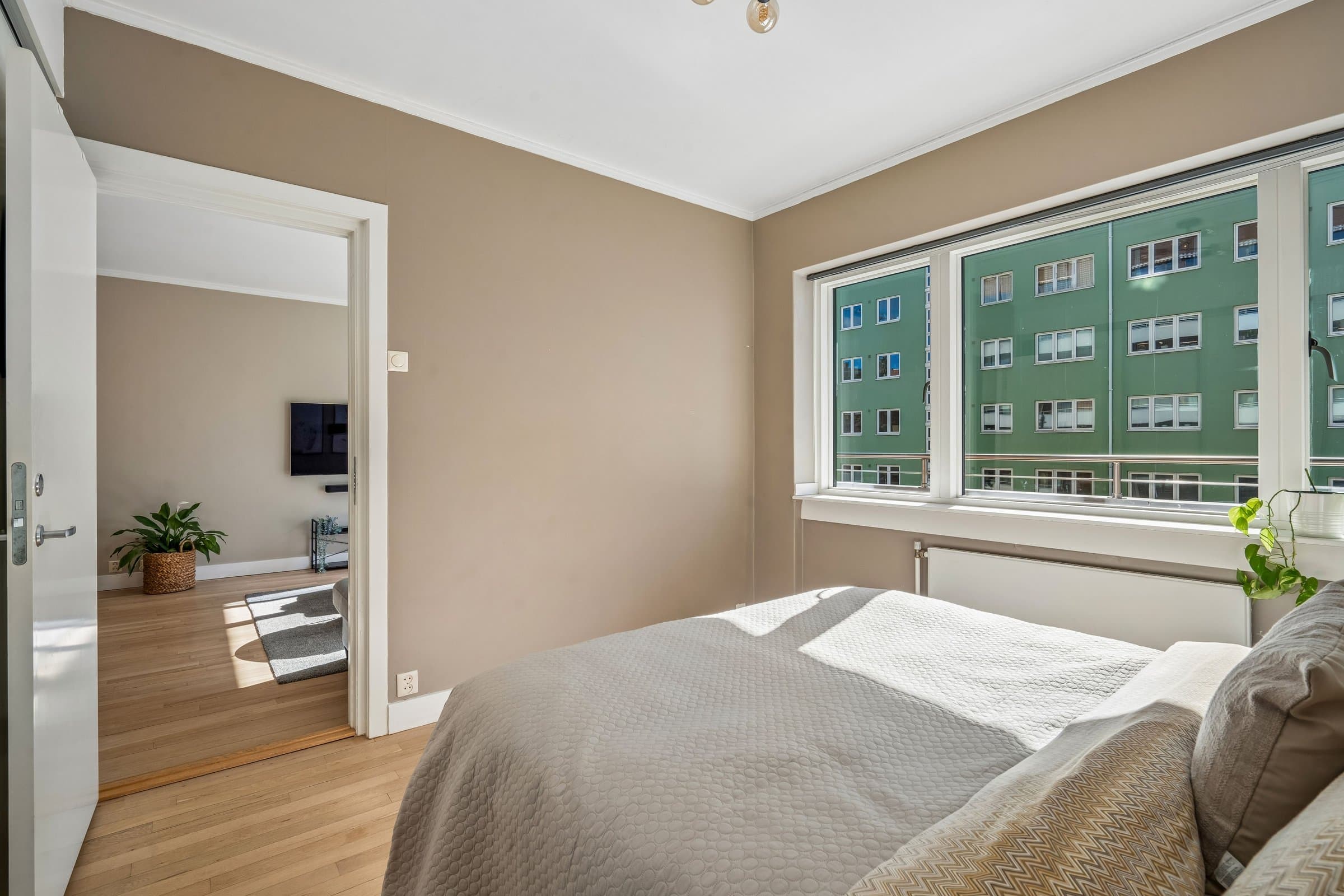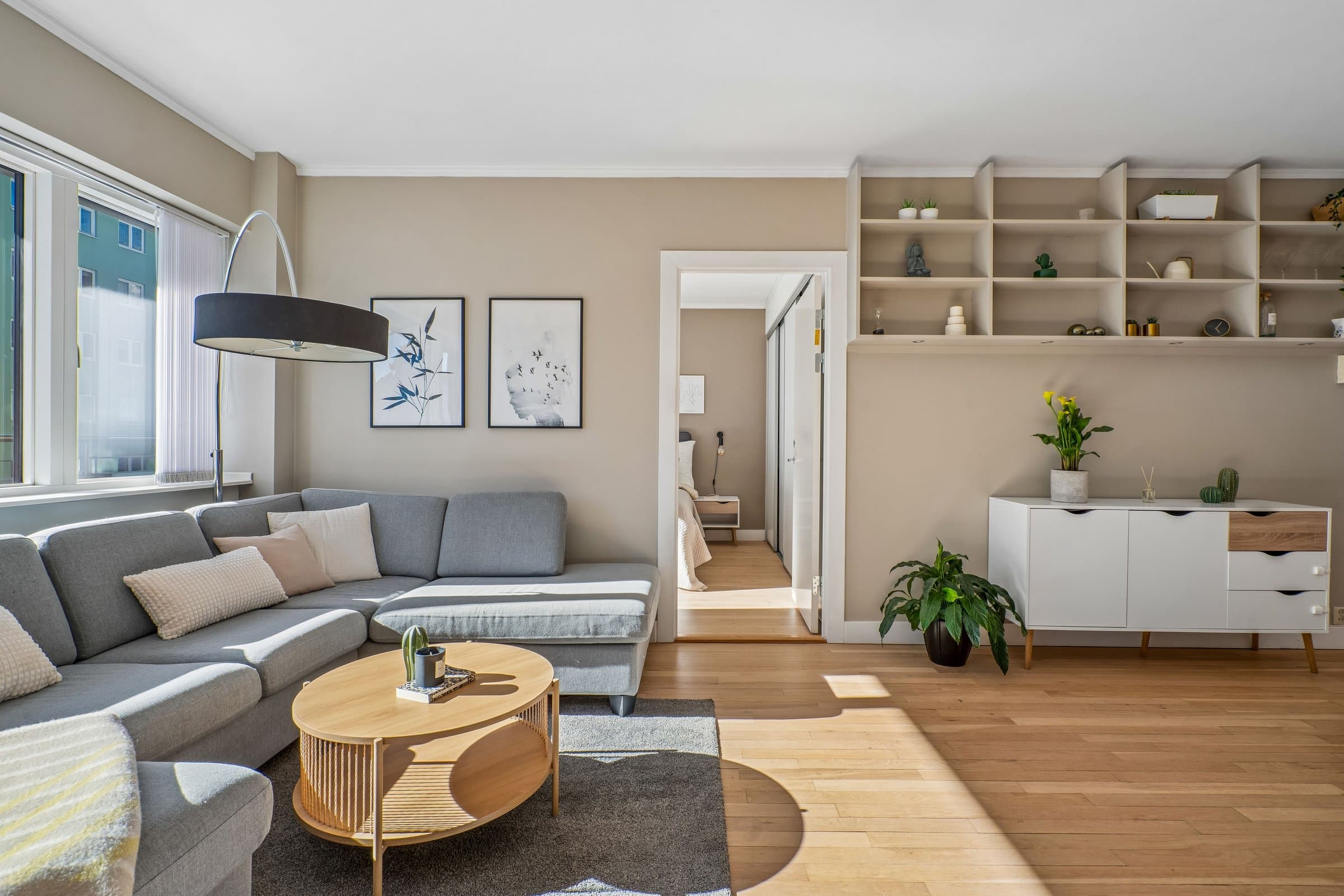 Leiligheten ligger i gårdens 3. etasje og inneholder: Entré, to soverom, bad/wc og delvis åpen kjøkken- og stueløsning. Stue har direkte utgang til balkong på 8m². Balkong: Solrik, sørvestvendt balkong på 8,1 m² direkte ut fra stue. Rekkverkhøyde på 116 cm. Balkongene ble modernisert i 2016 i regi av borettslaget. Varmekilder: Varmtvann og fjernvarme inkludert i felleskostnader. Varmekabler på bad. Åpen original peis i stue. Kjøkken: Pent, lyst kjøkken i praktisk delvis åpen løsning mot stuen. Kjøkkeninnredning med glatte folierte høyglans fronter. Heltre benkeplate og rustfritt beslag. Vegg med malte flater, samt flisvegg. Integrerte hvitevarer som platetopp, to gassbluss/plater, kjøleskap stekeovn og oppvaskmaskin. Frittstående kjøl- og fryseskap. Ventilator i stål med kullfilter. Det er godt med skap- og benkeplass på kjøkkenet. Downlights i himling. Felles varmtvannsbereder. Bad/wc: Pent, flislagt baderom. Badet ble pusset opp i regi av borettslaget i 2009. Badet er utstyrt med servant og speil, dusjhjørne med svingdører og dusjbatteri samt termostat. Veggmontert toalett. Opplegg for vaskemaskin, vannkran for vaskemaskin. Stikkontakt for vaskemaskin og tørketrommel. Flislagte gulv og vegger. Varmekabler i gulv. Downlights i himling. Overflater: Gulv: Originale tregulv som ble slipt og behandlet i 2017. Vegger: Malte flater og flis. Himling: Malte flater. Downlights i entré/gang og på bad/wc. Boder: Bod på 2,5 m², merket "26" og et skiskap i kjeller. Det er også felles sykkelbod i kjeller. Elektrisk: 40 amp hovedsikring, 4 fordelingskurser. Automatsikringer og jordfeilbryter.