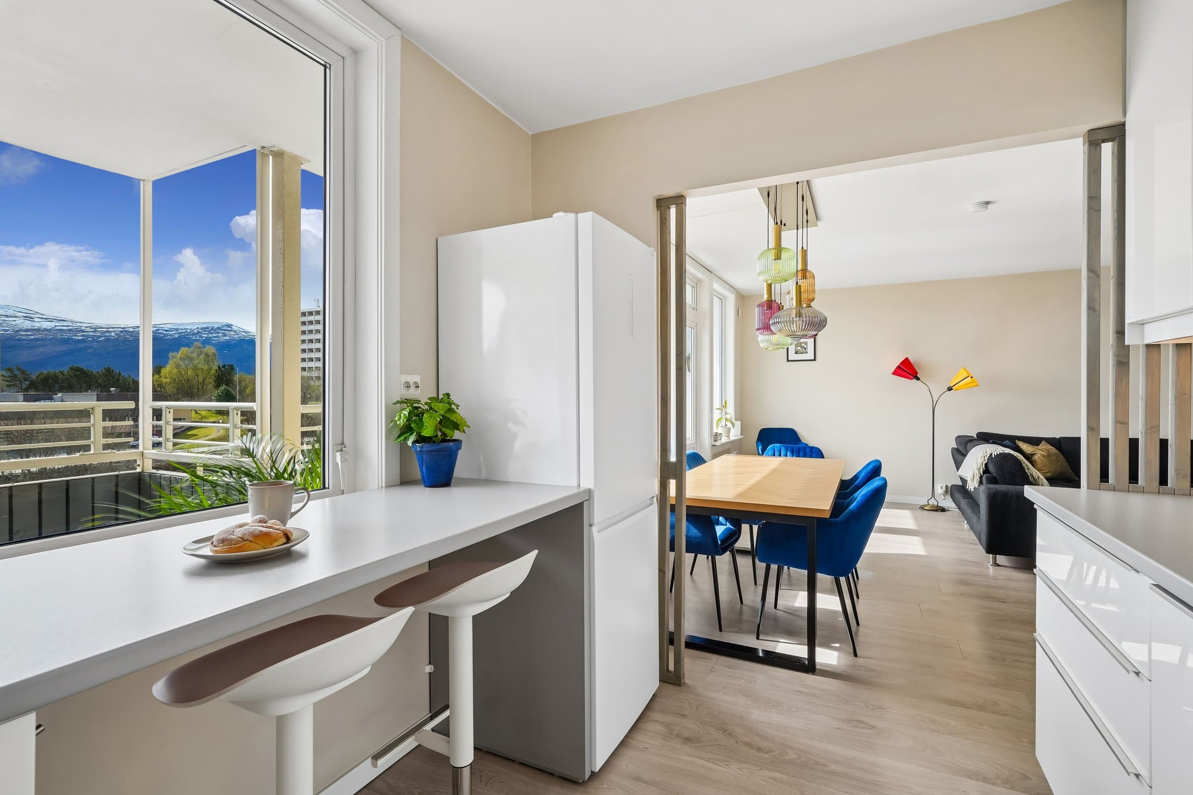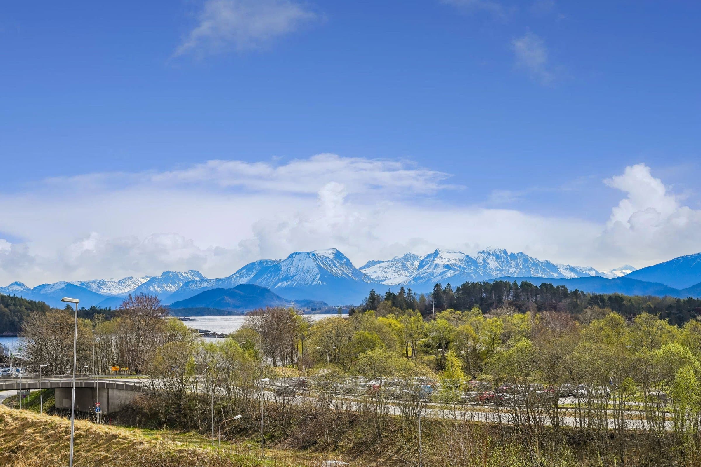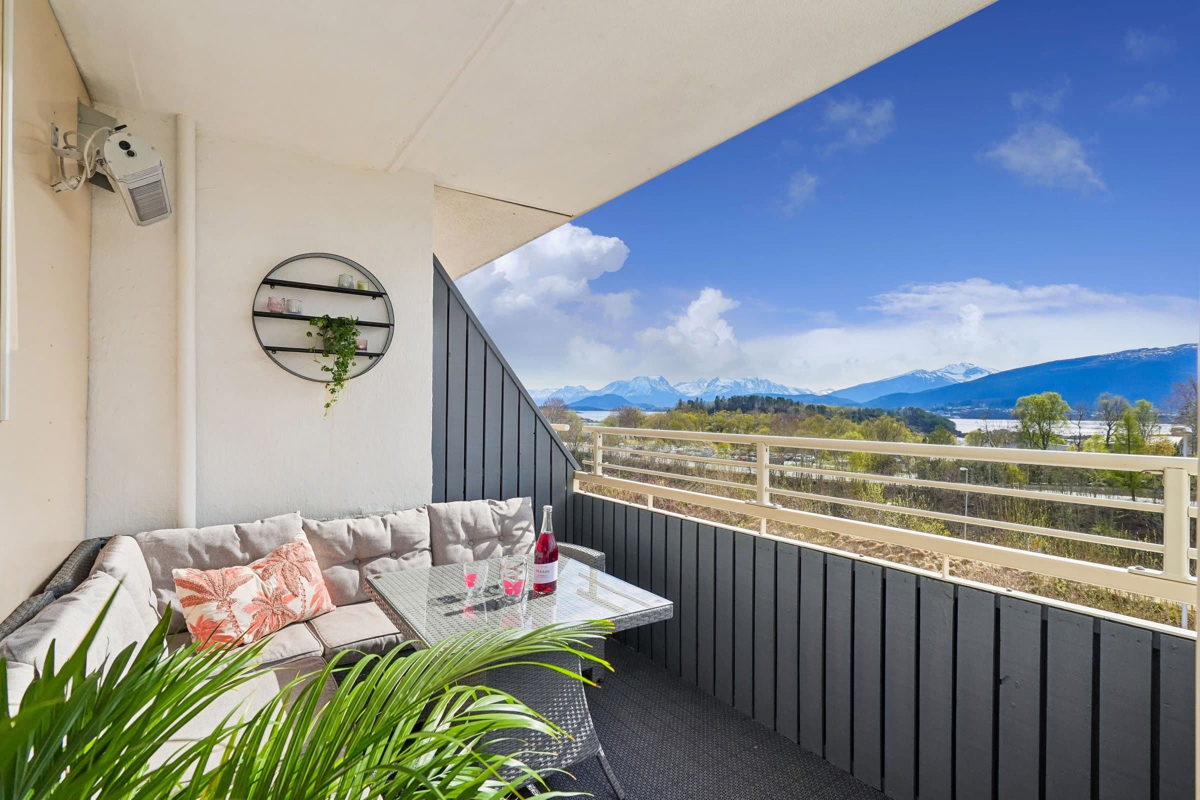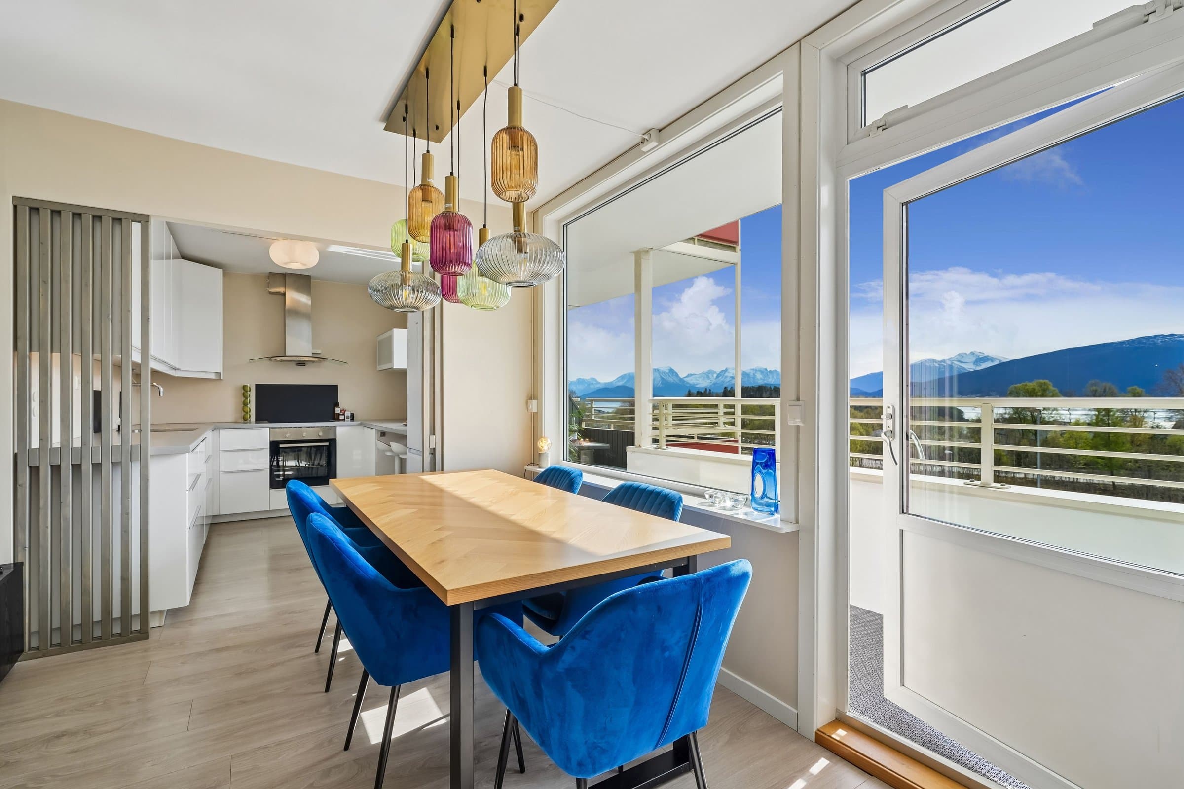 Meget sentral og romslig leilighet like ved Color Line Stadion og i gangavstand til sentrum, i veldrevet og godt vedlikeholdt borettslag. Rikelig med gratis gateparkering foran blokka, men også mulighet for å leie garasjeplass av borettslaget (etter ansienitet). Pipeløp gir mulighet for å sette inn peis/ovn. Beliggende i 3. etasje uten gjenboere har leiligheten flott utsikt over Borgundfjorden og innover mot Sunnmørsalpene, både fra kjøkkenet, gjennom stuevinduene og fra solrik, sydvendt veranda. Fra inngangspartiet på oppsiden er det kun én trapp opp til leiligheten. Tre egne boder pluss felles sykkelbod gir rikelig med lagringsplass. Leiligheten har to store soverom. I andre, tilsvarende leiligheter i borettslaget har beboerne delt ene soverommet i to med lettvegg, en fin mulighet hvis man har behov for det. Romslig bad fra 2016 har lekre fliser på gulv og vegger og innbydende badekar med dusjvegg. Vegghengt toalett, god belysning fra spotter i taket og selvsagt gulvvarme og opplegg for vaskemaskin og tørketrommel. Lys og luftig entré med god plass til å henge fra seg yttertøy og oppbevare sko, og med plass til kommoder. Porttelefon gjør det enkelt å åpne ytterdør i blokka for besøkende. God og moderne planløsning, stue med spisestue og kjøkken i en praktisk, delvis åpen løsning. Store vindusflater mot sør gir rikelig med naturlig lys. Kjøkkeninnredning med lyse fronter og benkeplate i laminat. Det er montert komfyrvakt og system for lekkasjesikring. Spiseplassene ved kjøkkenvinduet er det perfekte stedet å starte dagen med morgensol og kaffe. Stor veranda langs hele leilighetens frontfasade. God plass til sittegruppe i det lune hjørnet av verandaen, under terrassevarmen som både utvider «utesesongen» og forlenger de hyggelige og sosiale sommerkveldene med gode venner. Leiligheten ble totalfornyet i 2016 med nytt bad og kjøkken og nye overflater, og rør og el-anlegg fornyet. Felles avløpsrør i blokka fornyet i 2025.