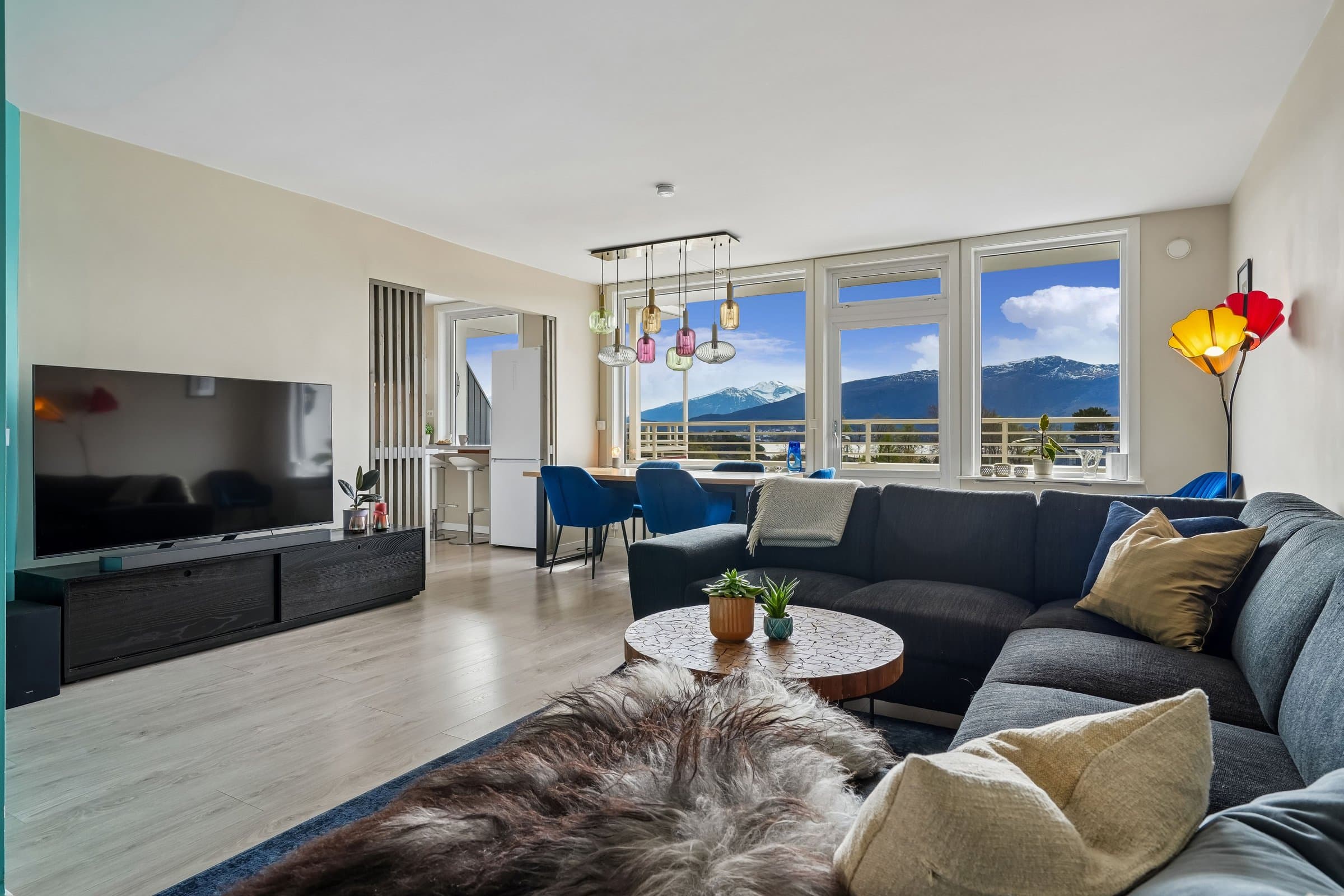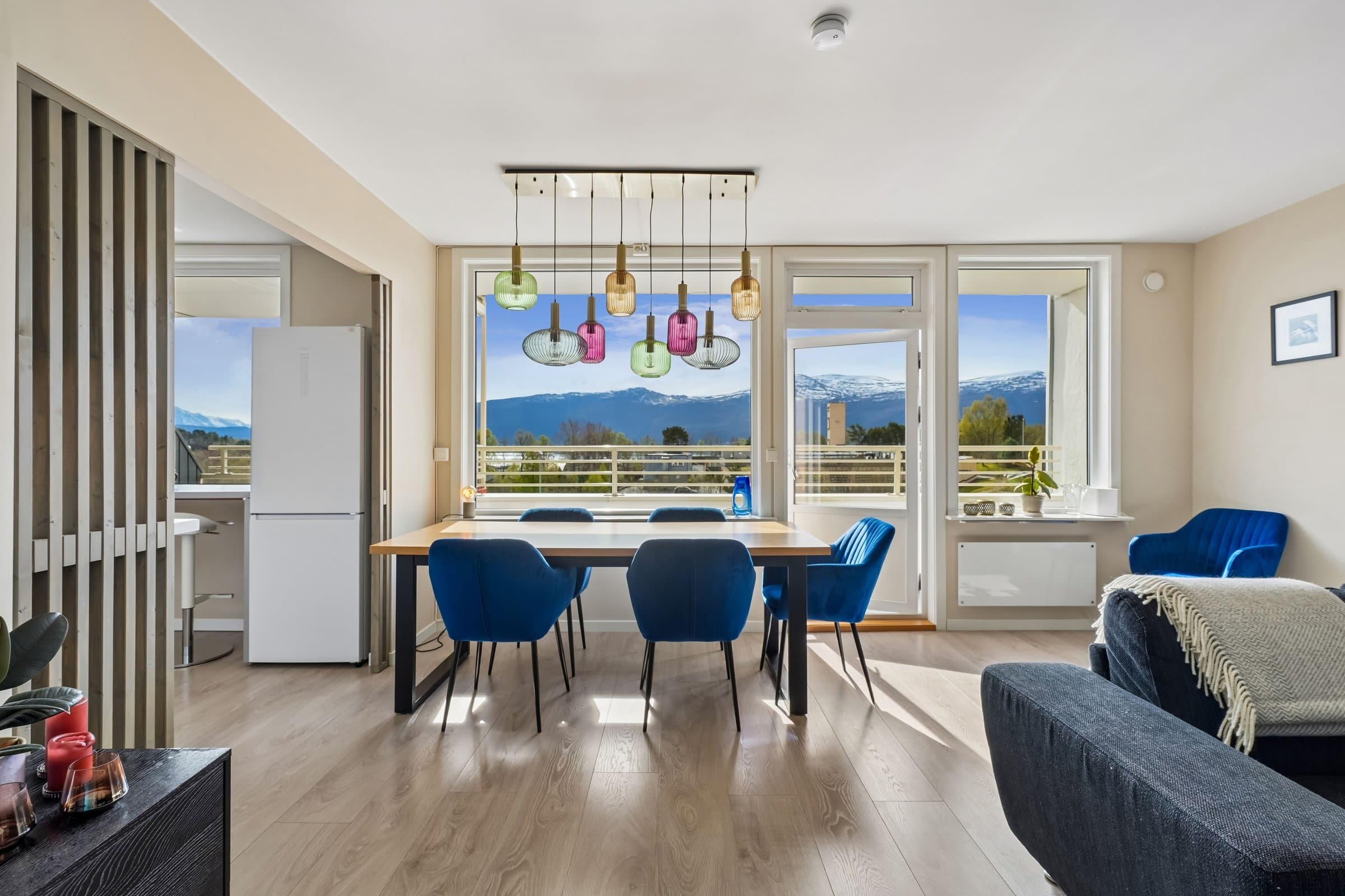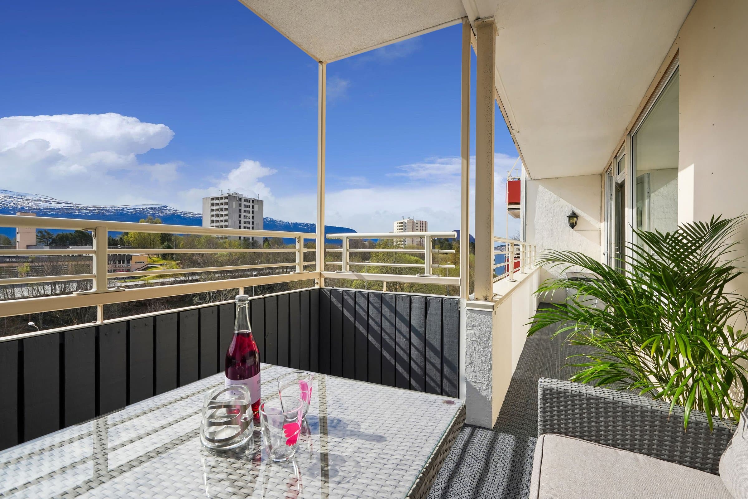 Meget sentral og romslig leilighet like ved Color Line Stadion og i gangavstand til sentrum, i veldrevet og godt vedlikeholdt borettslag. Rikelig med gratis gateparkering foran blokka, men også mulighet for å leie garasjeplass av borettslaget (etter ansienitet). Pipeløp gir mulighet for å sette inn peis/ovn. Beliggende i 3. etasje uten gjenboere har leiligheten flott utsikt over Borgundfjorden og innover mot Sunnmørsalpene, både fra kjøkkenet, gjennom stuevinduene og fra solrik, sydvendt veranda. Fra inngangspartiet på oppsiden er det kun én trapp opp til leiligheten. Tre egne boder pluss felles sykkelbod gir rikelig med lagringsplass. Leiligheten har to store soverom. I andre, tilsvarende leiligheter i borettslaget har beboerne delt ene soverommet i to med lettvegg, en fin mulighet hvis man har behov for det. Romslig bad fra 2016 har lekre fliser på gulv og vegger og innbydende badekar med dusjvegg. Vegghengt toalett, god belysning fra spotter i taket og selvsagt gulvvarme og opplegg for vaskemaskin og tørketrommel. Lys og luftig entré med god plass til å henge fra seg yttertøy og oppbevare sko, og med plass til kommoder. Porttelefon gjør det enkelt å åpne ytterdør i blokka for besøkende. God og moderne planløsning, stue med spisestue og kjøkken i en praktisk, delvis åpen løsning. Store vindusflater mot sør gir rikelig med naturlig lys. Kjøkkeninnredning med lyse fronter og benkeplate i laminat. Det er montert komfyrvakt og system for lekkasjesikring. Spiseplassene ved kjøkkenvinduet er det perfekte stedet å starte dagen med morgensol og kaffe. Stor veranda langs hele leilighetens frontfasade. God plass til sittegruppe i det lune hjørnet av verandaen, under terrassevarmen som både utvider «utesesongen» og forlenger de hyggelige og sosiale sommerkveldene med gode venner. Leiligheten ble totalfornyet i 2016 med nytt bad og kjøkken og nye overflater, og rør og el-anlegg fornyet. Felles avløpsrør i blokka fornyet i 2025.