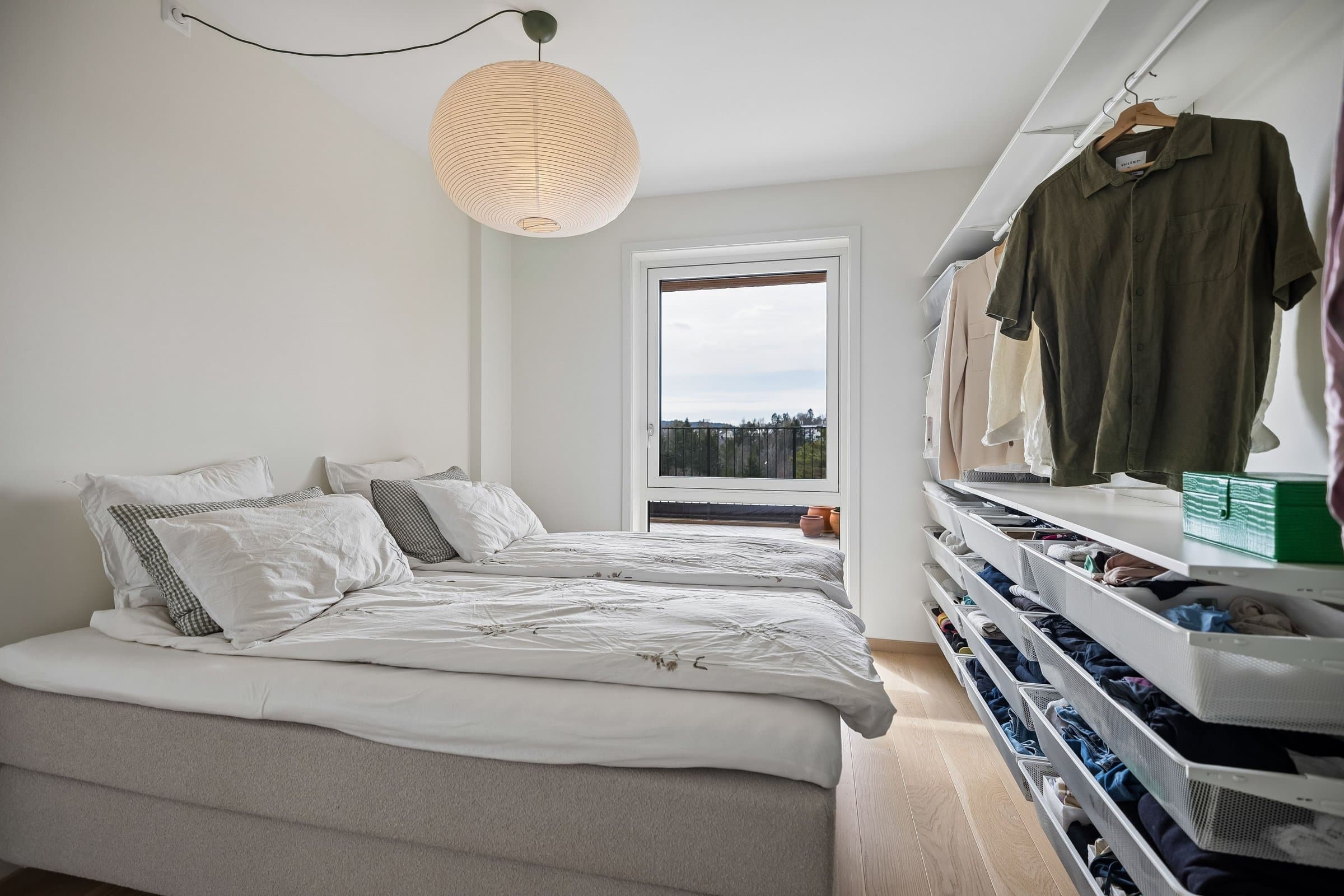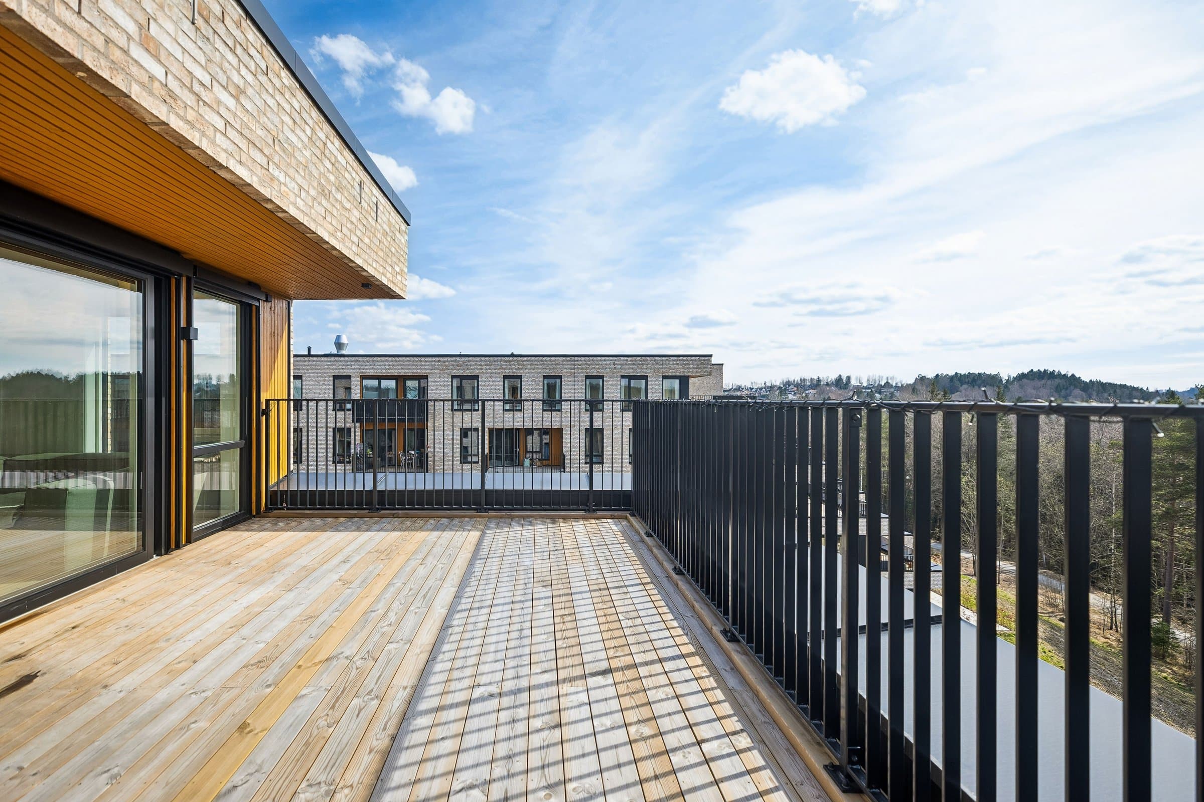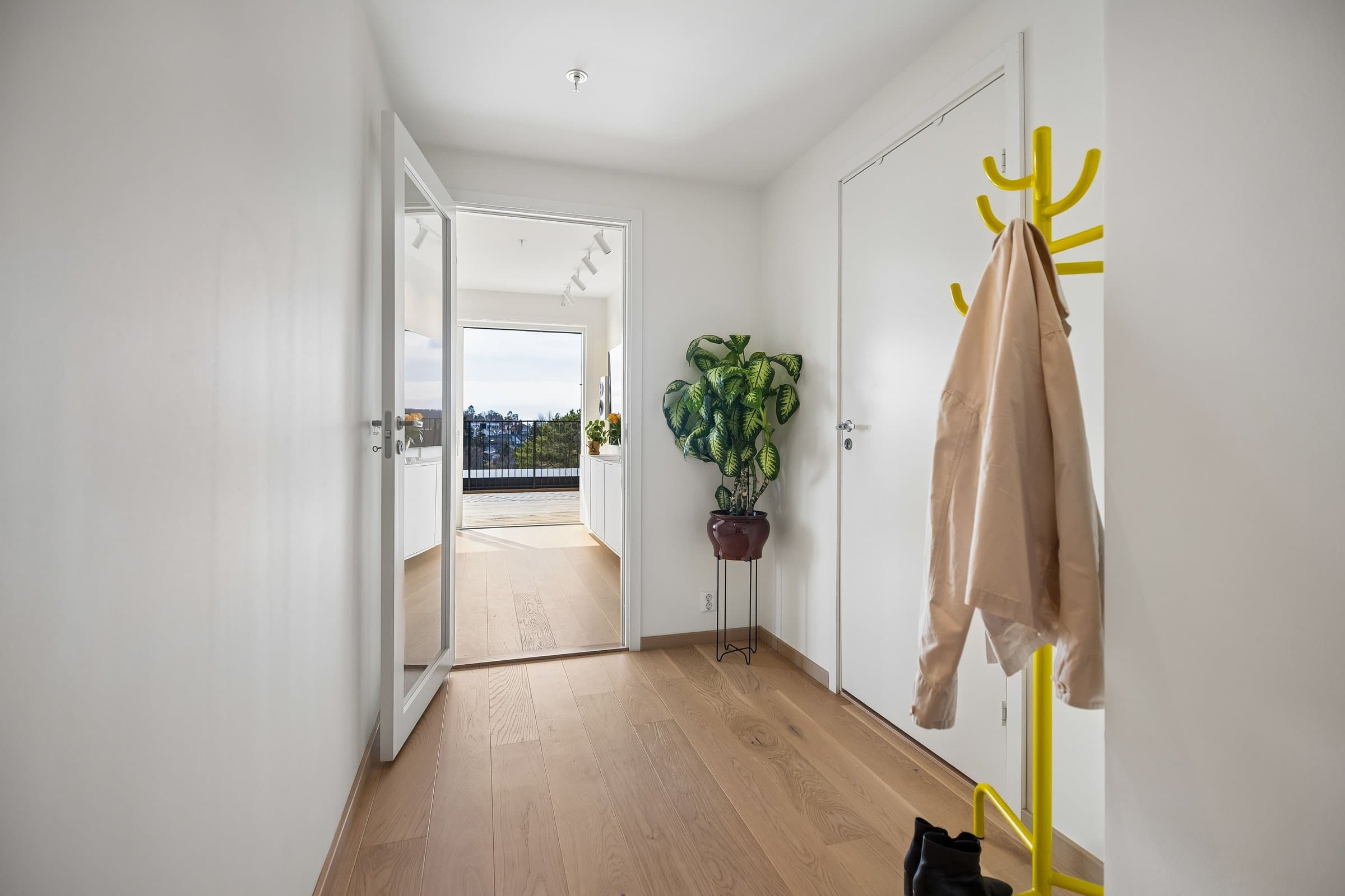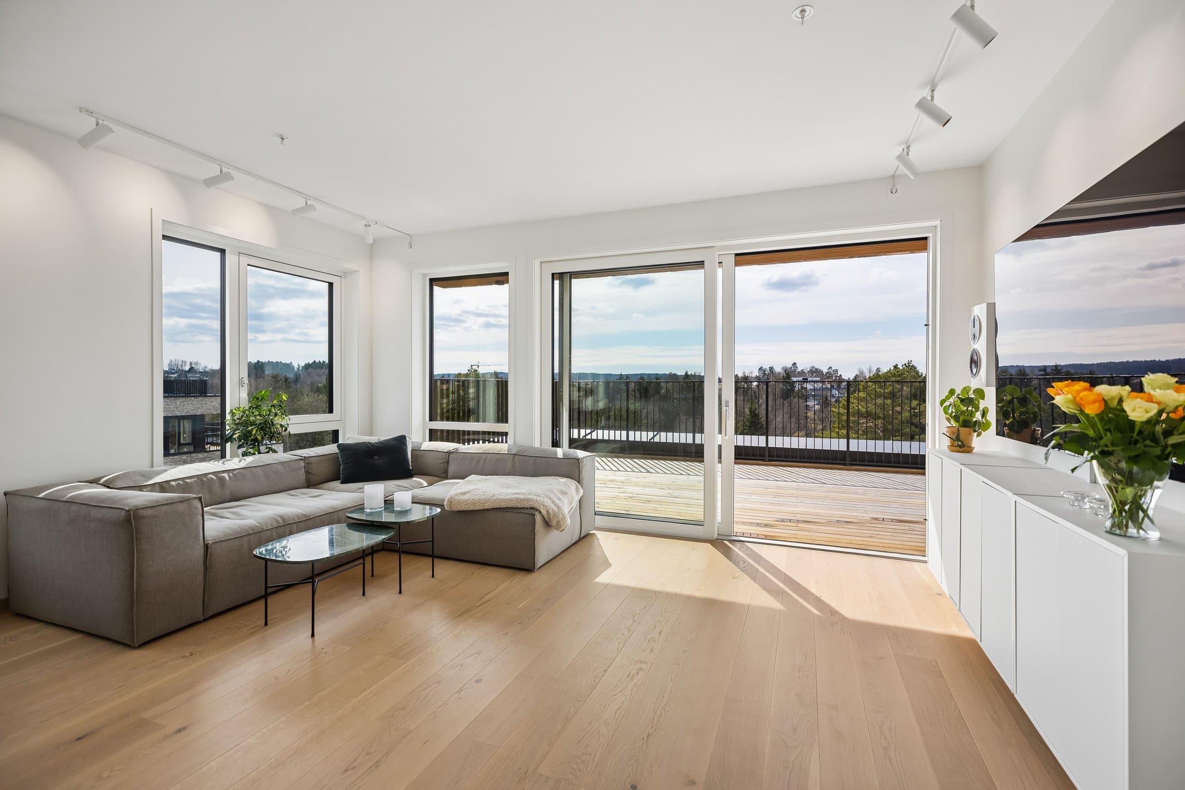 Velkommen til en eksklusiv toppleilighet med privat atmosfære, moderne eleganse og høy standard. Boligen er av nyere dato og fremstår som tilnærmet ny, med gjeldende 5 års reklamasjonsrett – en ekstra trygghet for kjøper. Leiligheten er påkostet med nøye utvalgte materialer og eksklusive detaljer. Kjøkken og bad holder høy standard, med stilrene løsninger og fokus på funksjon og estetikk. Store vindusflater gir rikelig med naturlig lys og en luftig romfølelse, mens den åpne planløsningen skaper god flyt mellom oppholdsrommene. Boligen har utvendige screens på alle vinduer, som gir skjerming for innsyn, regulering av lys og gode forhold for film og avslapning – også på dagtid. Dette bidrar til redusert varmeinnsplipp på sommeren. Et av boligens store høydepunkter er den vestvendte terrassen på hele 31 kvm – perfekt for solrike ettermiddager, sene sommerkvelder og hyggelige sammenkomster. Det medfølger romslig garasjeplass i lukket anlegg med elbillader. Beliggenheten er svært praktisk med kun ca. 5 minutters gange til togstasjon, som gir enkel pendling og nærhet til byen. Høydepunkter: Toppetasje med privat beliggenhet Vestvendt terrasse på 31 kvm Påkostet kjøkken, bad og elektroinstallasjon Nyere bolig med 5 års reklamasjonsrett Store vindusflater og godt lysinnslipp Utvendige screens på alle vinduer Garasjeplass med elbillader Ca. 5 min gange til togstasjon