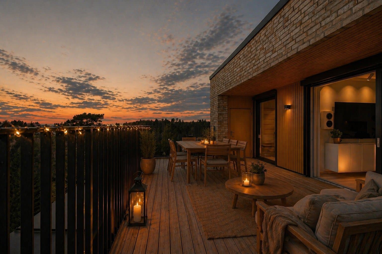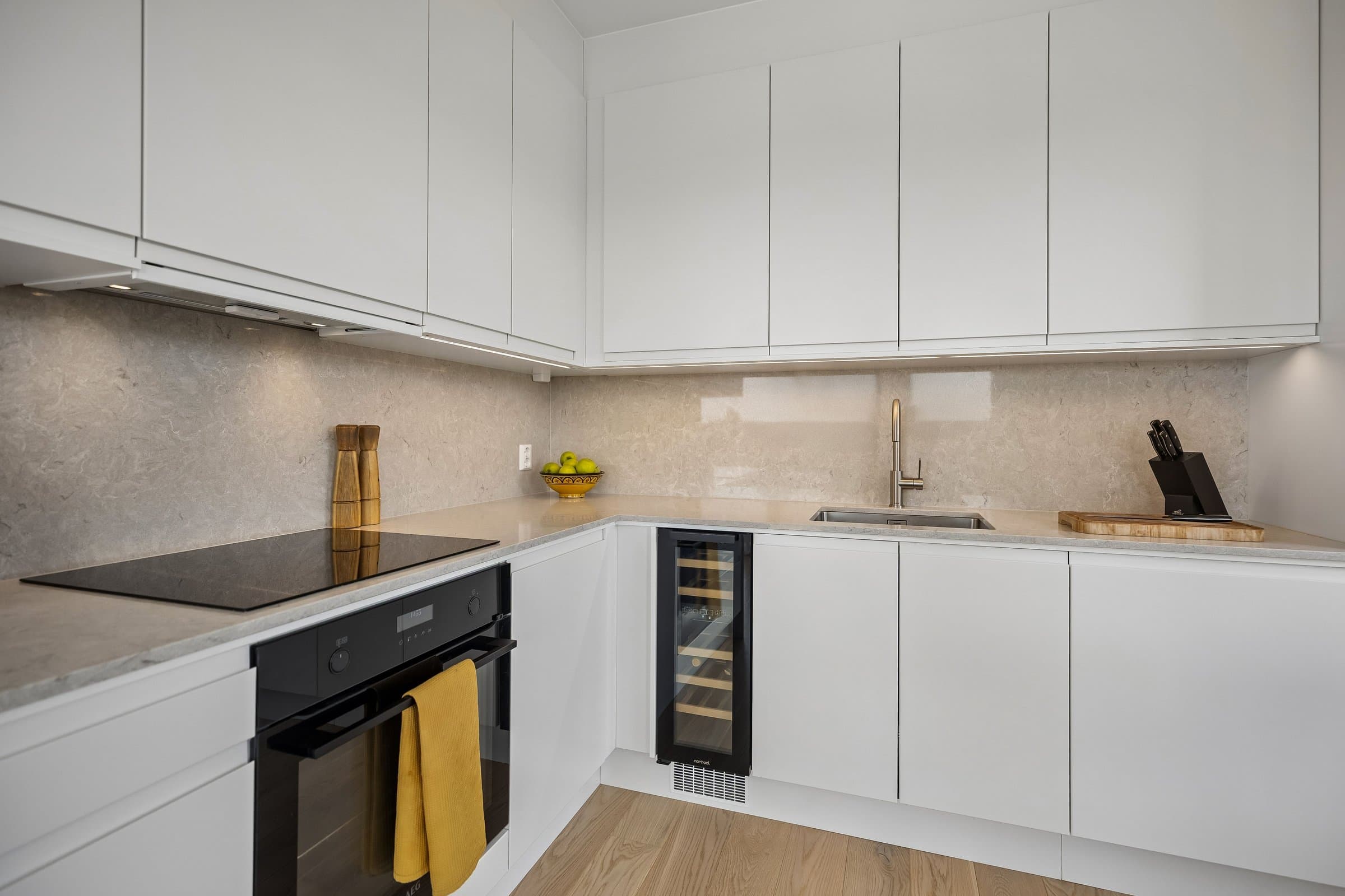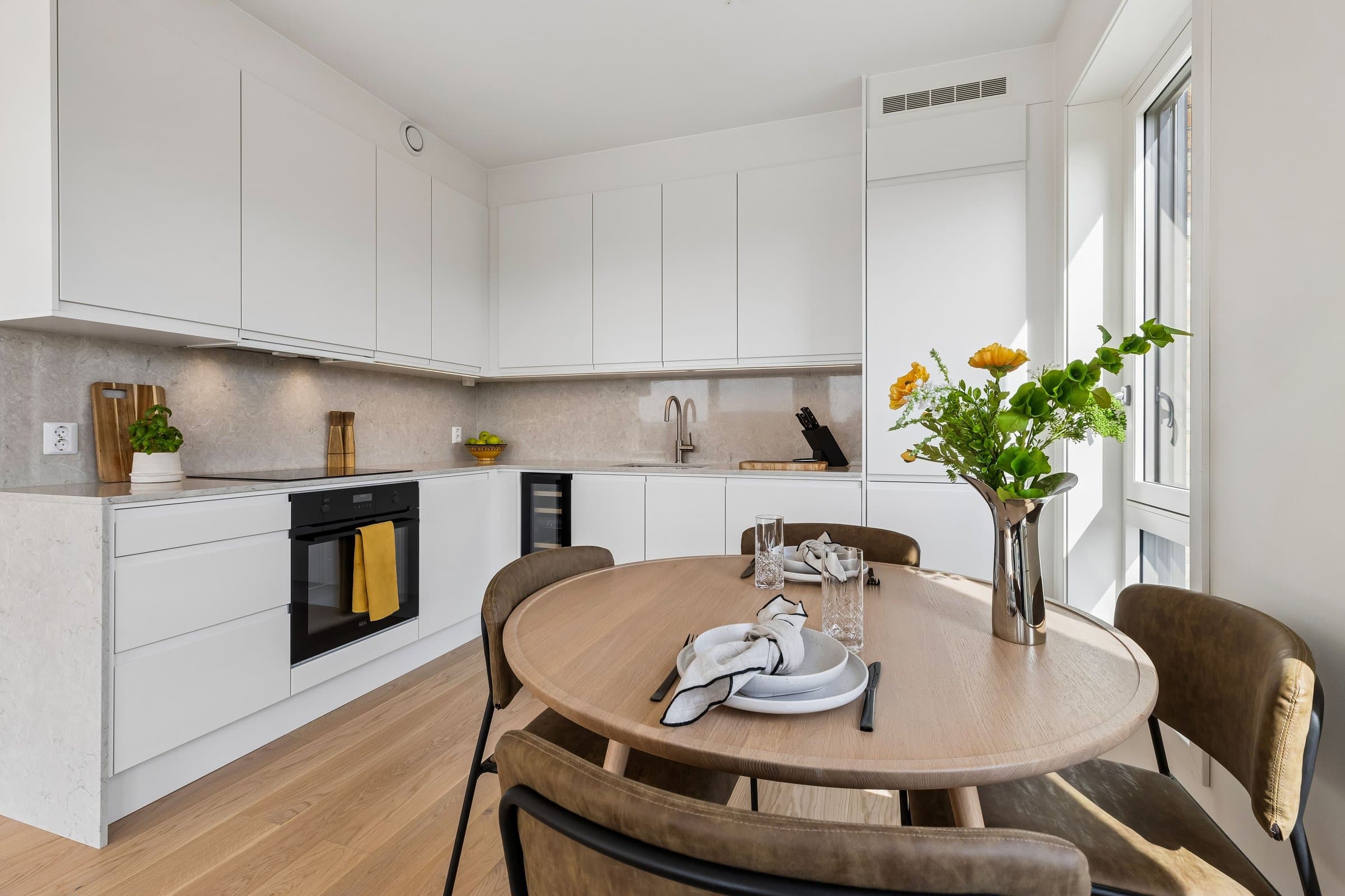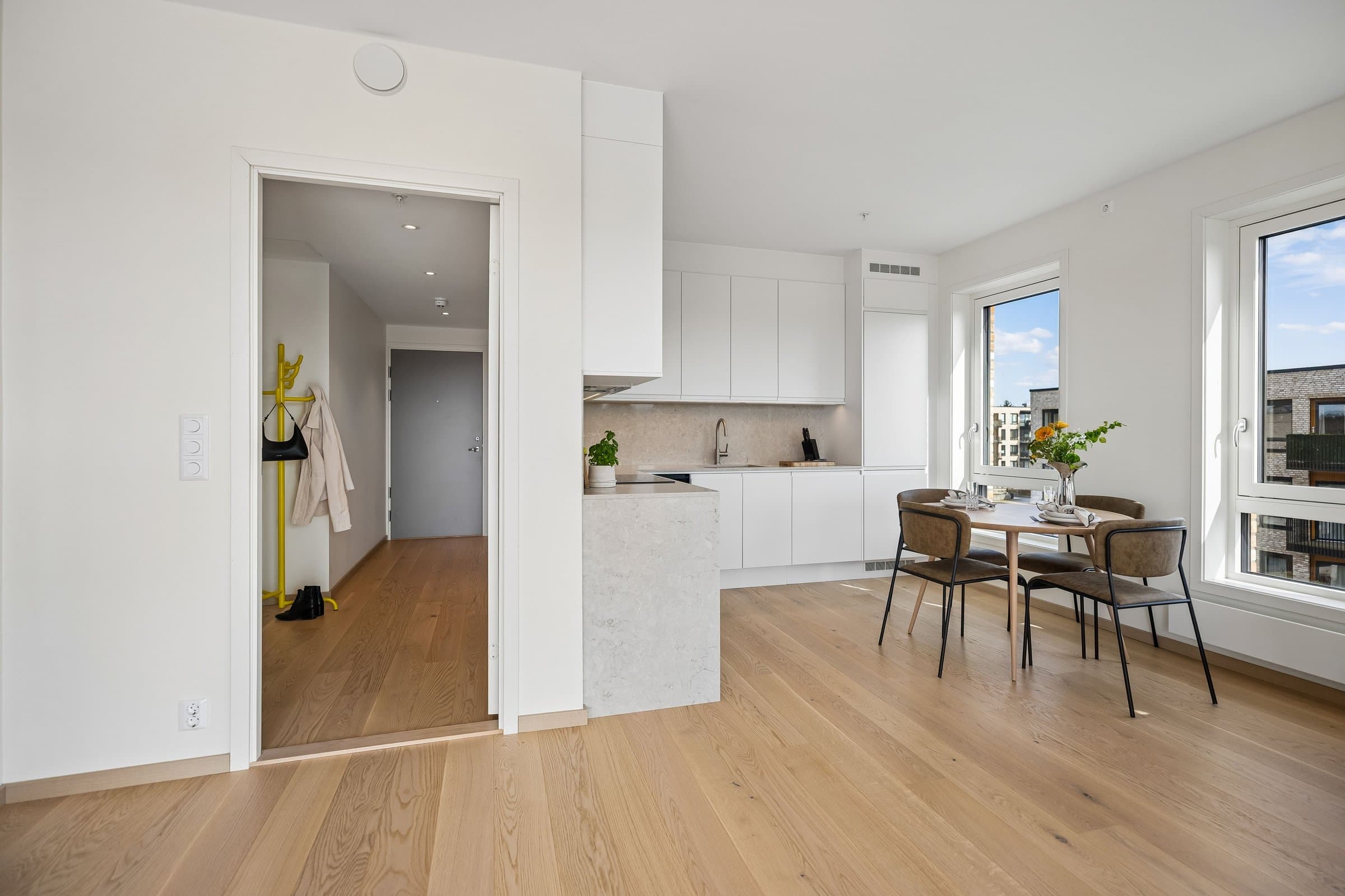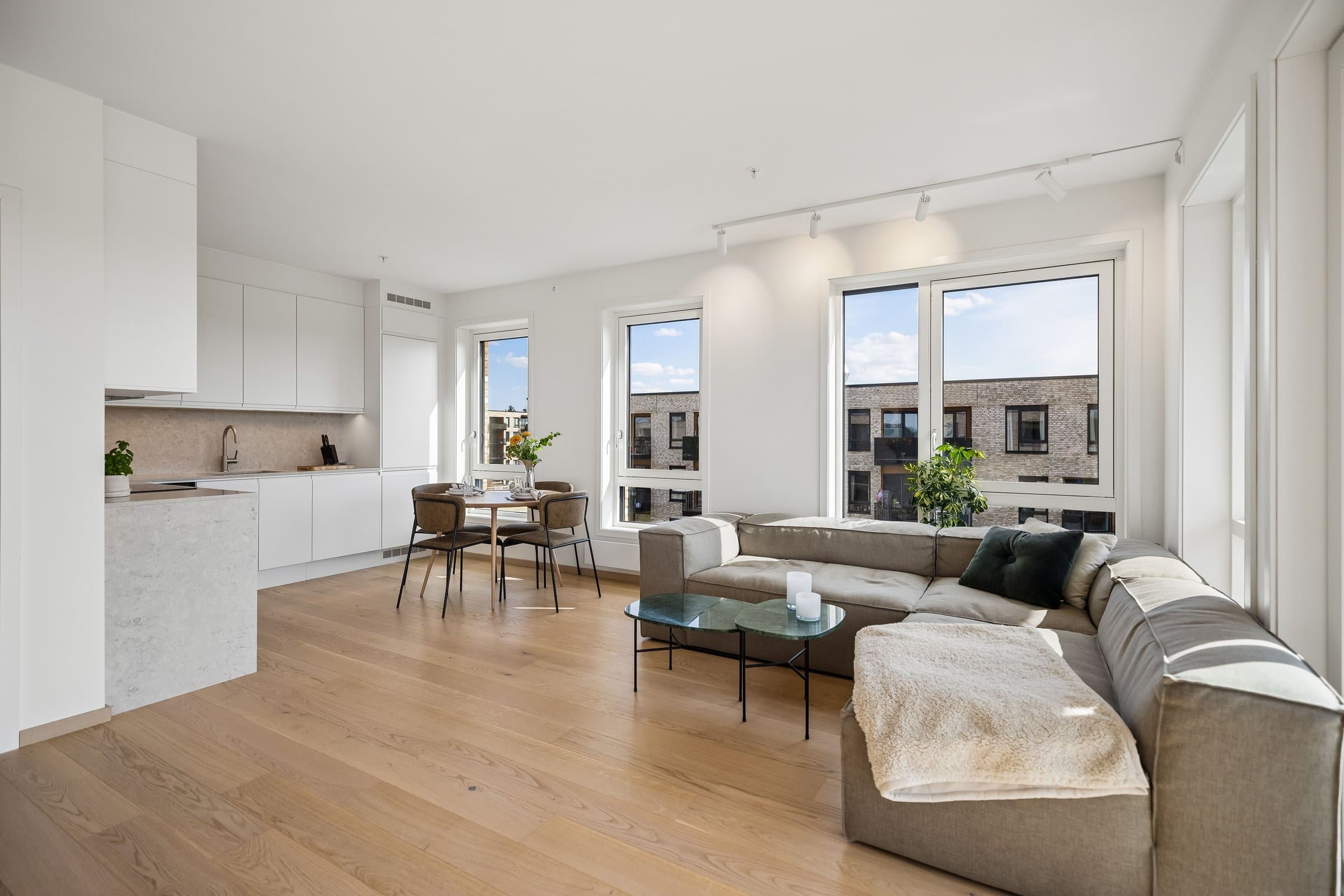 Velkommen til en eksklusiv toppleilighet med privat atmosfære, moderne eleganse og høy standard. Boligen er av nyere dato og fremstår som tilnærmet ny, med gjeldende 5 års reklamasjonsrett – en ekstra trygghet for kjøper. Leiligheten er påkostet med nøye utvalgte materialer og eksklusive detaljer. Kjøkken og bad holder høy standard, med stilrene løsninger og fokus på funksjon og estetikk. Store vindusflater gir rikelig med naturlig lys og en luftig romfølelse, mens den åpne planløsningen skaper god flyt mellom oppholdsrommene. Boligen har utvendige screens på alle vinduer, som gir skjerming for innsyn, regulering av lys og gode forhold for film og avslapning – også på dagtid. Dette bidrar til redusert varmeinnsplipp på sommeren. Et av boligens store høydepunkter er den vestvendte terrassen på hele 31 kvm – perfekt for solrike ettermiddager, sene sommerkvelder og hyggelige sammenkomster. Det medfølger romslig garasjeplass i lukket anlegg med elbillader. Beliggenheten er svært praktisk med kun ca. 5 minutters gange til togstasjon, som gir enkel pendling og nærhet til byen. Høydepunkter: Toppetasje med privat beliggenhet Vestvendt terrasse på 31 kvm Påkostet kjøkken, bad og elektroinstallasjon Nyere bolig med 5 års reklamasjonsrett Store vindusflater og godt lysinnslipp Utvendige screens på alle vinduer Garasjeplass med elbillader Ca. 5 min gange til togstasjon