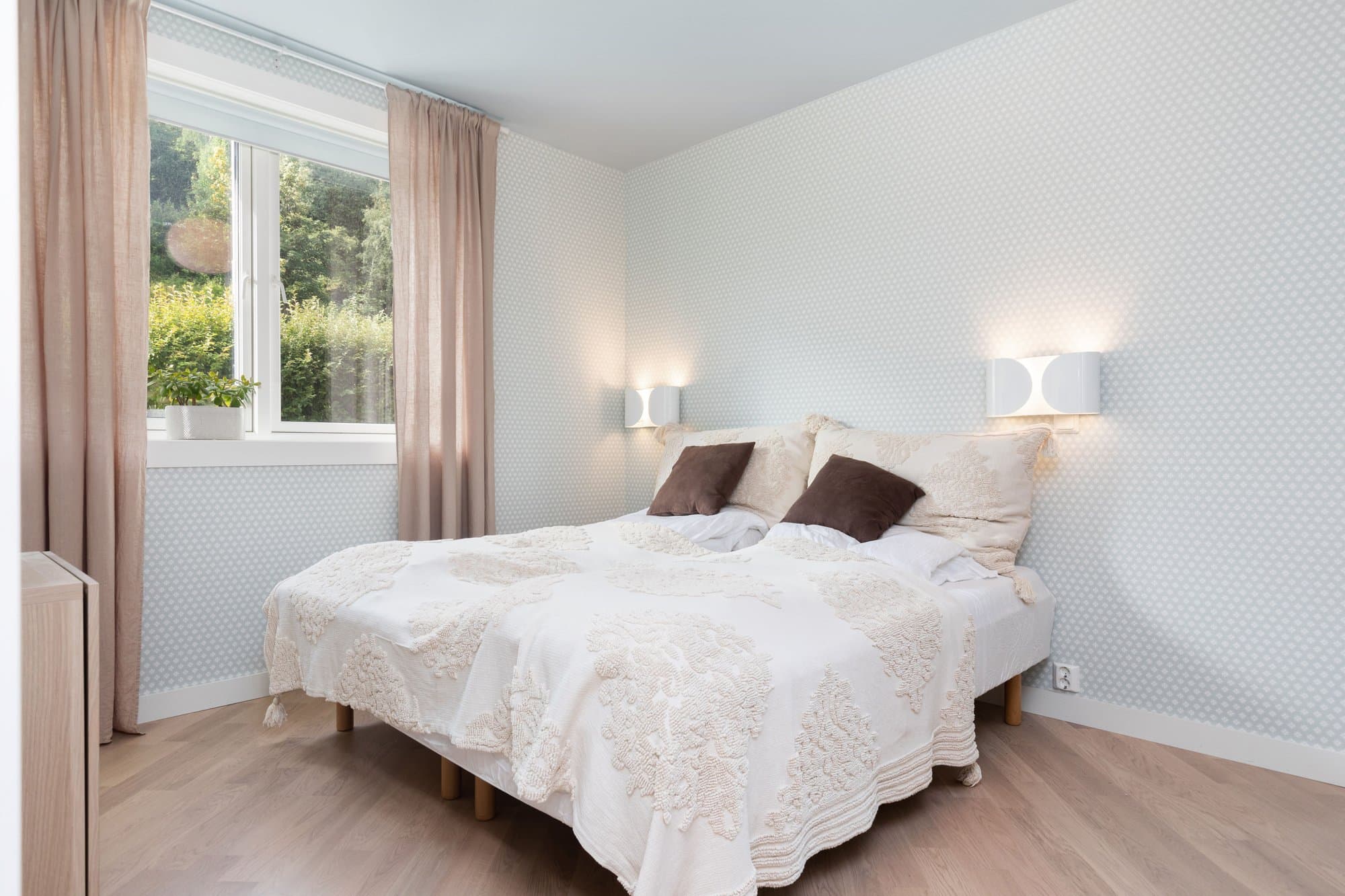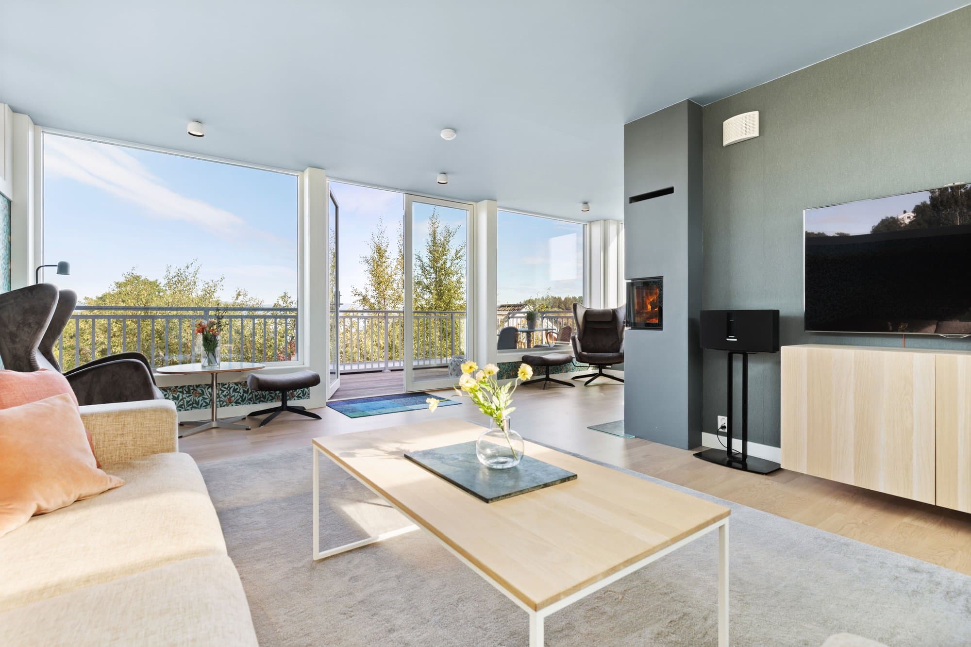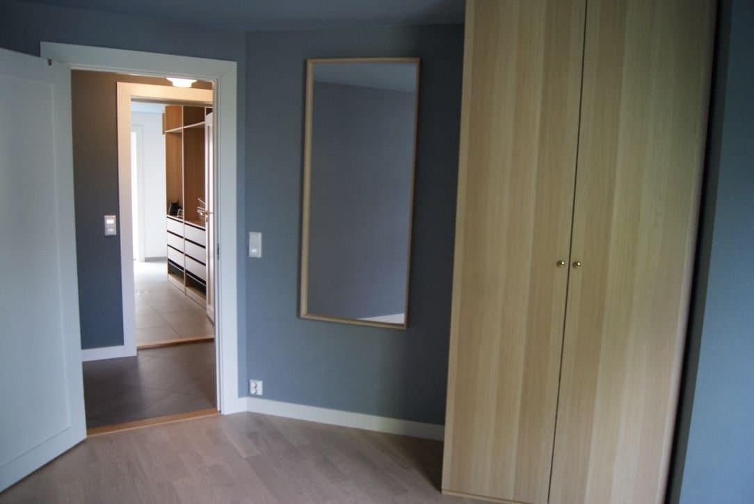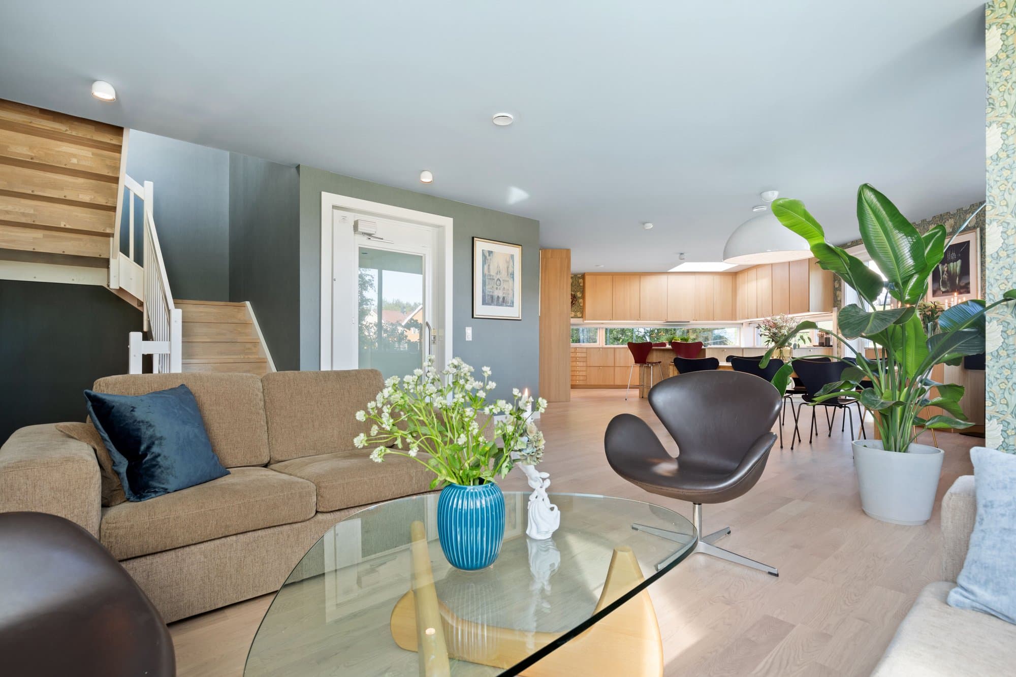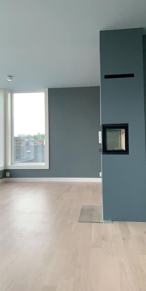 1. Etasje: Takhøyde 2,4m Hall: Flislagt med elektiske varmekabler i gulvet. Tapet på vegger og malt himling. 2 stk. soverom: Med parkett og elektiske varmekabler, tapet på vegg og malt himling. 1 stk kontor/soverom: Flislagt med elektiske varmekabler. Bad: Flislagt med elektiske varmekabler i gulvet. Massagebad, frittstående dusj, håndklevarmer, vegghengt toalett og enkel servant med eikinnredning. Veggene er flislagt. Massagebad er innebygd og flislagt. Vaskerom: Flislagt med elektiske varmekabler i gulvet, gips med malt overflate på vegg og i tak. Tekniskrom/bod: Gulvbelegg på gulv, malt gips på vegg og i tak. Bod under trapp: Parkett på gulv, malt gips på vegg og tak. 2. Etasje: Takhøyde 2,55m Kjøkken/stue (allrom): 2-stavs hvitkalket lakkert eikeparkett med elektrisk varme. Vegger tapet, malt himling. Kjøkken i eik (IKEA), benkeplate i matt sandfarget marmor. Hovedsoverom: 2-stavs hvitkalket lakkert eikeparkett med elektrisk varme. Vegger tapet, malt himling. Bad: Flislagt med elektiske varmekabler i gulvet. Flis på vegg og malt himling. Oppbygd benk med glassmosaikk. Vegghengt toalett, dobbel servant med eikeinnredning. WIC: Parkett med elektiske varmekabler, tapet på vegg og malt himling. Eikeinnredning (IKEA). 3. Etasje: Takhøyde 2,40m Stue/utgang: 2-stavs hvitkalket lakkert eikeparkett. Vegger tapet, malt himling. Peis, merke Norpeis (Praha), ubrukt. Utgang til stor terrasse med retning øst, sør og vest. Det er stort sett belysning fra Flos i hele boligen (pendel "sky-garden" over spisebord følger ikke med).