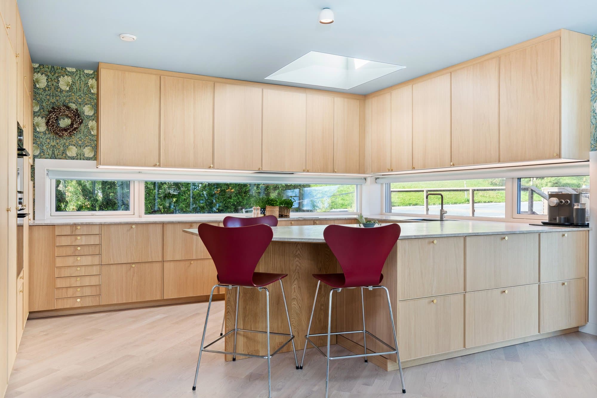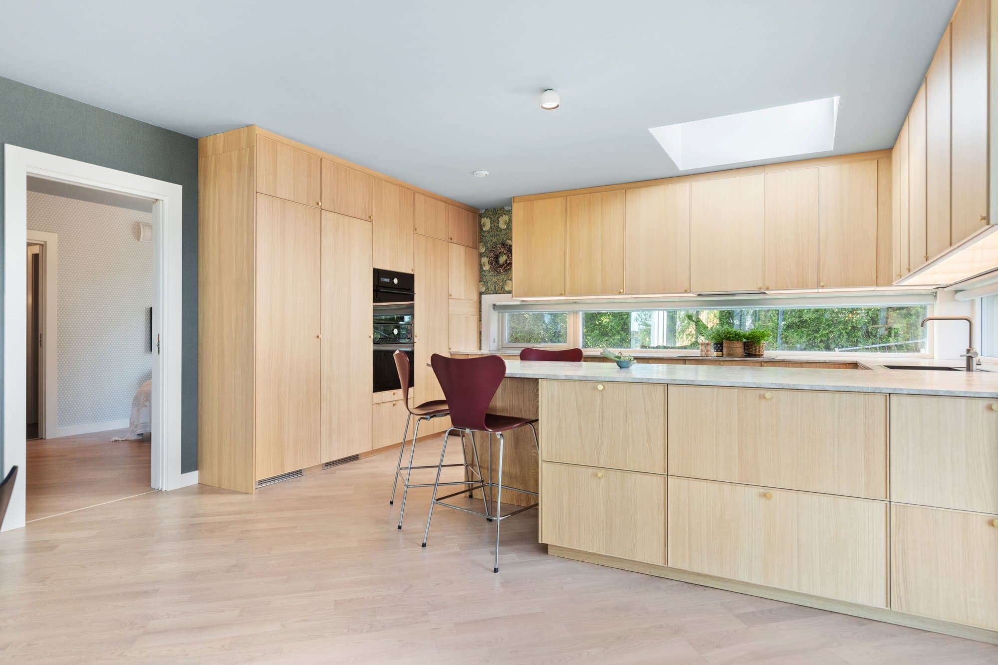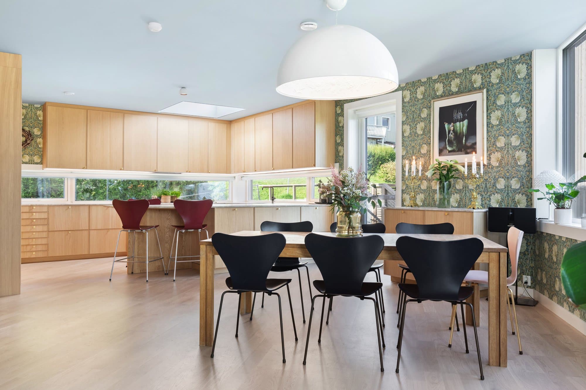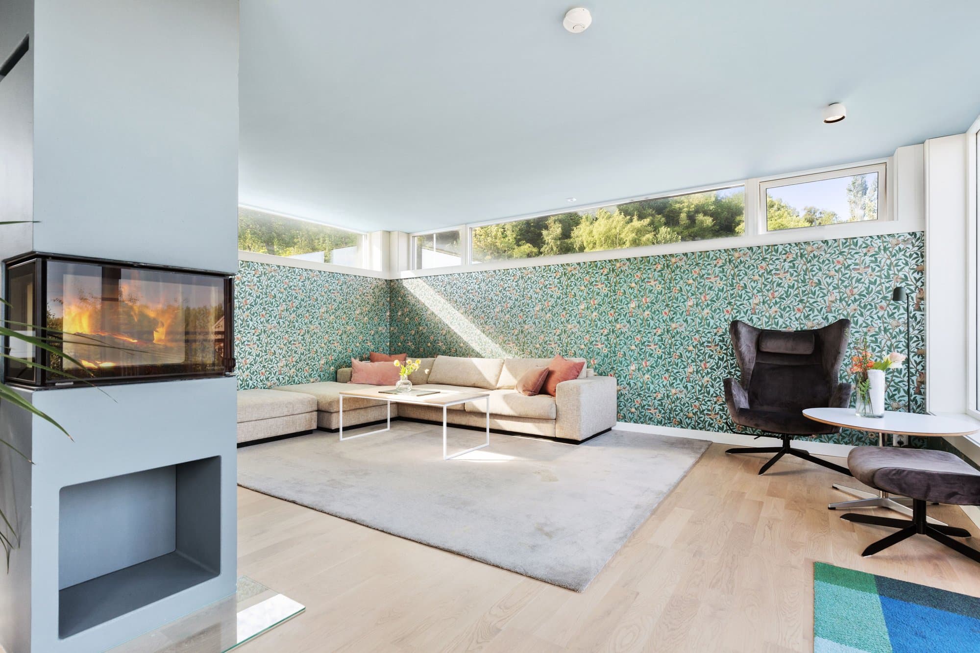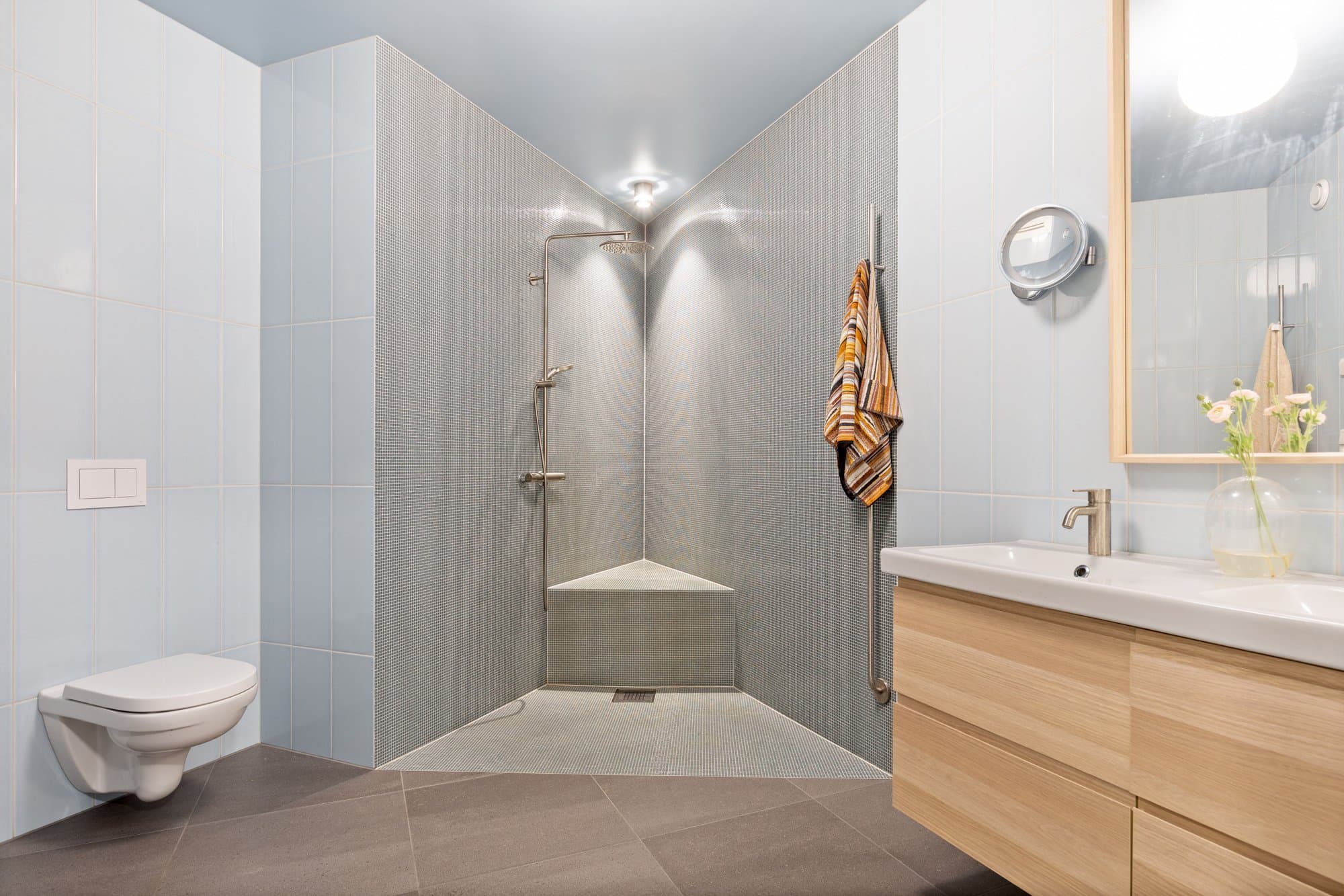 1. Etasje: Takhøyde 2,4m Hall: Flislagt med elektiske varmekabler i gulvet. Tapet på vegger og malt himling. 2 stk. soverom: Med parkett og elektiske varmekabler, tapet på vegg og malt himling. 1 stk kontor/soverom: Flislagt med elektiske varmekabler. Bad: Flislagt med elektiske varmekabler i gulvet. Massagebad, frittstående dusj, håndklevarmer, vegghengt toalett og enkel servant med eikinnredning. Veggene er flislagt. Massagebad er innebygd og flislagt. Vaskerom: Flislagt med elektiske varmekabler i gulvet, gips med malt overflate på vegg og i tak. Tekniskrom/bod: Gulvbelegg på gulv, malt gips på vegg og i tak. Bod under trapp: Parkett på gulv, malt gips på vegg og tak. 2. Etasje: Takhøyde 2,55m Kjøkken/stue (allrom): 2-stavs hvitkalket lakkert eikeparkett med elektrisk varme. Vegger tapet, malt himling. Kjøkken i eik (IKEA), benkeplate i matt sandfarget marmor. Hovedsoverom: 2-stavs hvitkalket lakkert eikeparkett med elektrisk varme. Vegger tapet, malt himling. Bad: Flislagt med elektiske varmekabler i gulvet. Flis på vegg og malt himling. Oppbygd benk med glassmosaikk. Vegghengt toalett, dobbel servant med eikeinnredning. WIC: Parkett med elektiske varmekabler, tapet på vegg og malt himling. Eikeinnredning (IKEA). 3. Etasje: Takhøyde 2,40m Stue/utgang: 2-stavs hvitkalket lakkert eikeparkett. Vegger tapet, malt himling. Peis, merke Norpeis (Praha), ubrukt. Utgang til stor terrasse med retning øst, sør og vest. Det er stort sett belysning fra Flos i hele boligen (pendel "sky-garden" over spisebord følger ikke med).