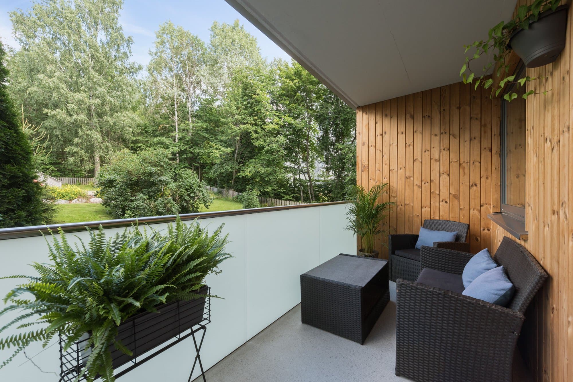Flott og lys 3-roms leilighet med stor balkong på 12 kvm mot grønt område. Bad fra 2018. Garasjeplass.